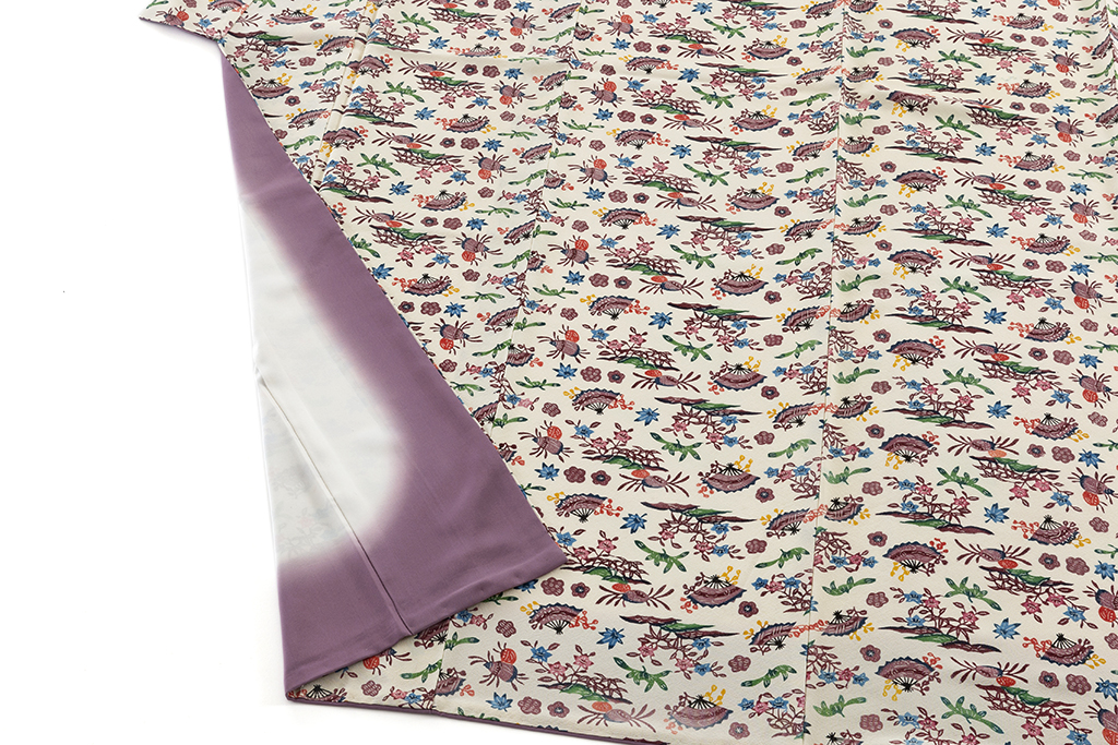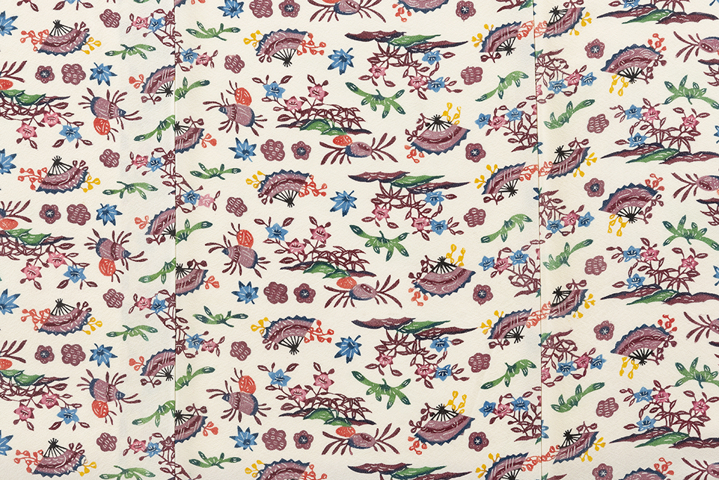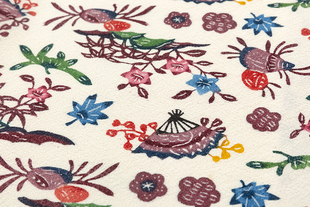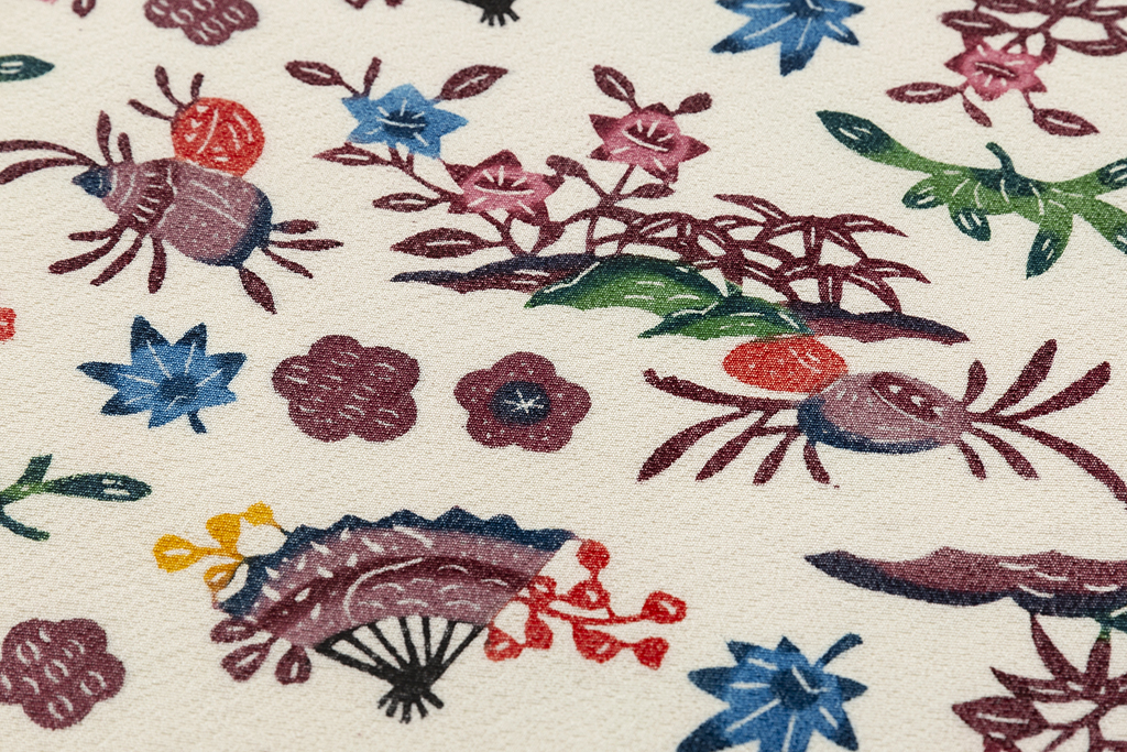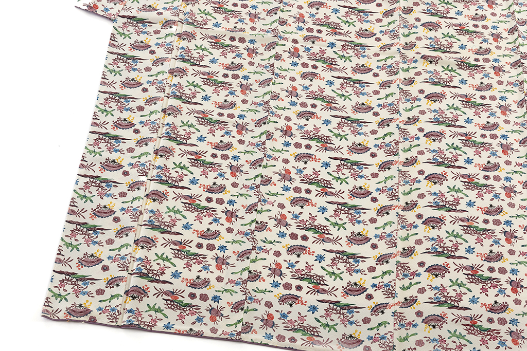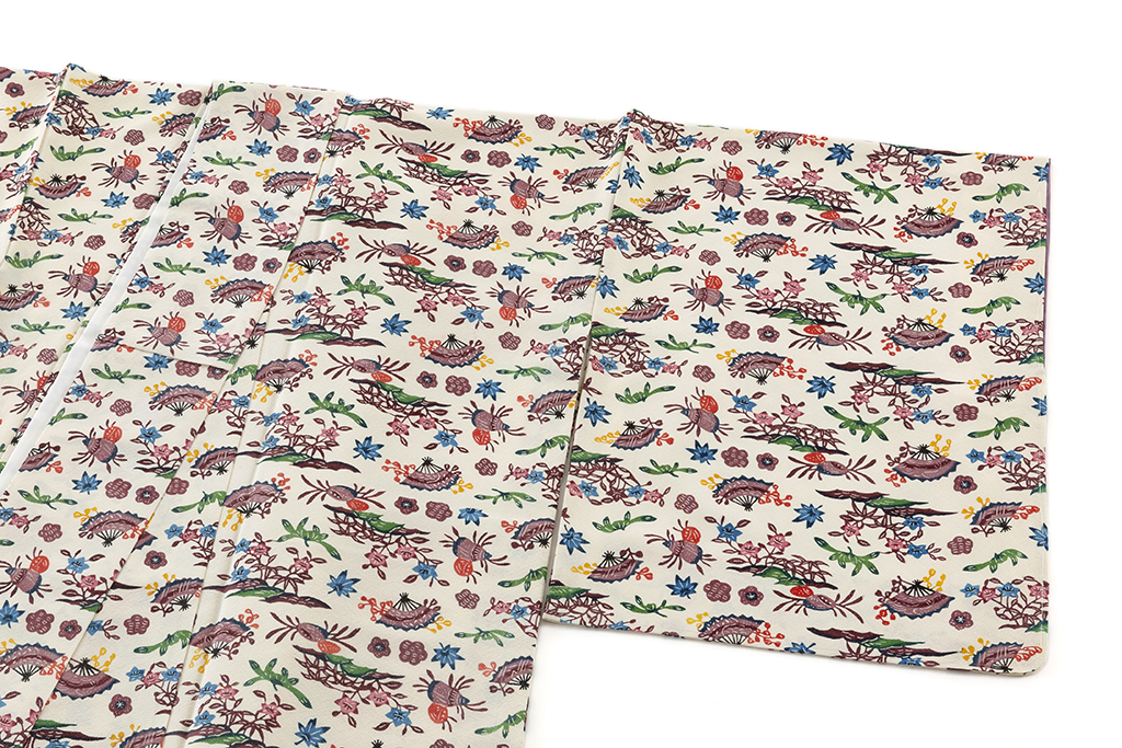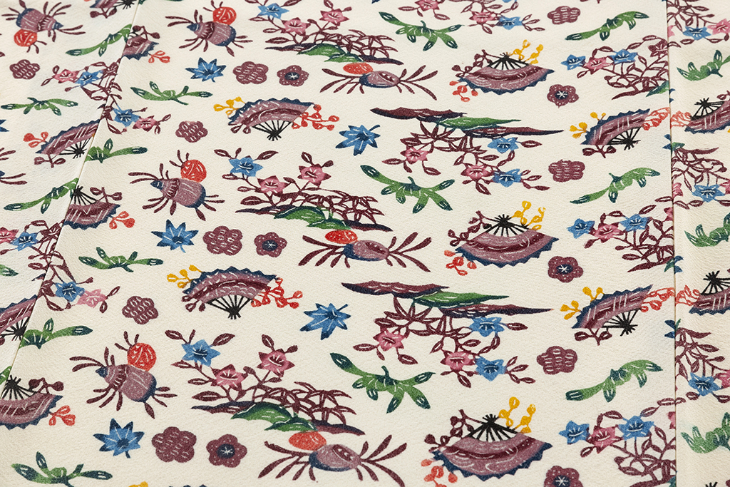 柔らかな乳白色の地に、扇や楓、桔梗、色鮮やかに咲く草花や貝を本紅型染した、繰り返される色彩が可愛い表情を浮かべ、和やかな空間を広げる本紅型染 小紋です。
