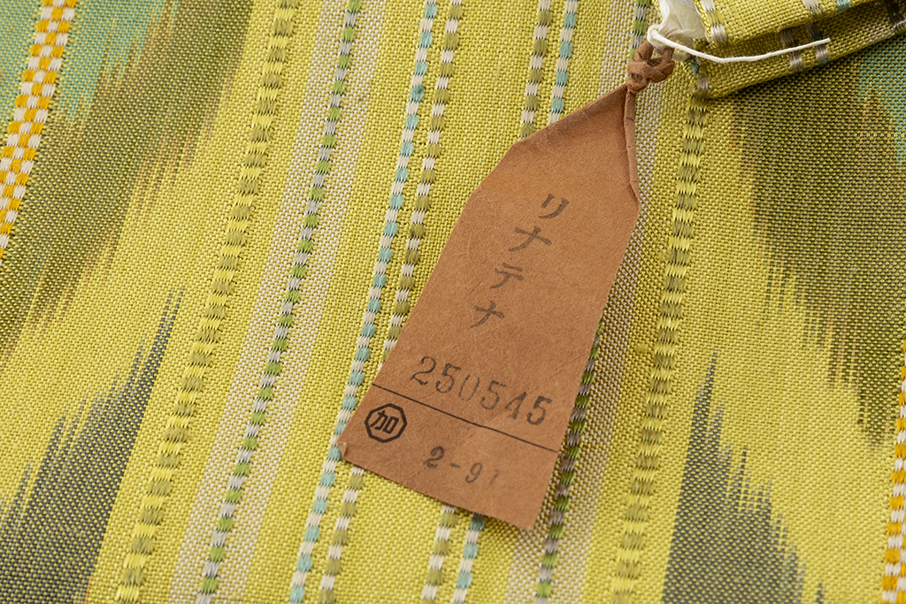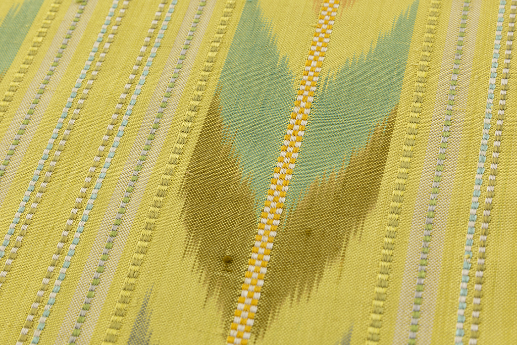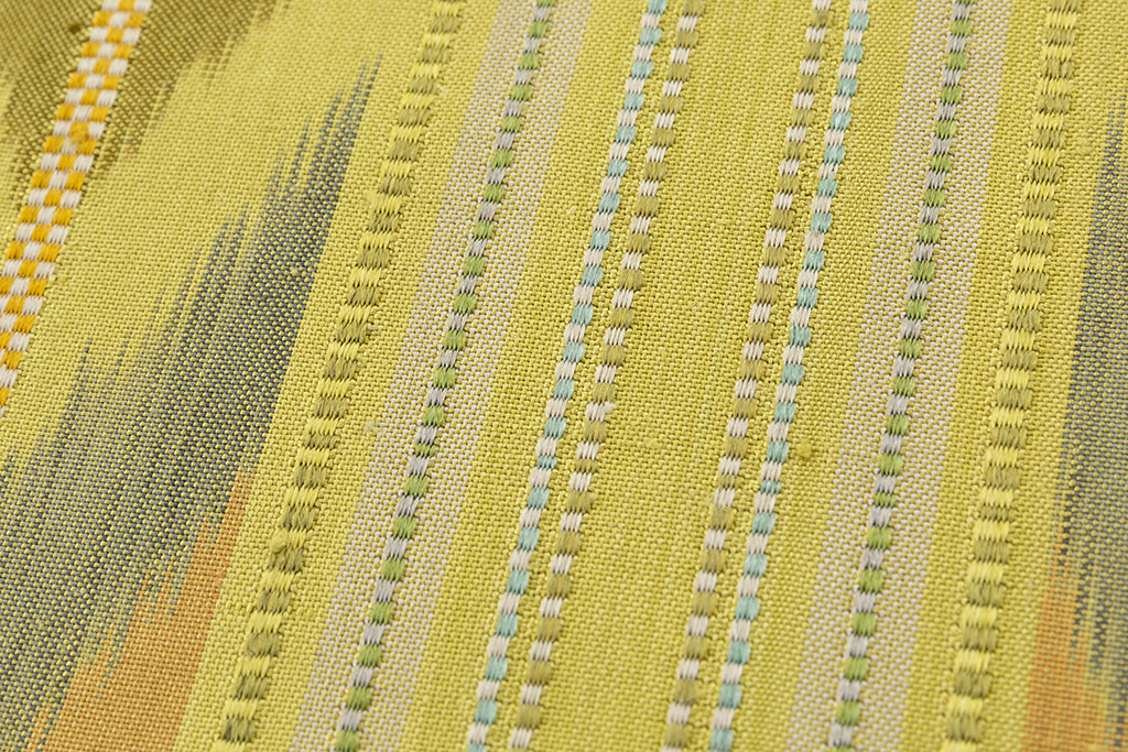 多彩な彩りの大きな絣模様を組み込んだ明るい刈安色の地に、可愛らしく鮮やかな色合いの連なる浮織で縦縞を織り出し、高度な技術を駆使して丹念に織り上げた、洗練された景色が広がる優しさと美しさを備えた国画会会員 小島秀子さん作の紬開き九寸名古屋帯です。