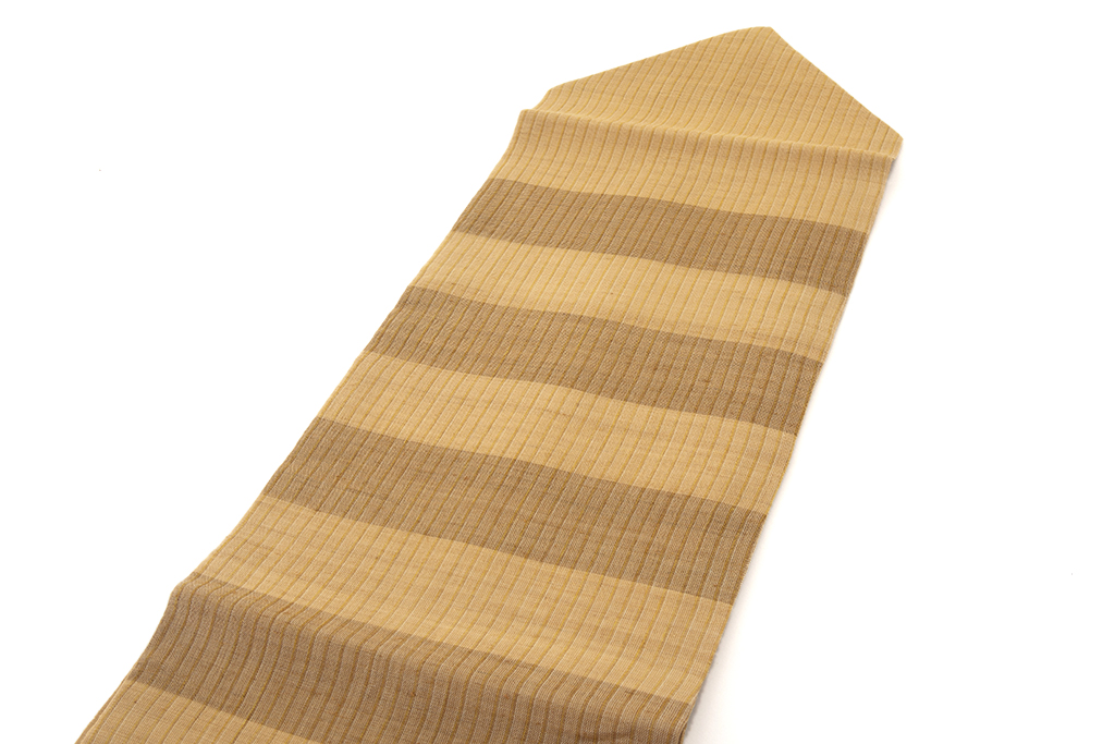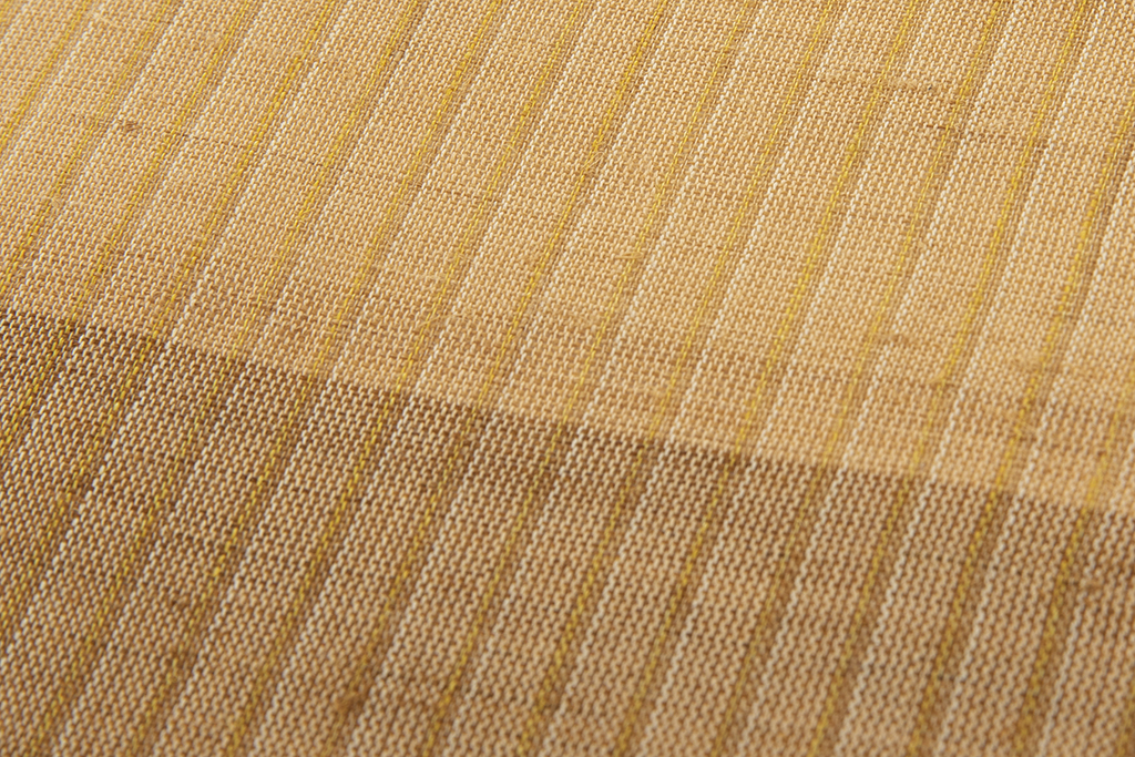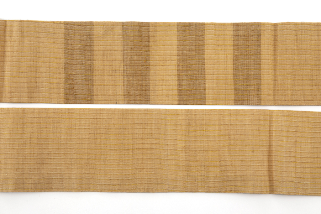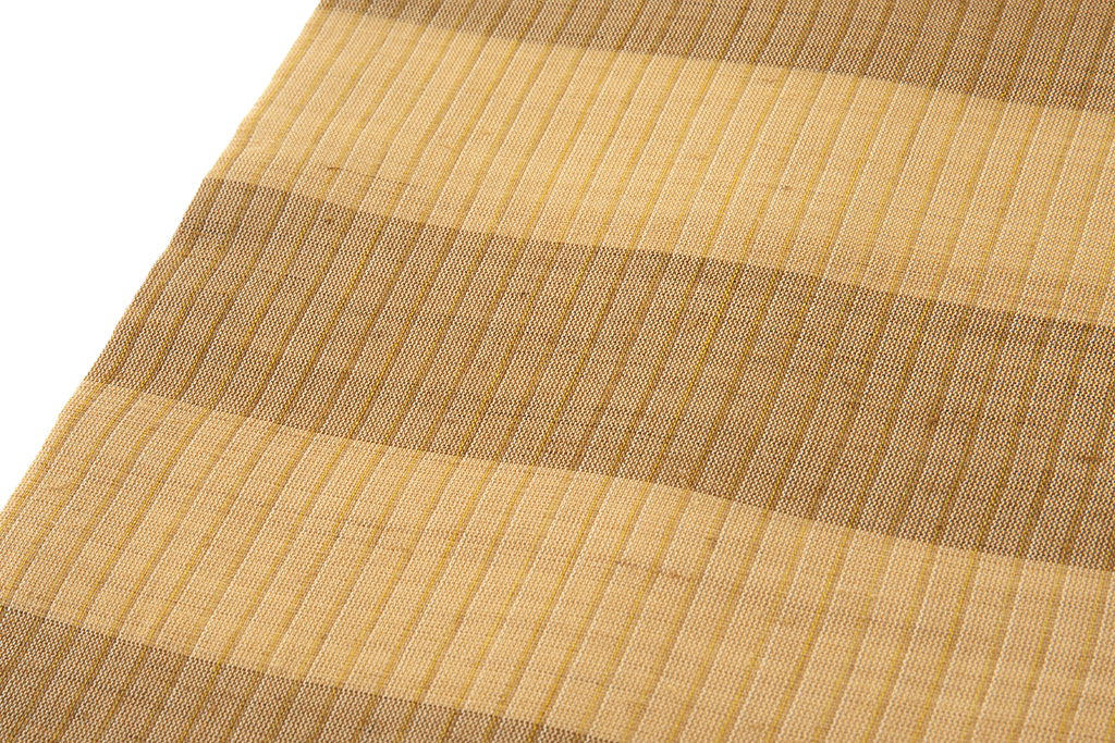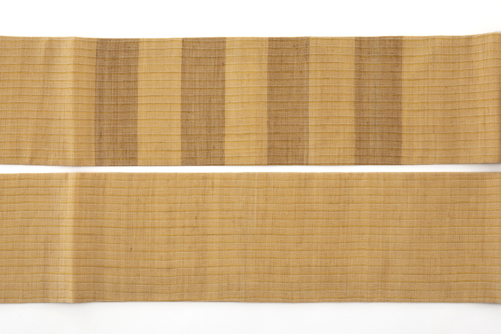 柔らかな麹色の八重山上布地に、細い経縞に胡桃色の横段を織り出した、温かな草木染め、優しい織味が朗らかな表情を生む人間国宝 新垣幸子さん作 八重山上布 九寸名古屋帯です。