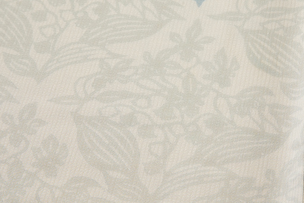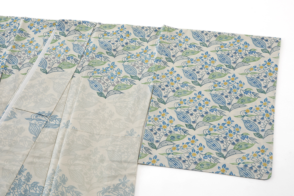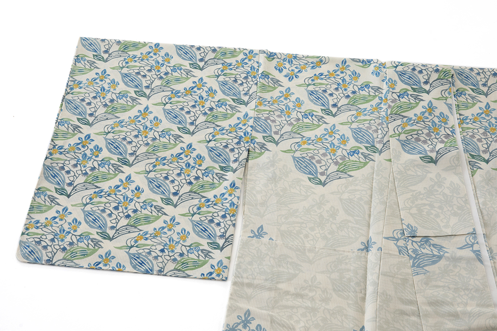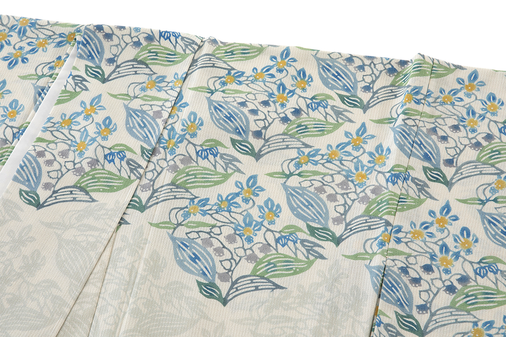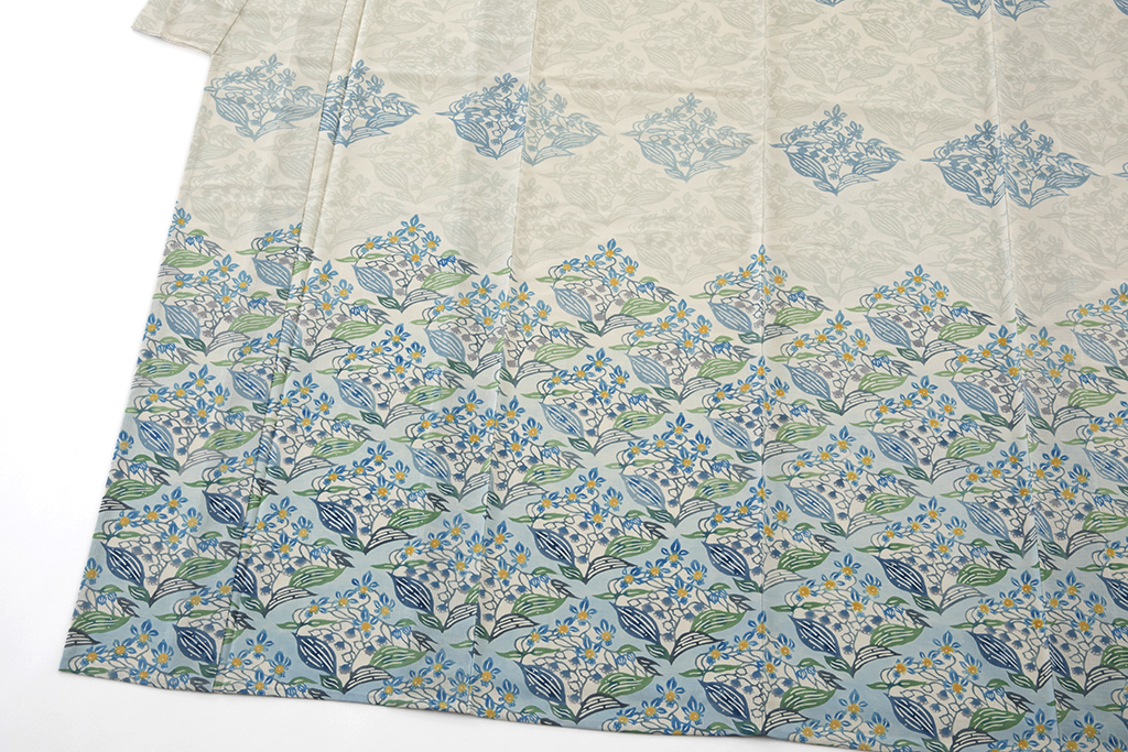 淡い真珠色の地に、美しい色彩感で、瑞々しい表情を浮かべる艶やかな花々を型絵染めした、優しい色の移ろい、心地よいリズム感が女性の可愛らしさを引き出す澤田麻衣子さん作 型絵染 夏紬訪問着です。