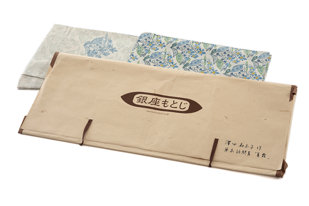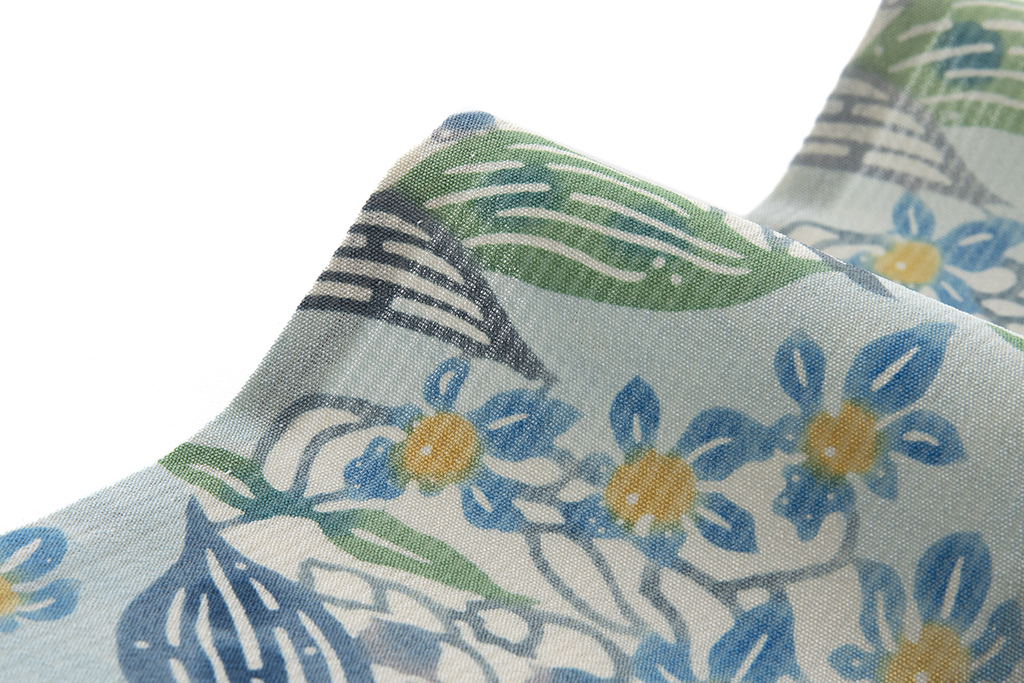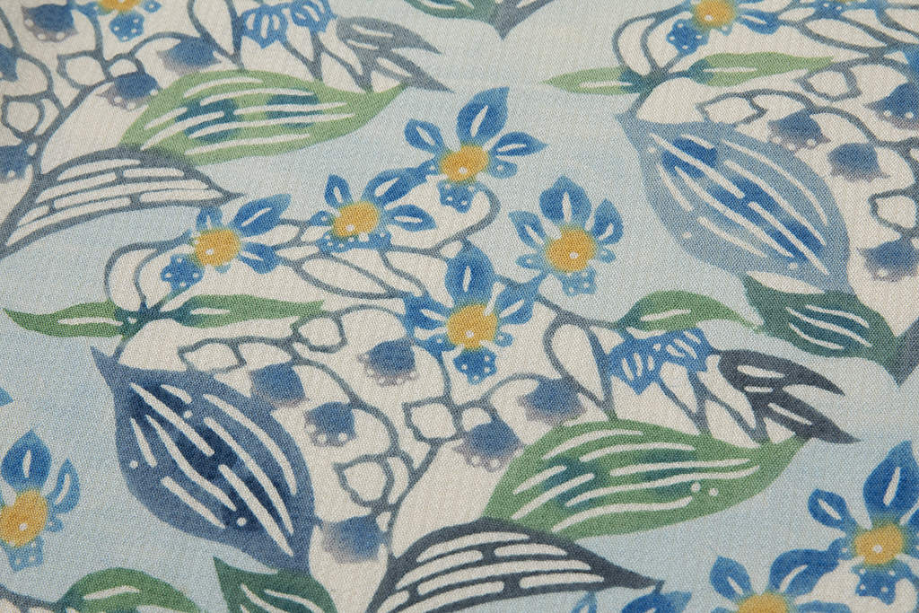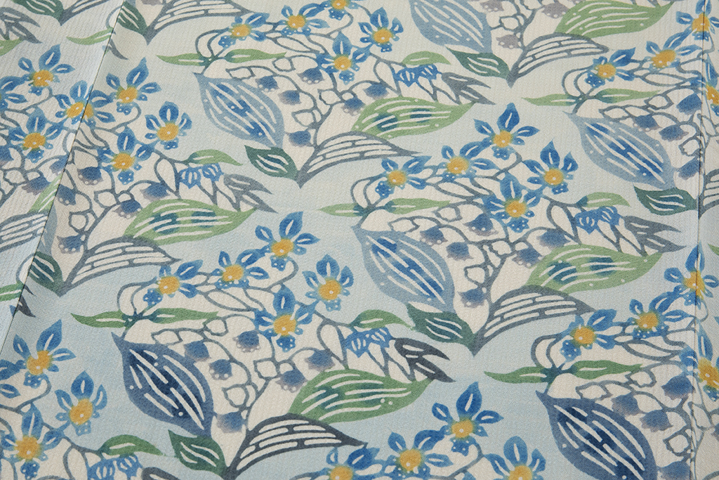 澤田さんは、ご自身でデザインを描き、型紙を制作、糊で防染し、彩色をされています。京都府立植物園や茶花を扱う花屋さんによく出向くなど、常にアンテナを張って過ごし、作品作りと向き合われています。型紙を作る際も、30本ほどのカッターを使い分けることで作品に合った柔らかな線を生み出したり、糊置きでは、はっきりとした染め味を出すために粒子の細かい酸性染料を使用されています。彩色では、約20年職人として磨かれた配色のセンスを活かし、その時の感性で色をさします。お太鼓や前柄には少し強い色をさしたりと、着姿をイメージして制作されています。