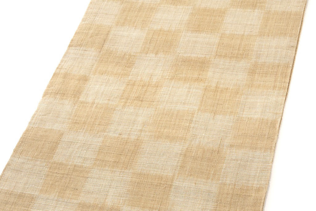 軽やかな宮古上布の地に、胡桃色と卵殻色を市松調に織り出した、柔らかな色彩が浮かべるモダンな表情が苧麻糸の素材の温かみとともに優しく穏やかな風合いを漂わせる、仲宗根みちこさん作 宮古上布 開き九寸名古屋帯です。