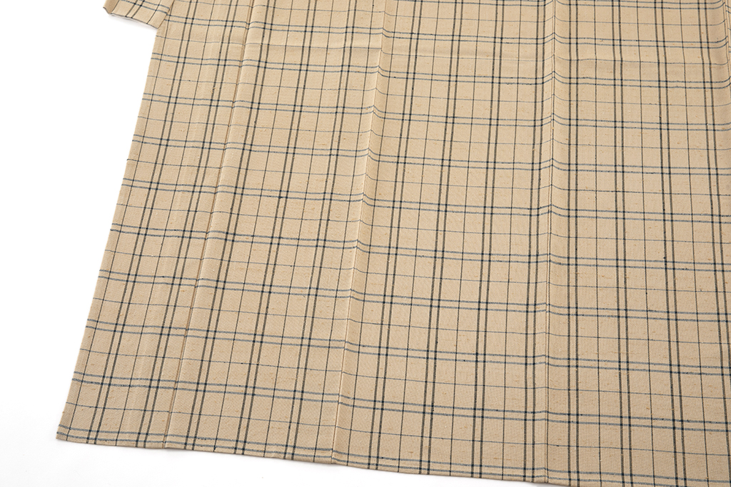 胡桃色の地に、黒橡と藍鉄色の糸で、可愛らしい格子柄を描いた、柔らかな色彩とふっくらと地厚な織味が、穏やかで優しい風合いを生む、しなやかな着心地の工芸色豊かな伊兵衛織 着物です。