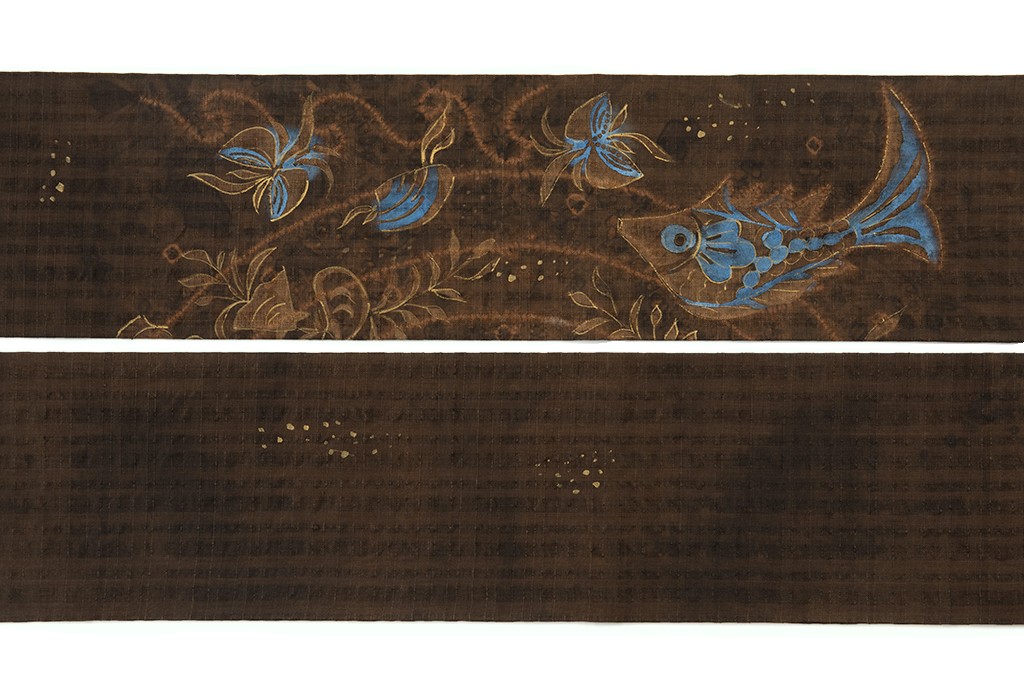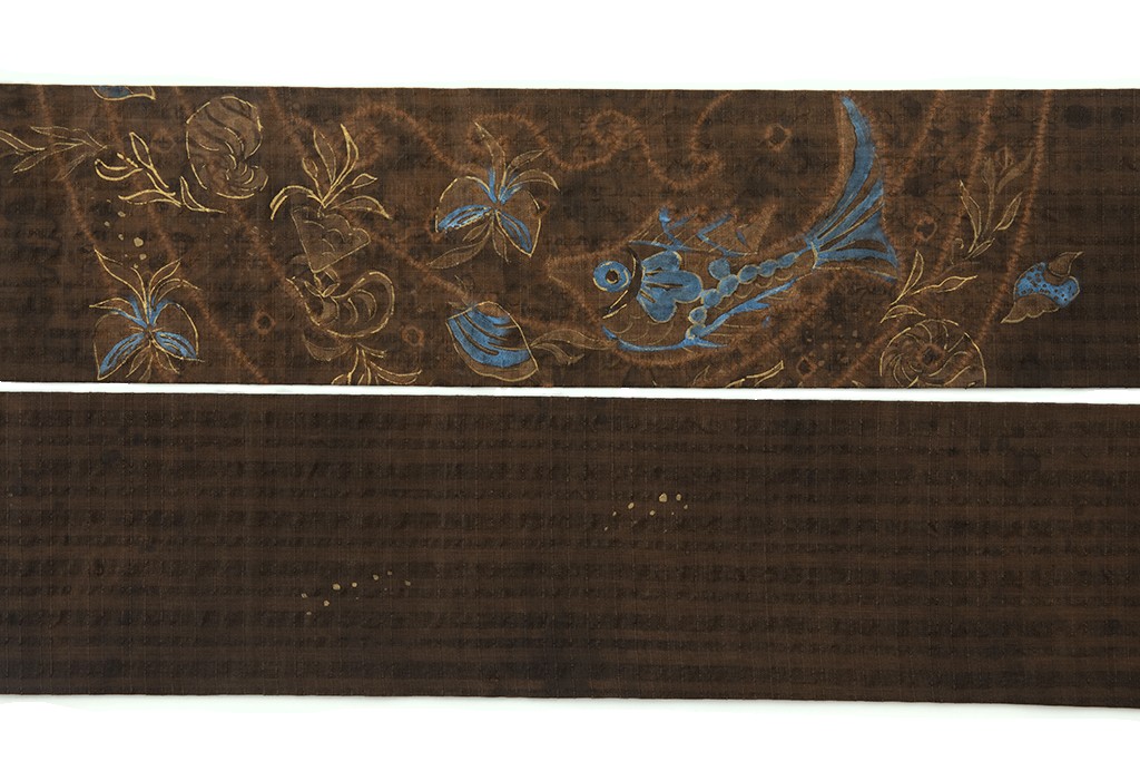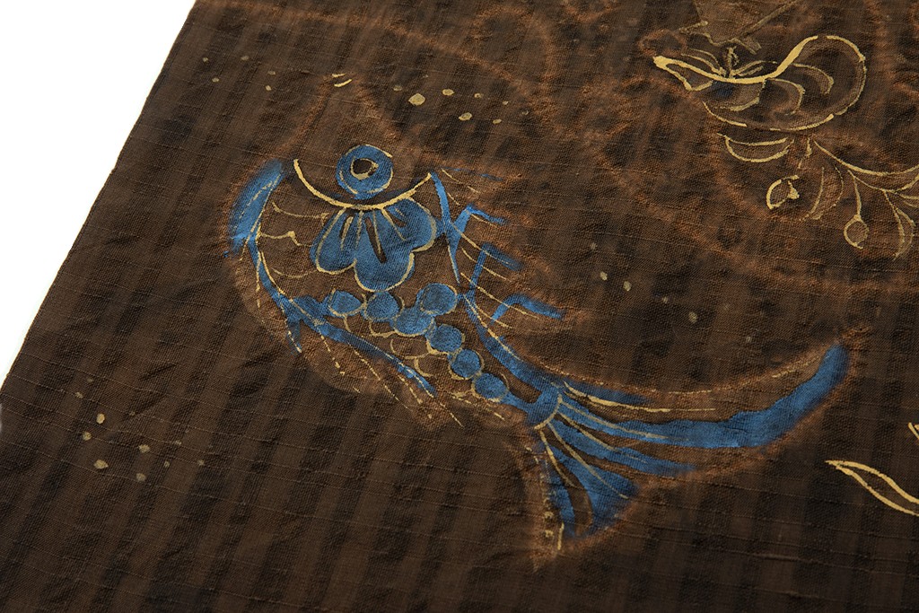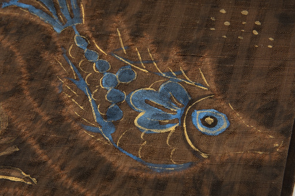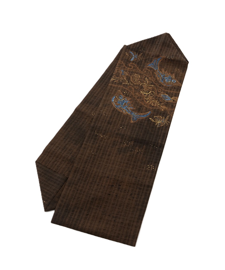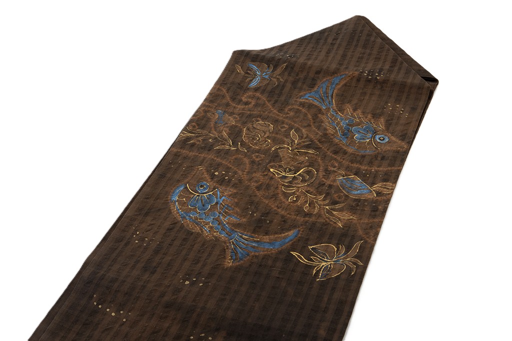 縦縞を描いた深い杉染の紬地に、柔らかな滲みが味わいを増す絞り、繊細な手挿しや型絵染で、深い海の底を泳ぐ魚たちやそこに潜む貝、揺られる海藻を描いた、海中の砂煙や気泡を表現するかのような絞りや色彩の濃淡が奥深い景色を生む、情趣豊かな鈴木紀絵さん作の型絵染 紬九寸名古屋帯です。