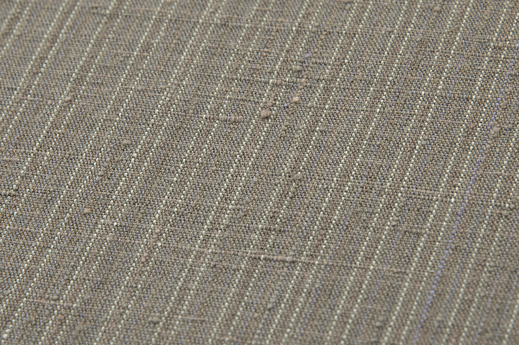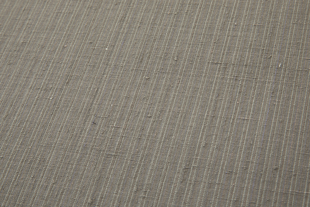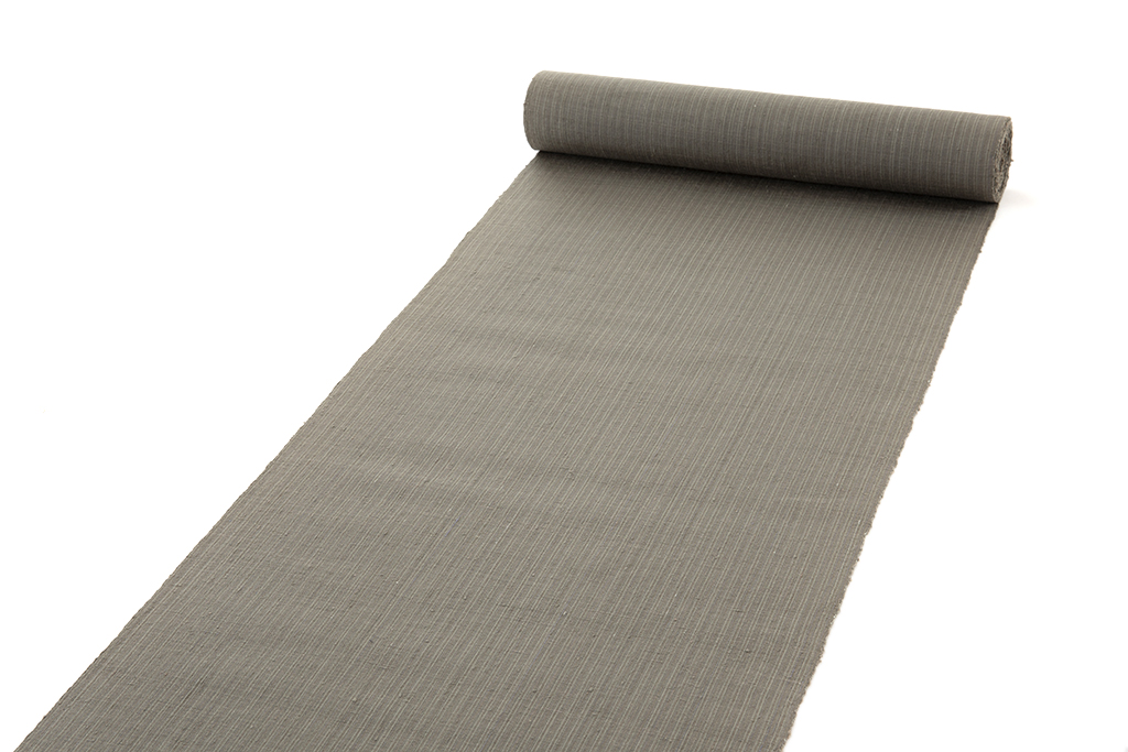 消炭鼠の地に、細やかな経縞を織り出し、よもぎ草、栗などの天然染料を用いて草木染めした、柔らかな渋みと滲み出る味わい深さを表現した、澄んだ空気や流水、清らかな自然の恵みが生んだ、軽やかで柔らかな手触りの日本工芸会正会員 山岸幸一さん作の草木染 双紬糸織 着尺「蓬草染」です。