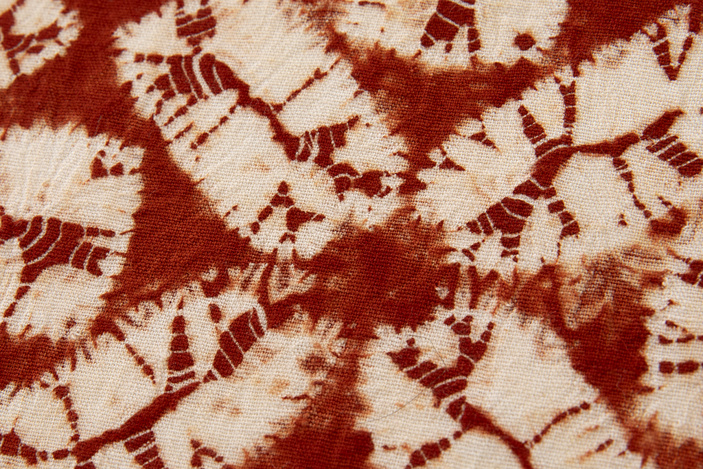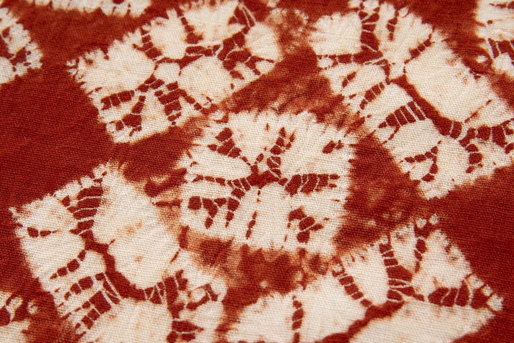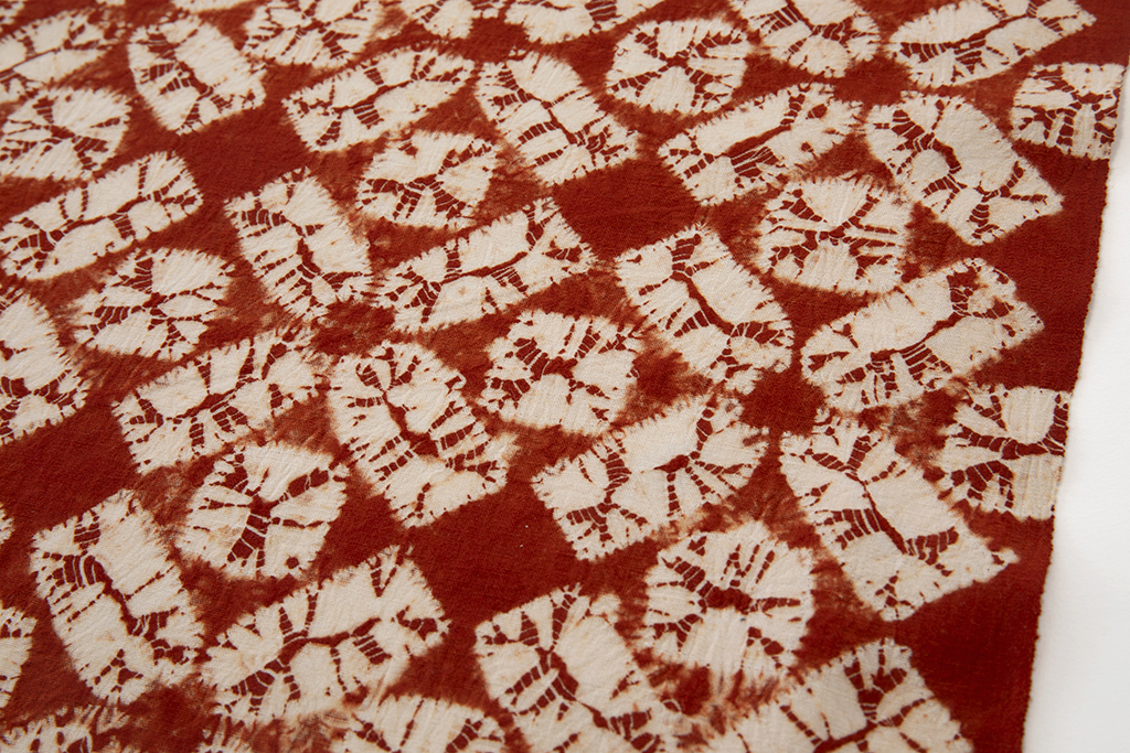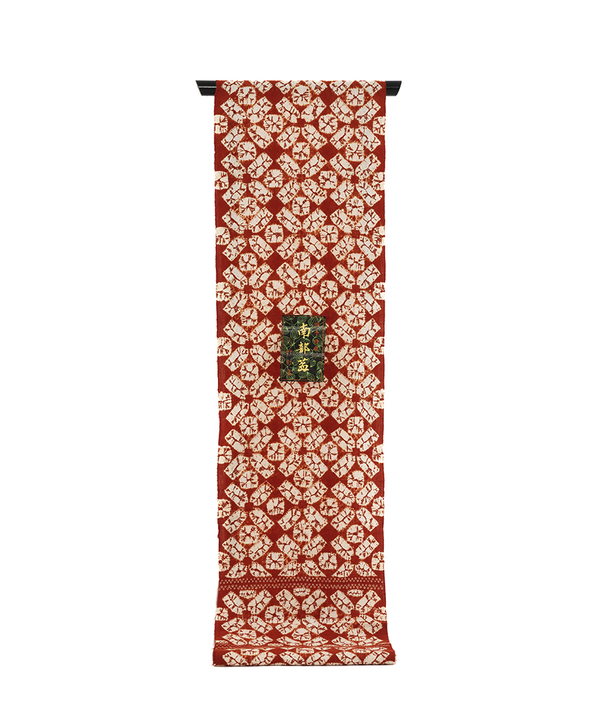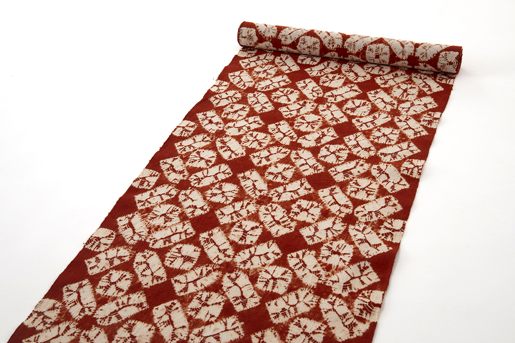 温かみのある緋銅色で、柔らかな花弁を広げる花のようにも見える文様を整然と並べた、柔らかな滲みや豊かな表情を生む絞り染めが味わい深い草紫堂製 南部茜染 綿九寸名古屋帯地です。