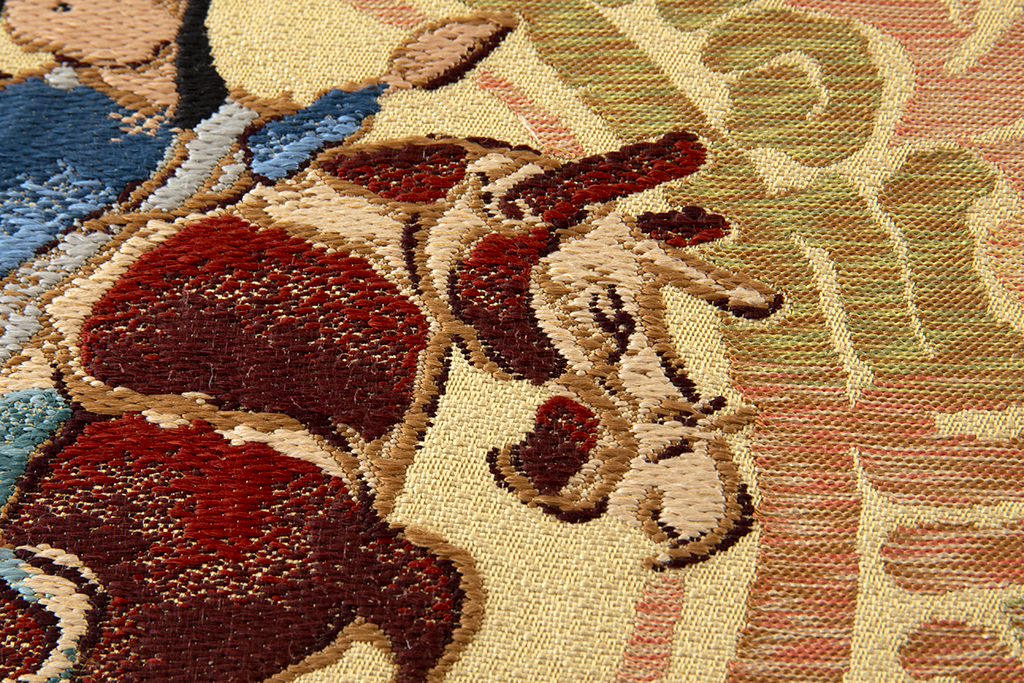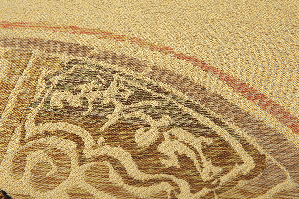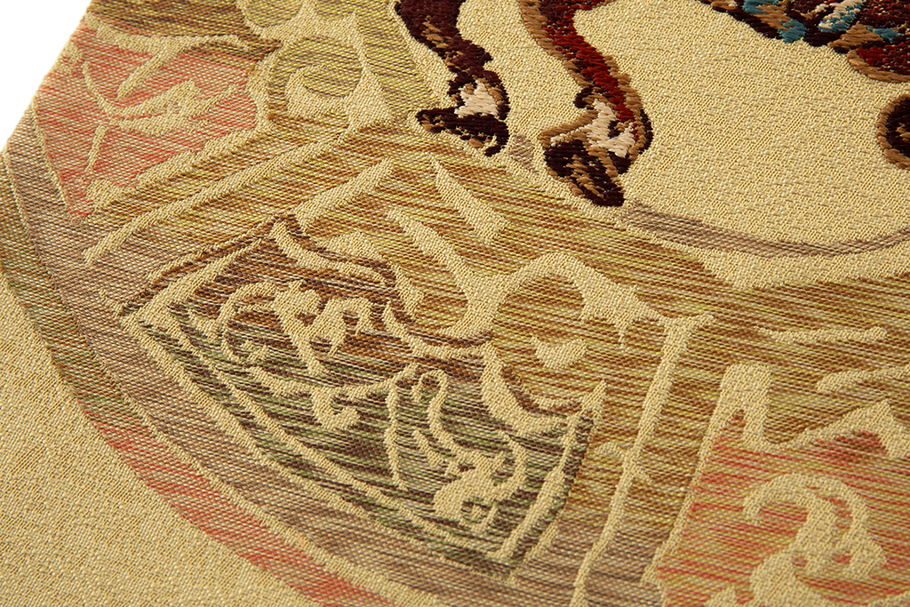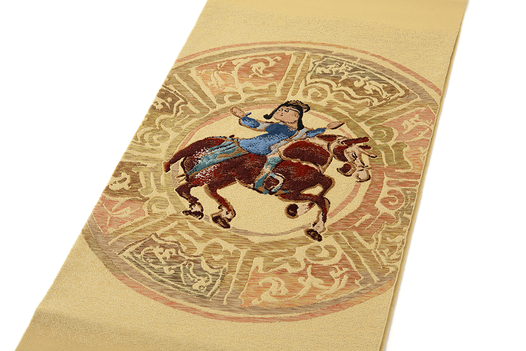 黄唐紙の地に、民族衣装を身に纏い、隆々しく佇む馬に跨がる騎手を力強く織り出した、刻まれた文様や小鳥や馬などの動植物の表情に異国の風を感じる、こっくりと深い味わいの龍村平蔵製 袋帯 「ミナイ手騎馬文」です。