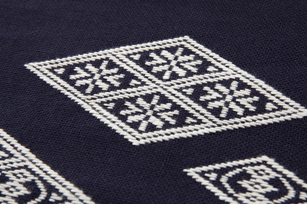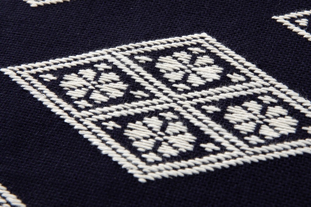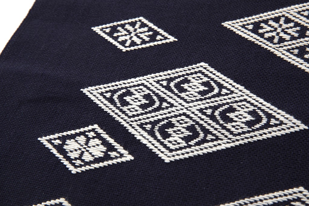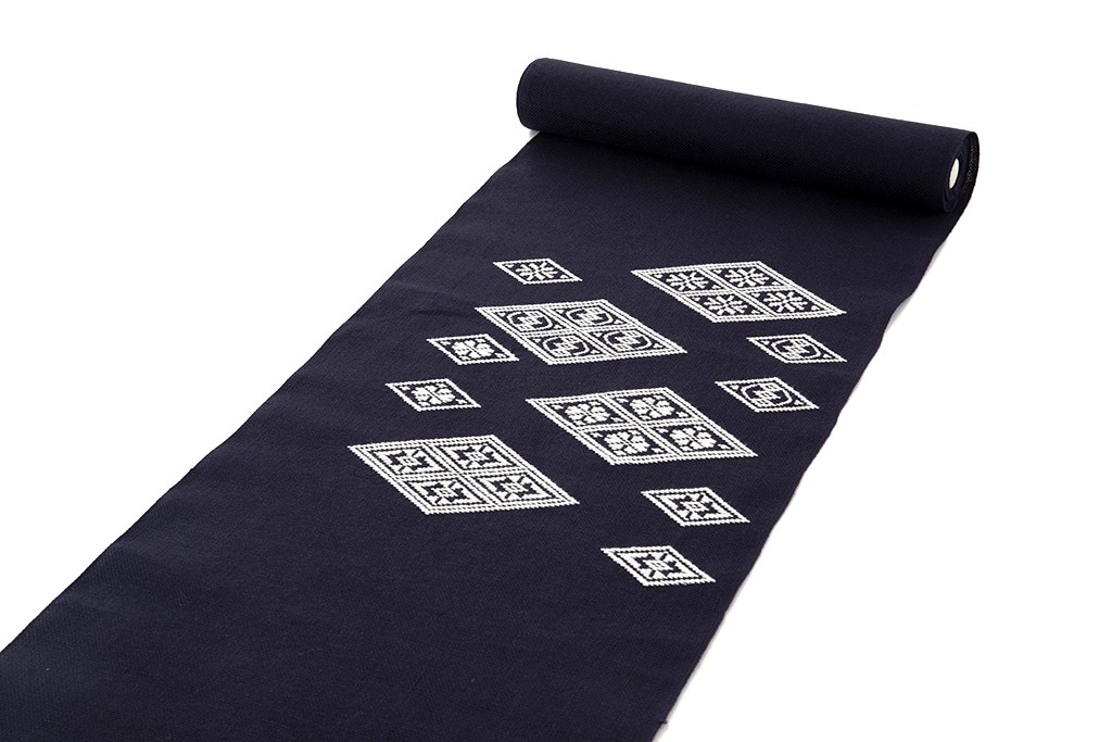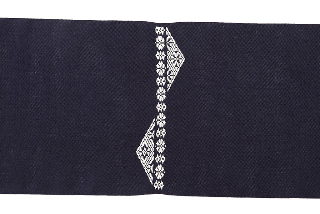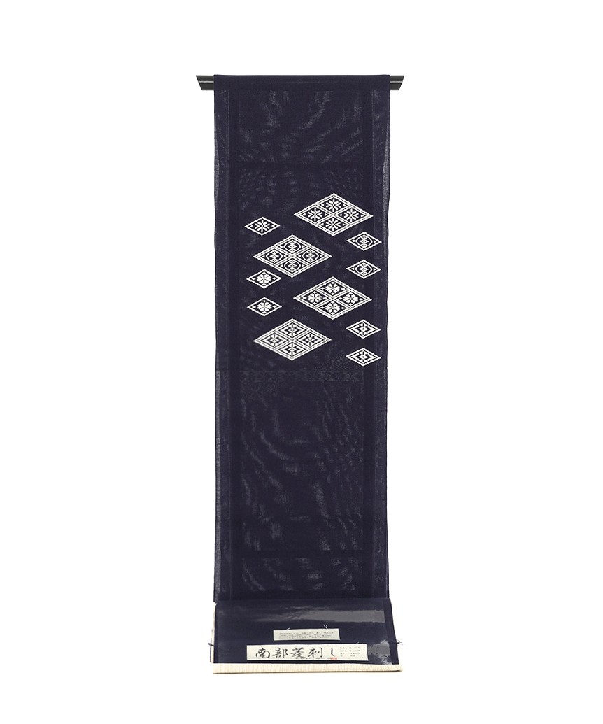 深い印度藍の地に、四つ菱に様々な刺し子文様を織り出した、ふっくらとした凹凸が並ぶ端正な景色が洗練された美しさを生む、南部菱刺し 九寸名古屋帯地です。