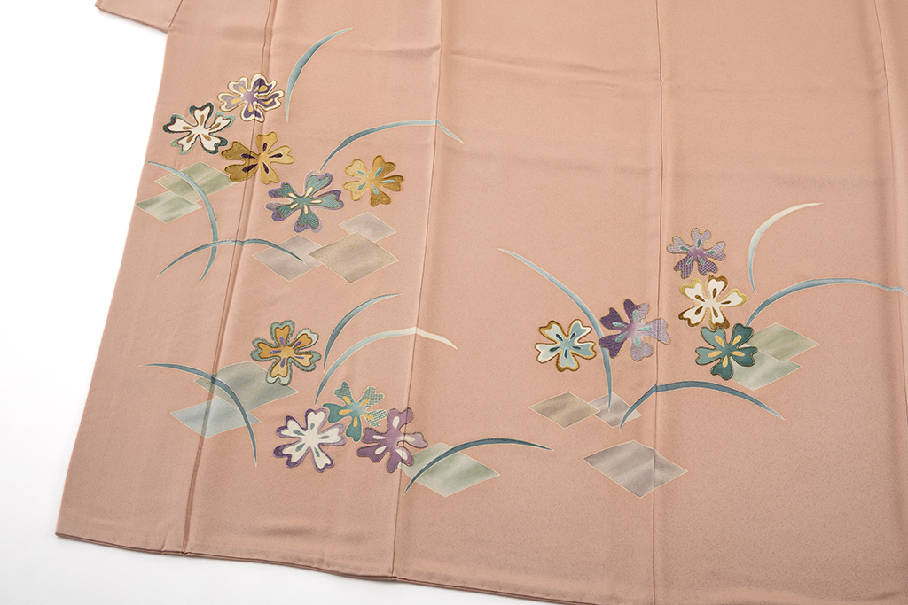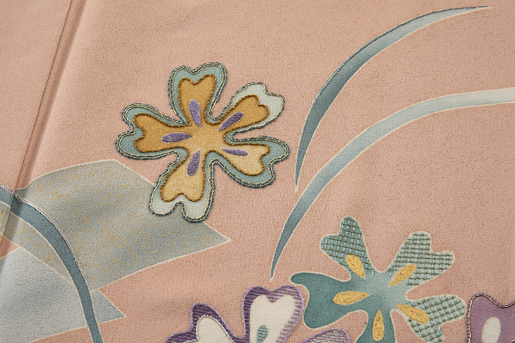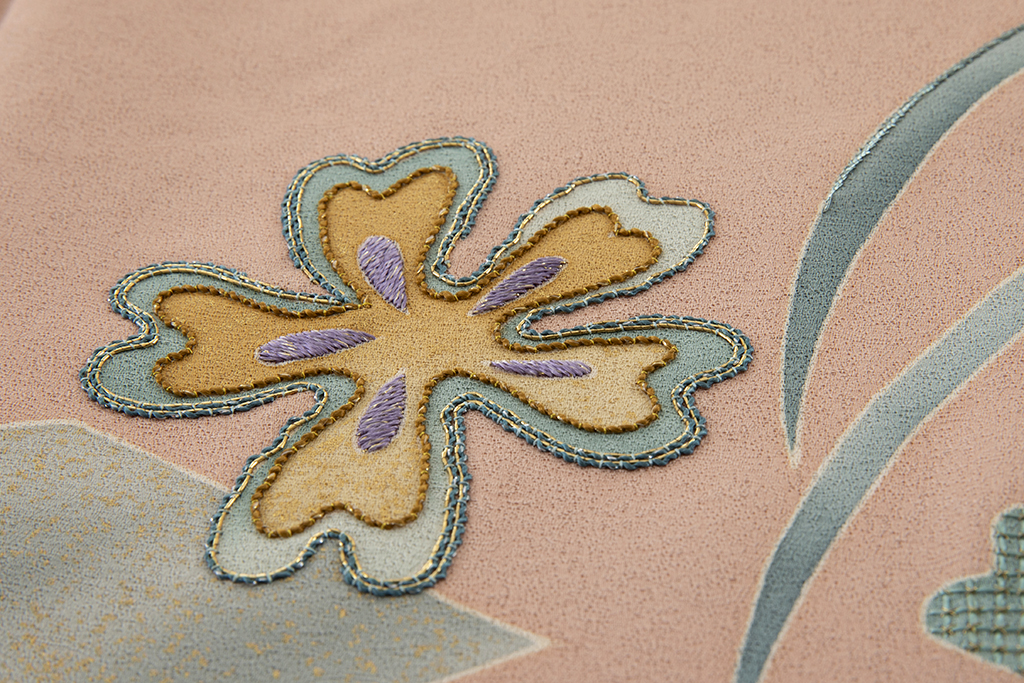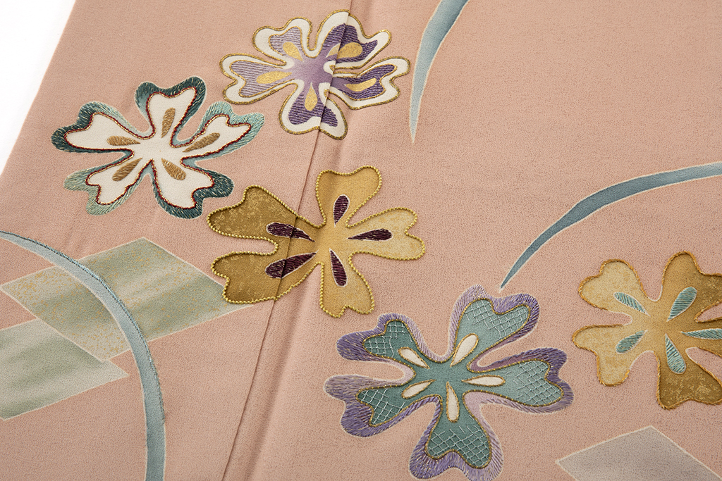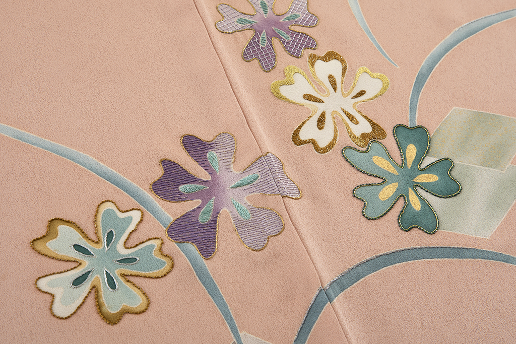 淡い水柿の地に、色鮮やかな色糸、煌めく銀糸を用いた細やかな刺繍で、ふわりと咲き開く花々を描いた、柔らかな女性美を着飾る染繍工芸大羊居製 訪問着です。
