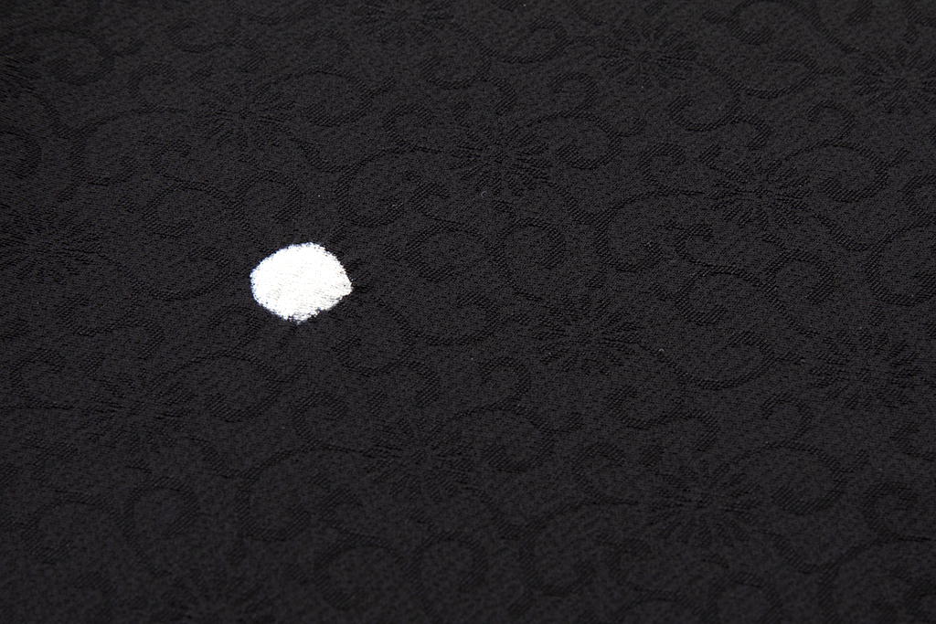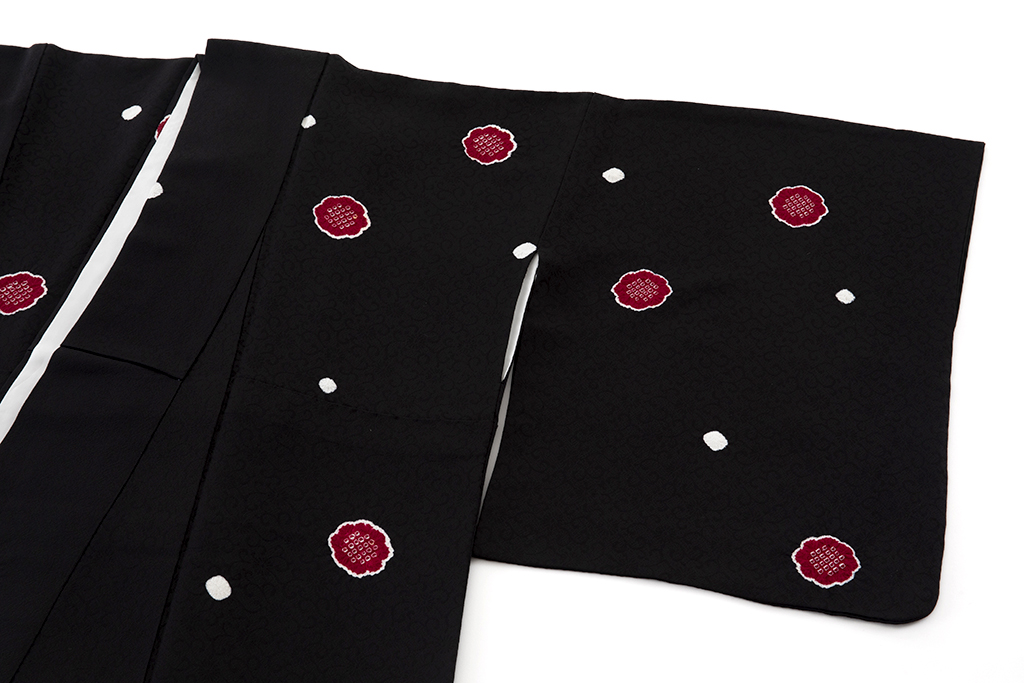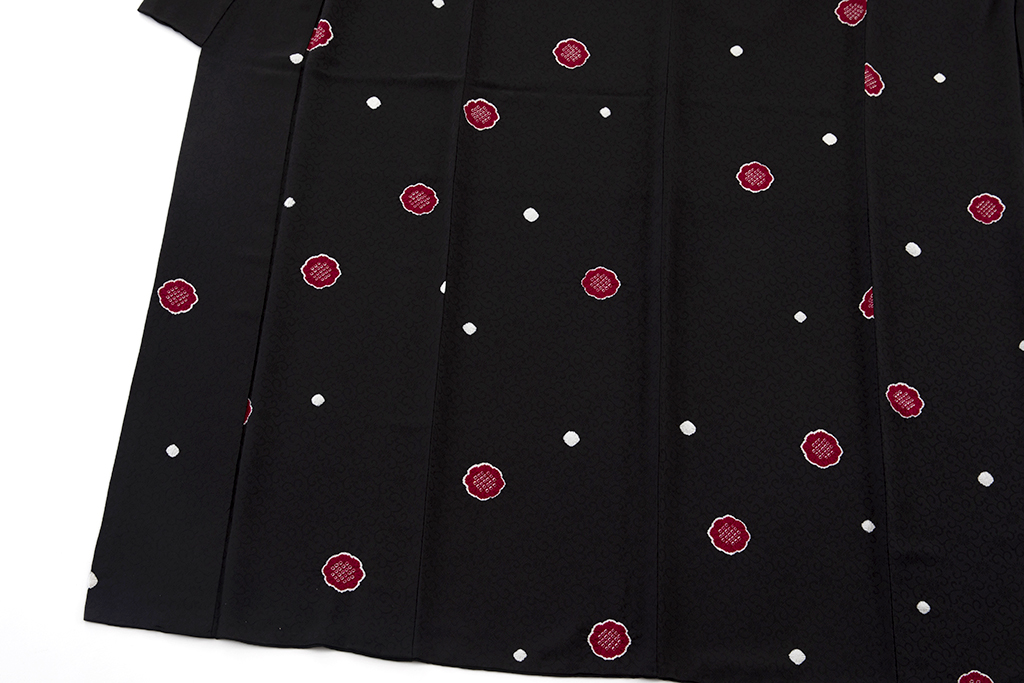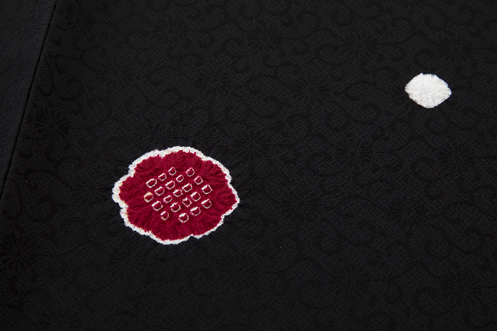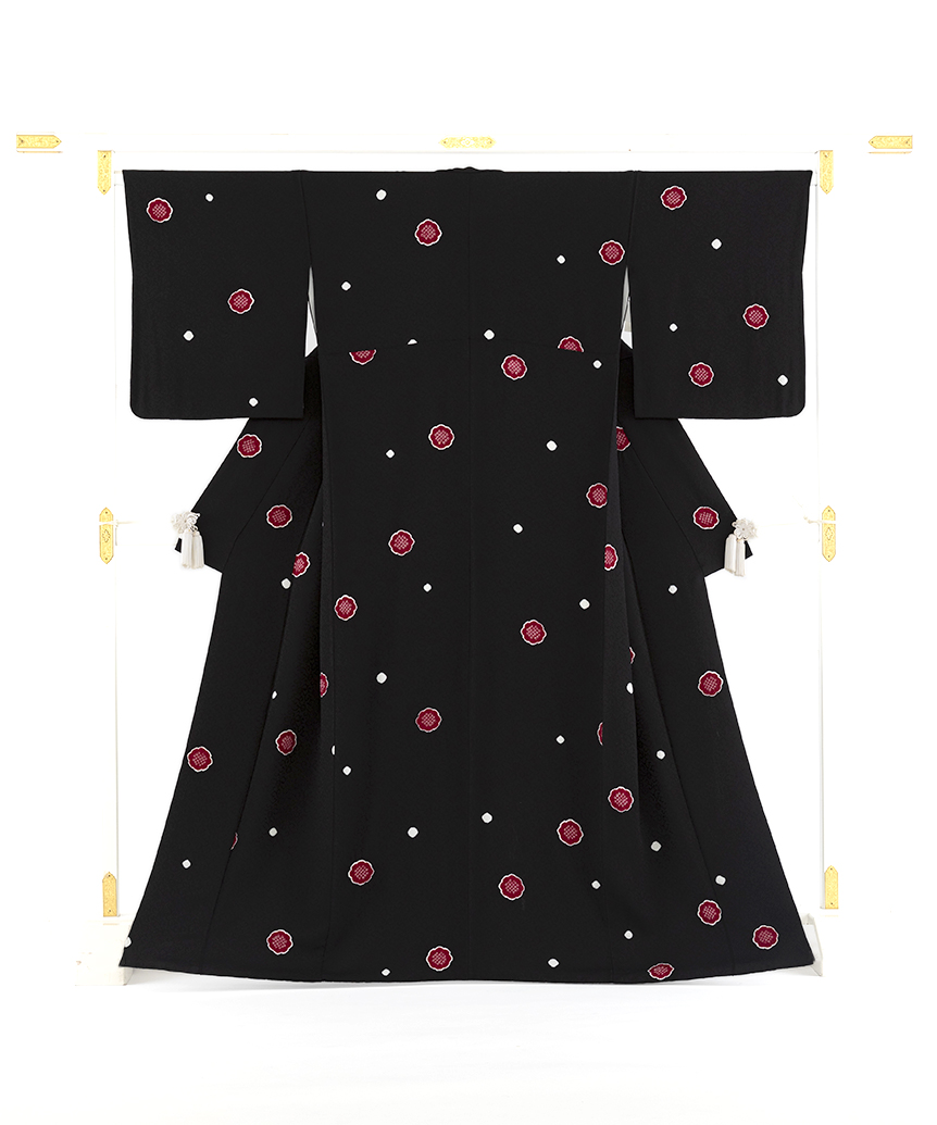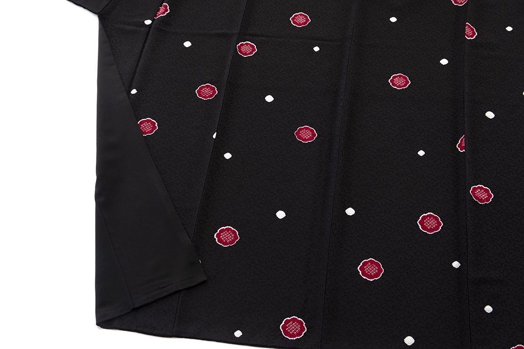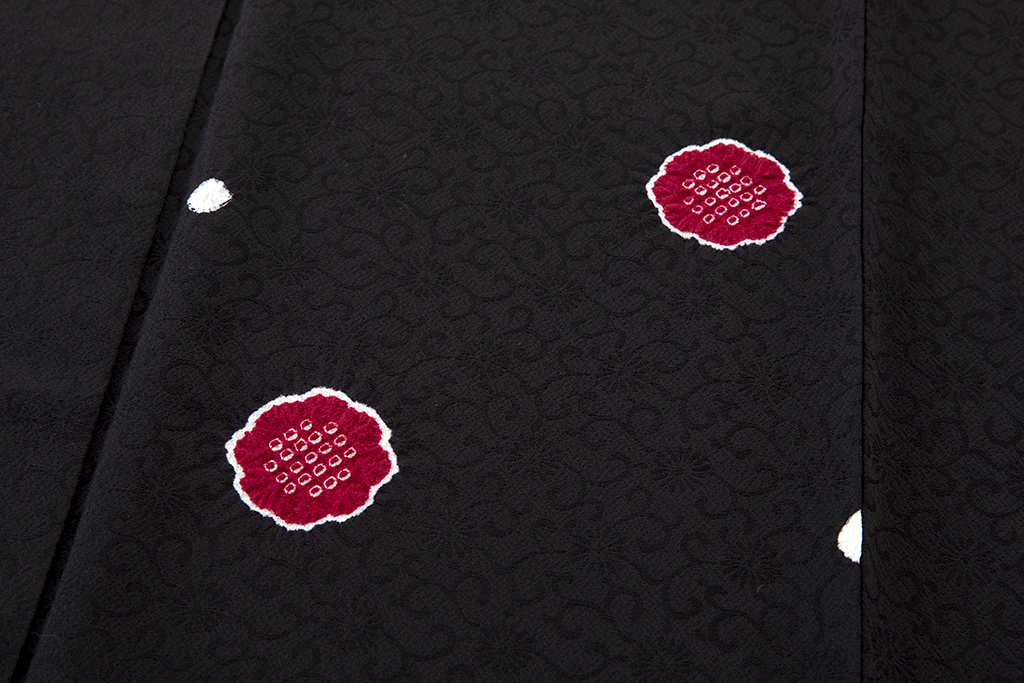菊唐草の地紋が入った艶やかな黒地に、白い丸文とともに、細やかな疋田絞りを用いて皆紅色の小菊を描いた、静やかな黒地に上品な色彩が浮かび上がる、柔らかな気品が美しく香るぎをん齋藤製 小紋です。