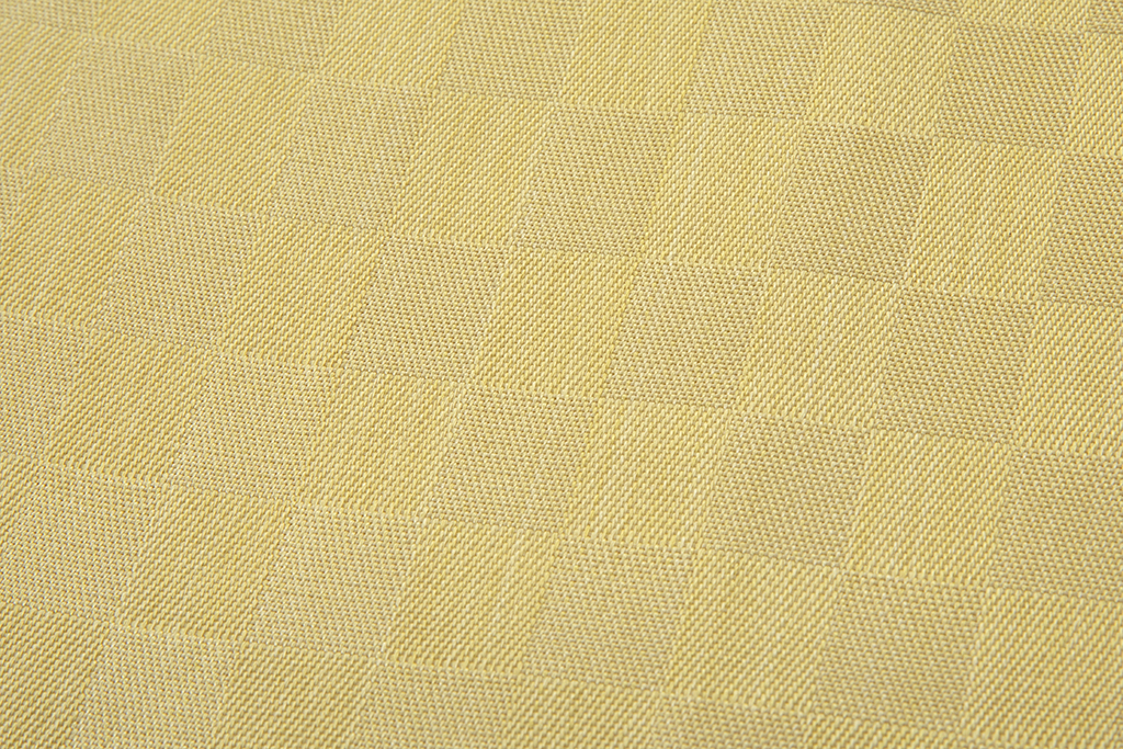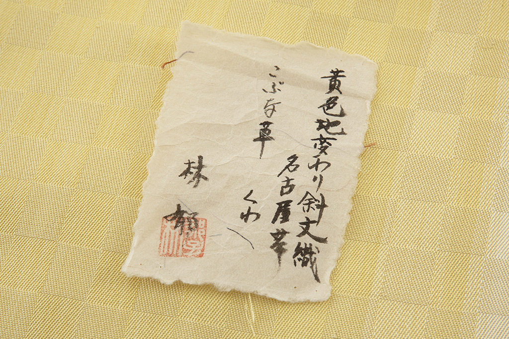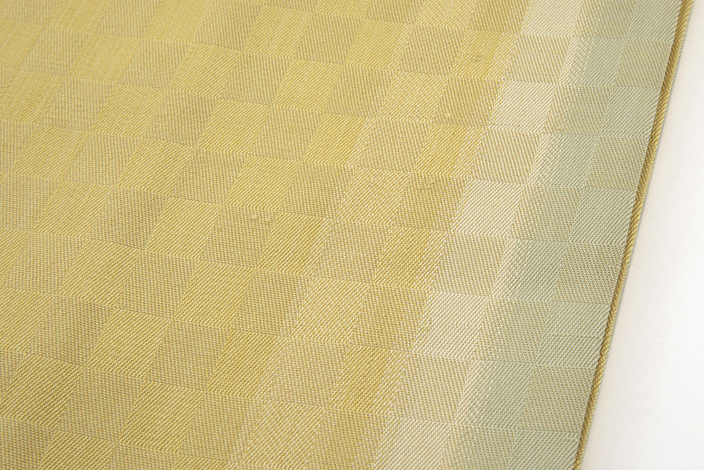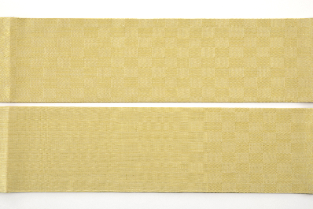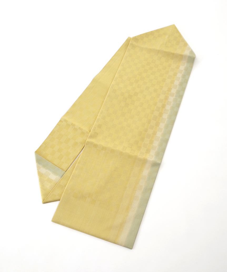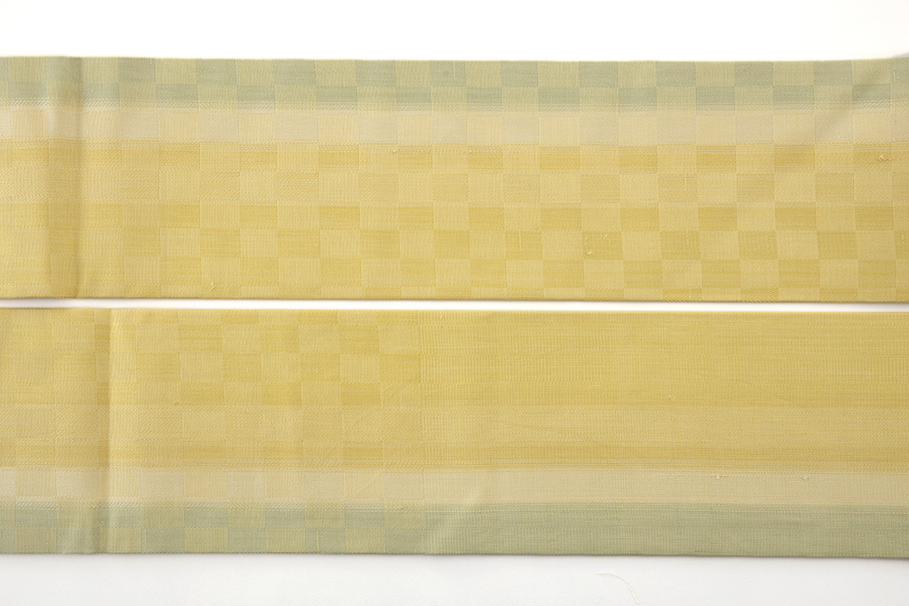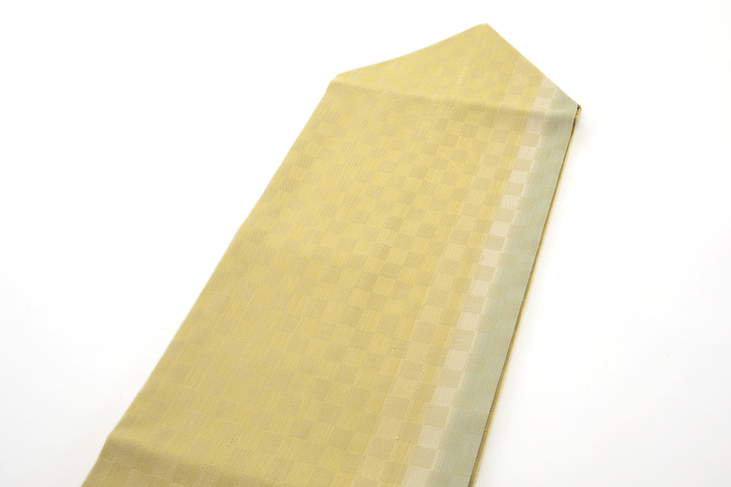 こぶな草やくわを用いた草木染めによる朗らかな淡黄色が優しく移ろう色彩に、精緻な綾織、繊細な斜文織を市松状に織り出した、角度によって表情を変える織りの凹凸が奥行きを生む、織の上質な光沢が美しい林郁さん作 変わり斜文織 九寸名古屋帯です。