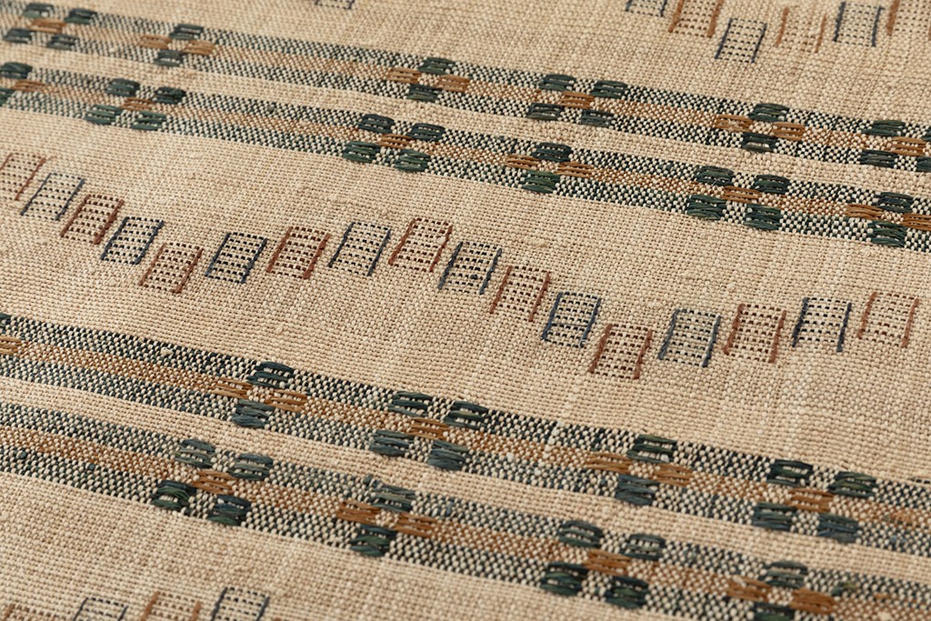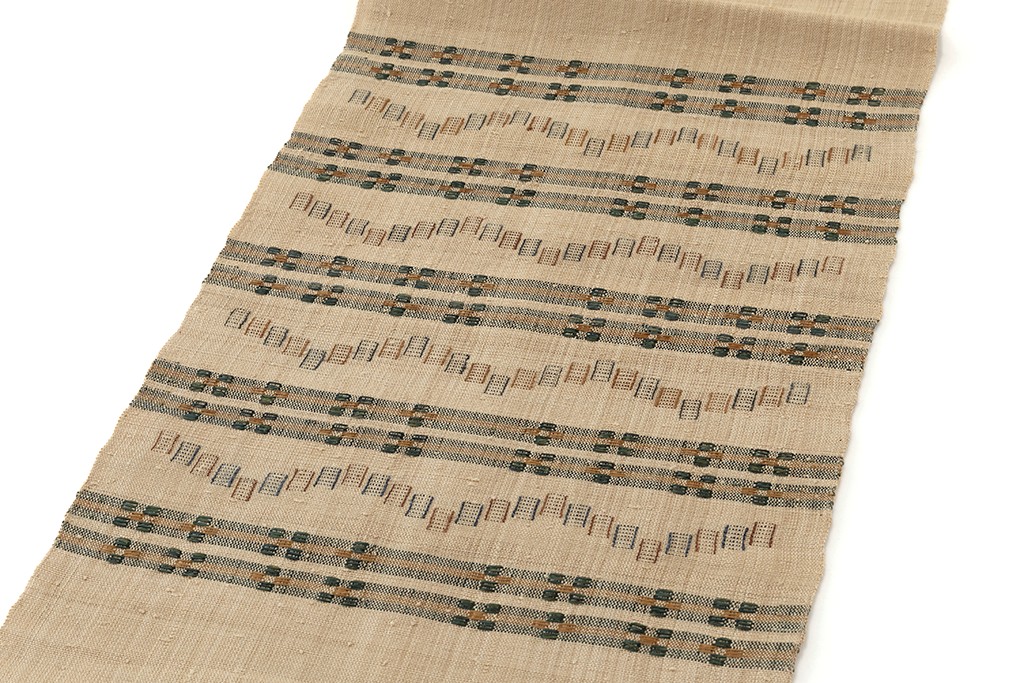 柔らかな胡桃色の芭蕉布地に、青漆と金茶で可愛らしい花織の横段に心地よいリズムを織り連ねた、軽やかで張りがあり、野趣豊かな味わいが広がる芭蕉布 花織 八寸名古屋帯です。