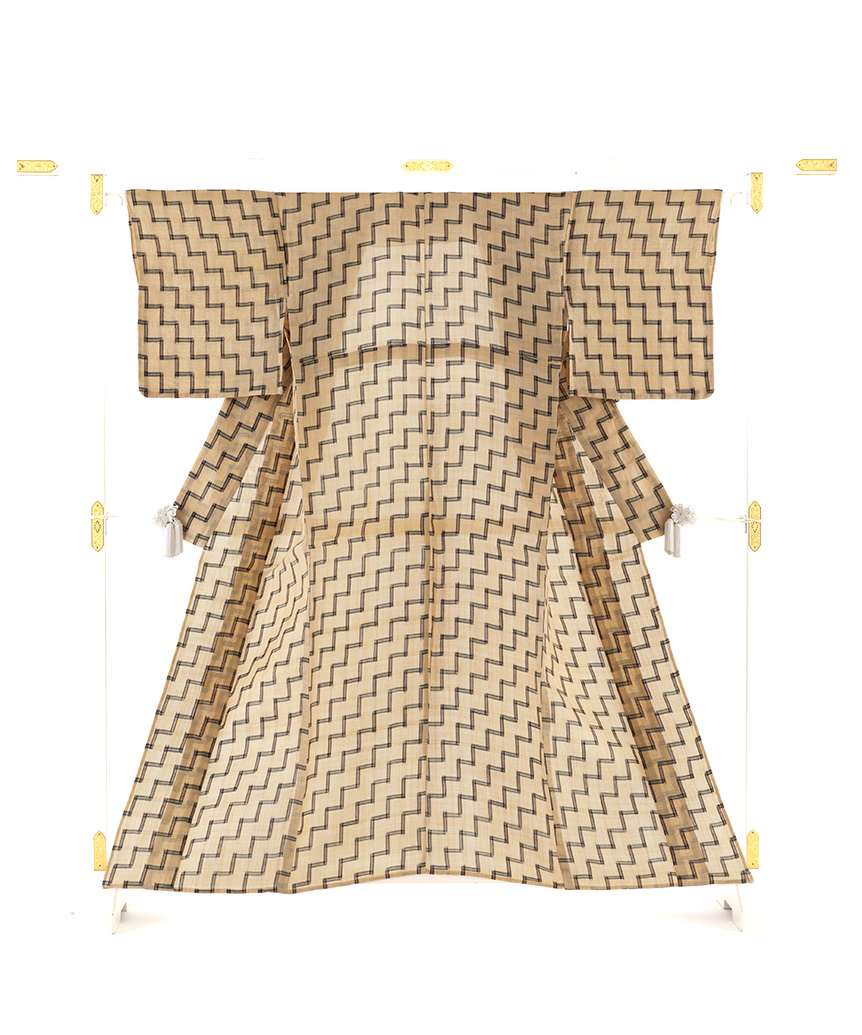 伝統あるバンジョーの絣柄を連ねた、素朴な絣柄が野趣豊かな味わいを引き立てる、独特の張りを備えた清々しい着心地の芭蕉布 着物です。