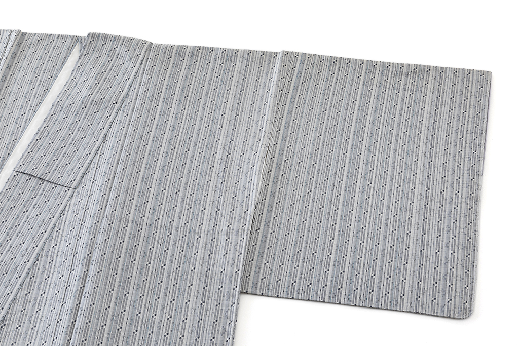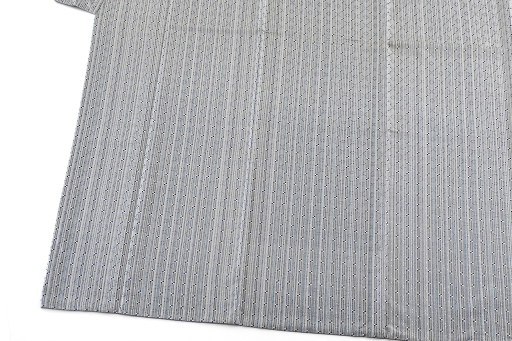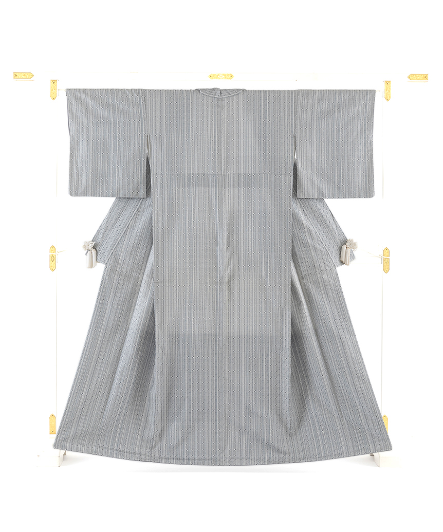 鉛白や白群、鋼色などの清冽な彩りの縦縞に、繊細に色糸を使い分け、細やかな花織を織り出し、並び連ねた、高度な技術が気品を纏い、端正な景色に豊かな表情が浮かび上がる、新垣みどりさん作の首里花織 着物です。