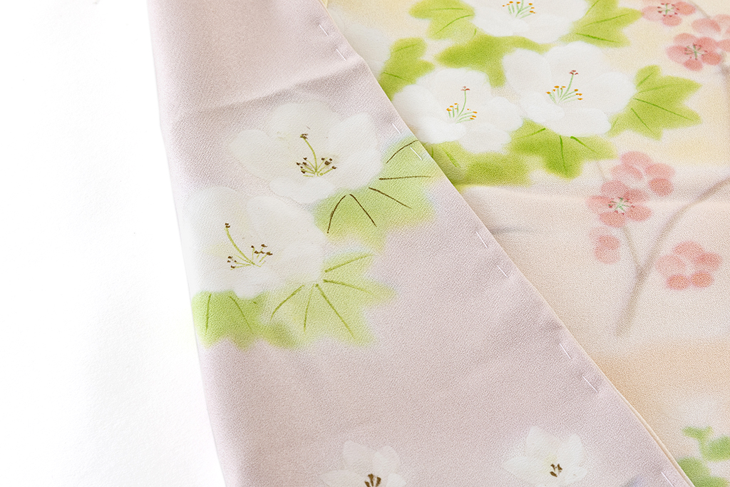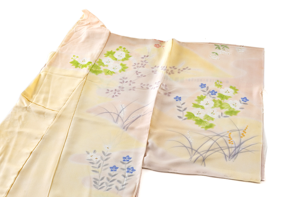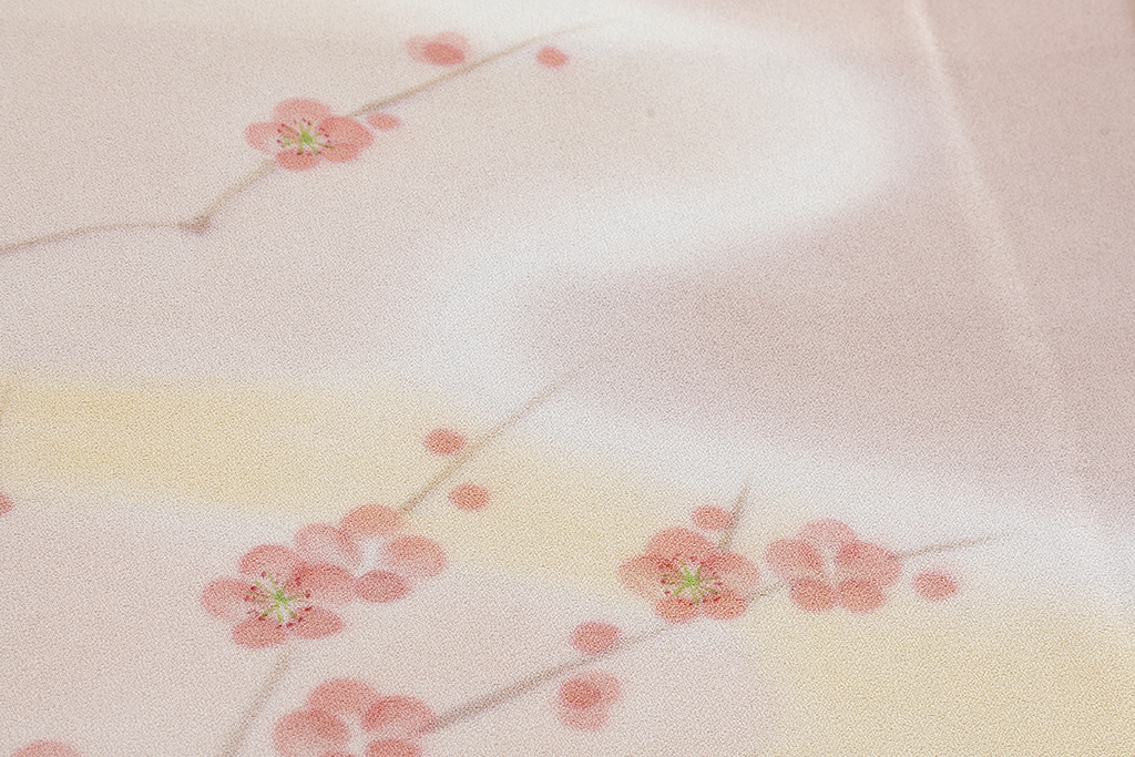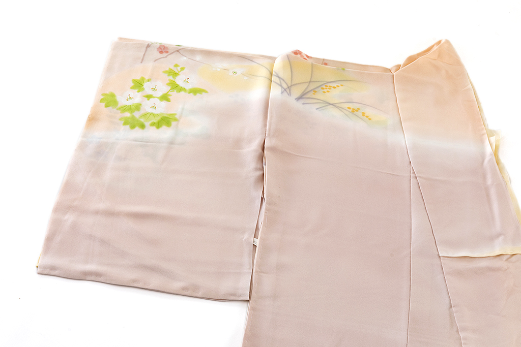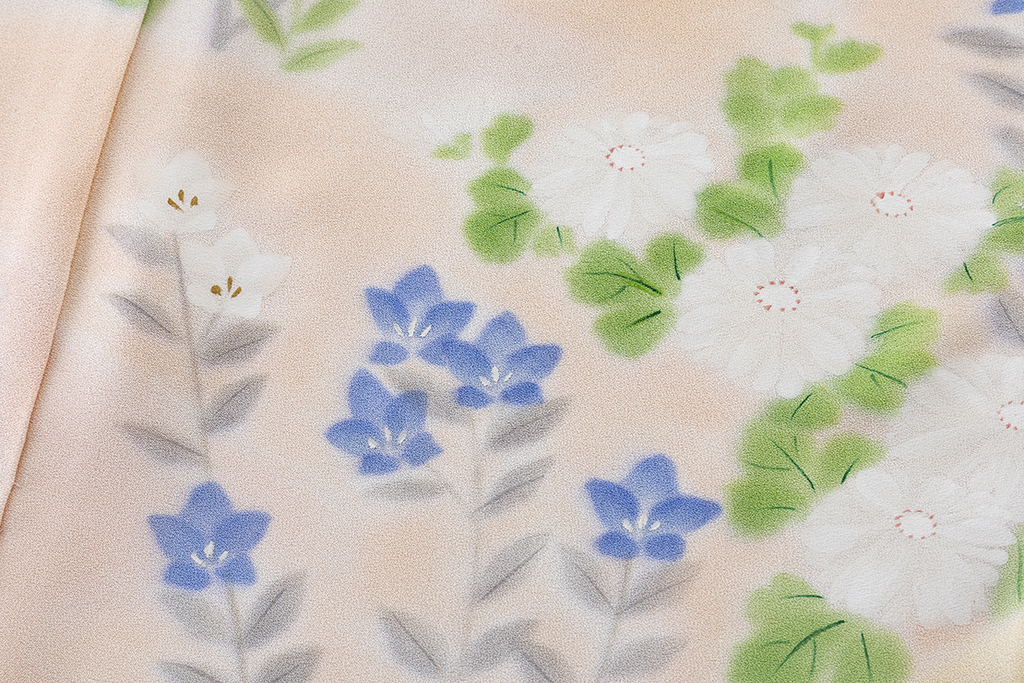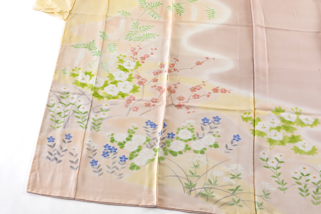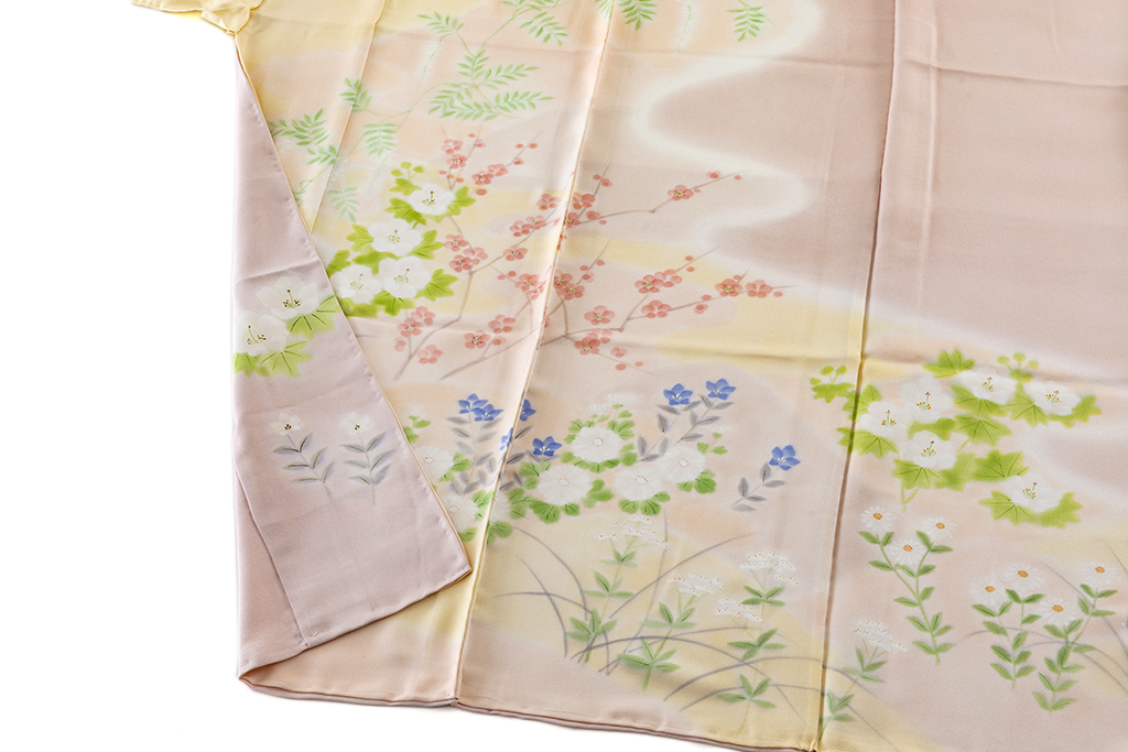 桜色、乙女色、麹色の柔らかな暈しの地に、優しい彩りで、桔梗や梅、菊、藤などを鮮やかに描き出した、柔らかな無線友禅の滲み、草木の温かな表情が、はんなりと美しい着姿を演出するに志山染匠製 無線友禅 訪問着地です。