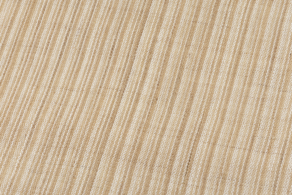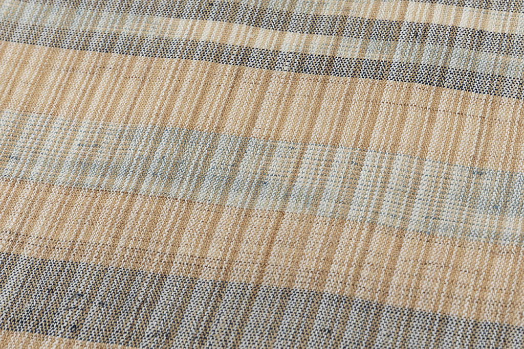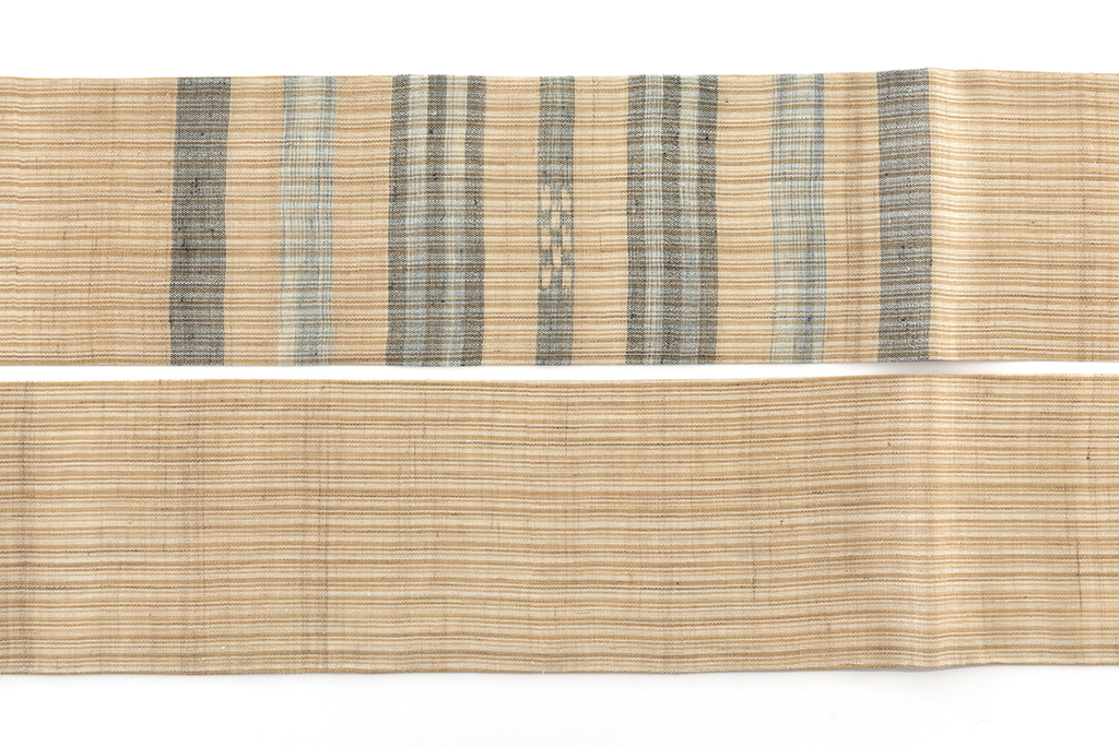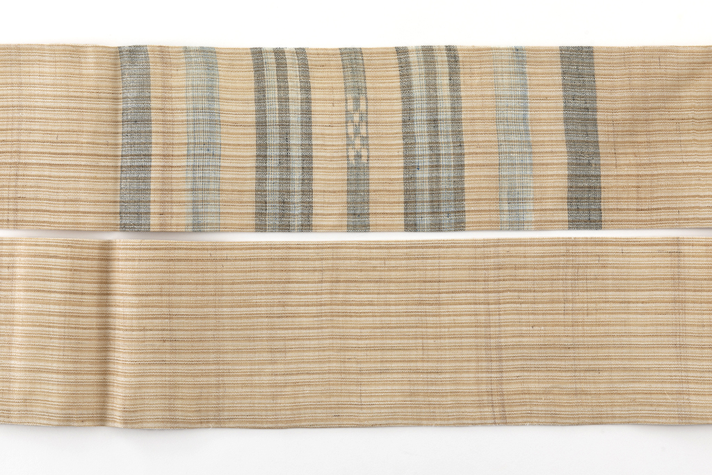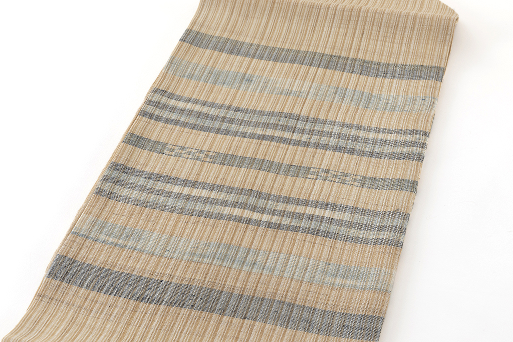 軽くしなやかな宮古上布の地に、優しい胡桃色の縦縞を織り出し、呉須色と瓶覗の柔らかな彩りで横段を織り出した、細い苧麻糸がもつ穏やかな表情に、涼やかで滑らかな手触りが心地よい、下里愛子さん作 宮古上布 九寸名古屋帯です。