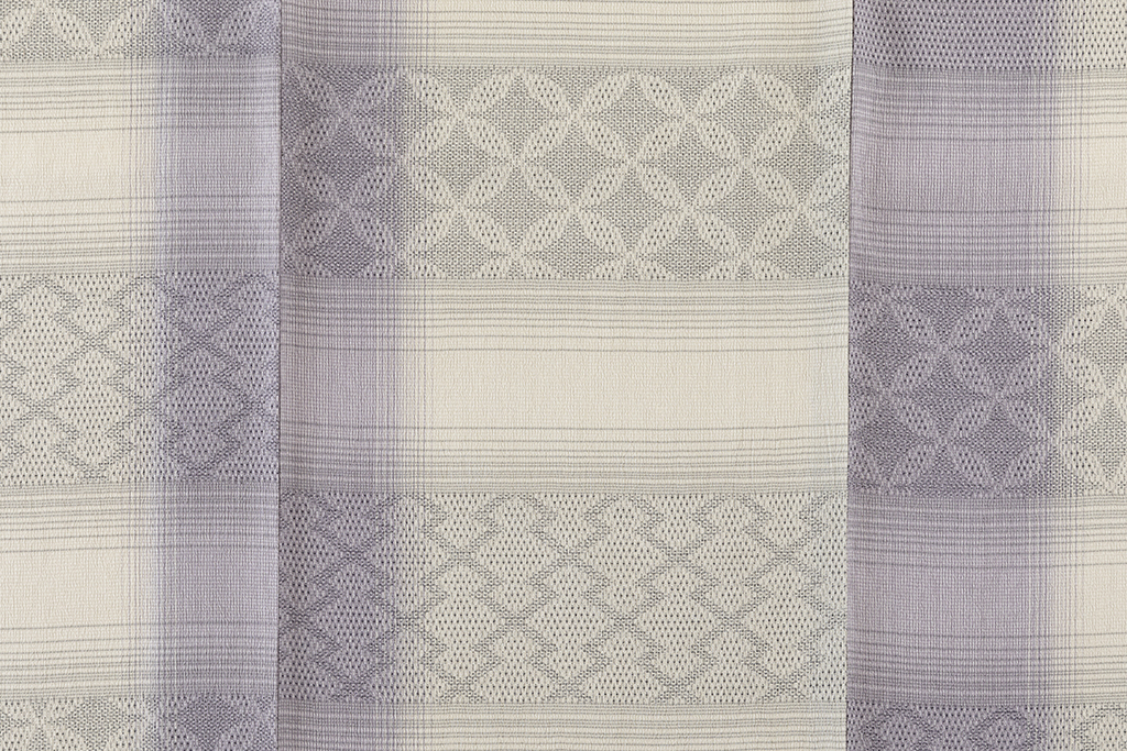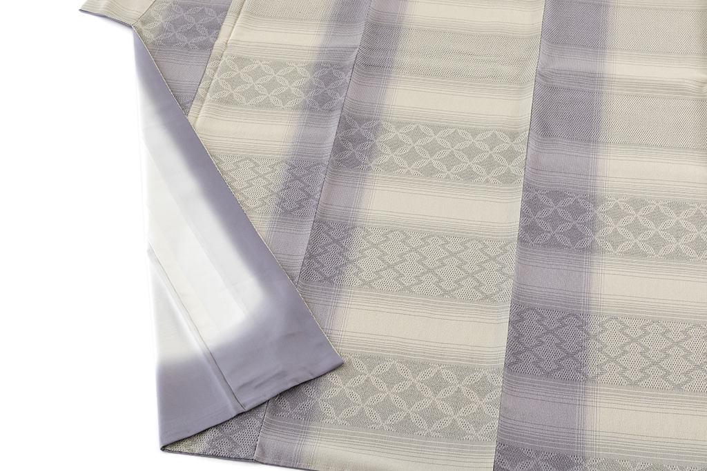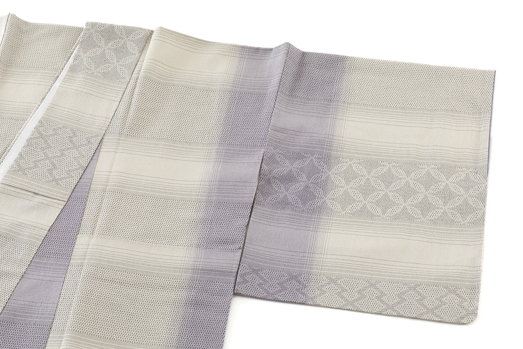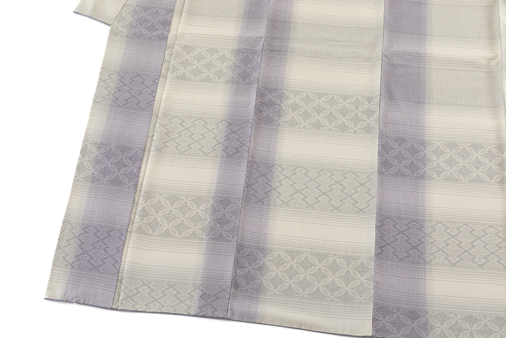 柔らかな白練に浅滅紫を配した地に、板締め技法による細かな蚊絣と亀甲を用いて、連なる幾何文や七宝文様を横段に織り出した、艶やかな色彩感が美しい着姿を彩る、独特のシボ感とさらりとした風合いが心地よい、白鷹お召し 訪問着です。