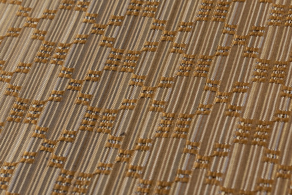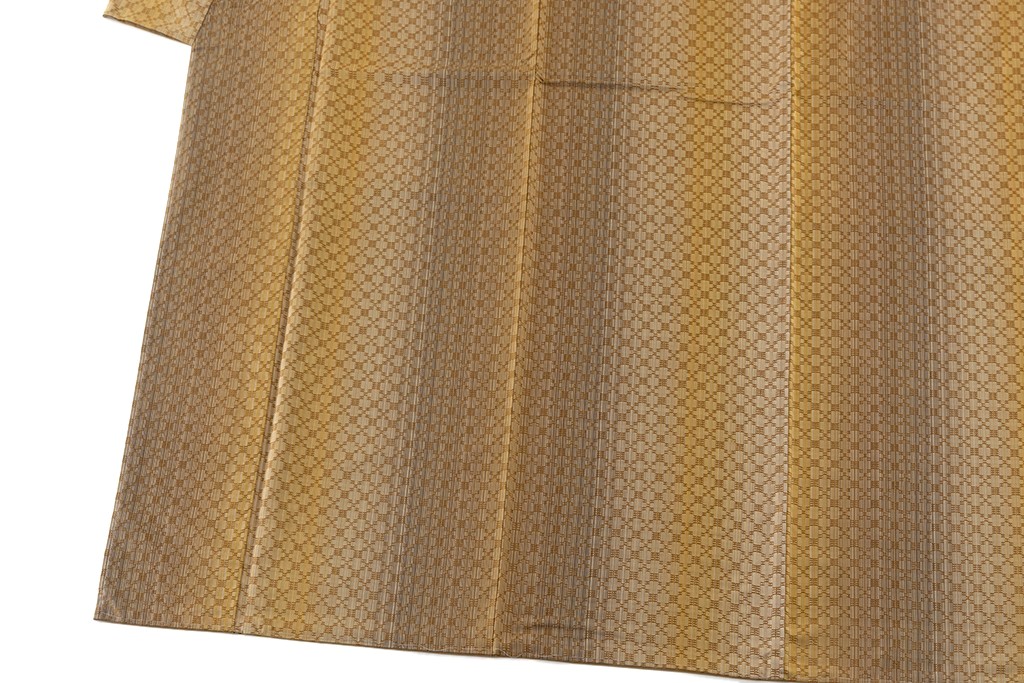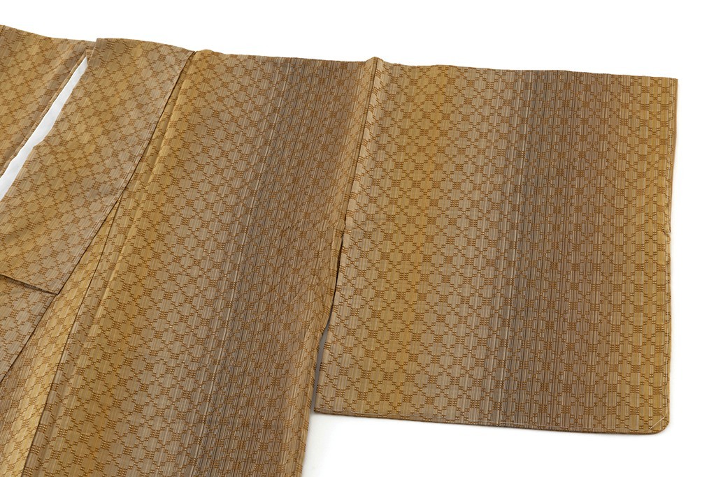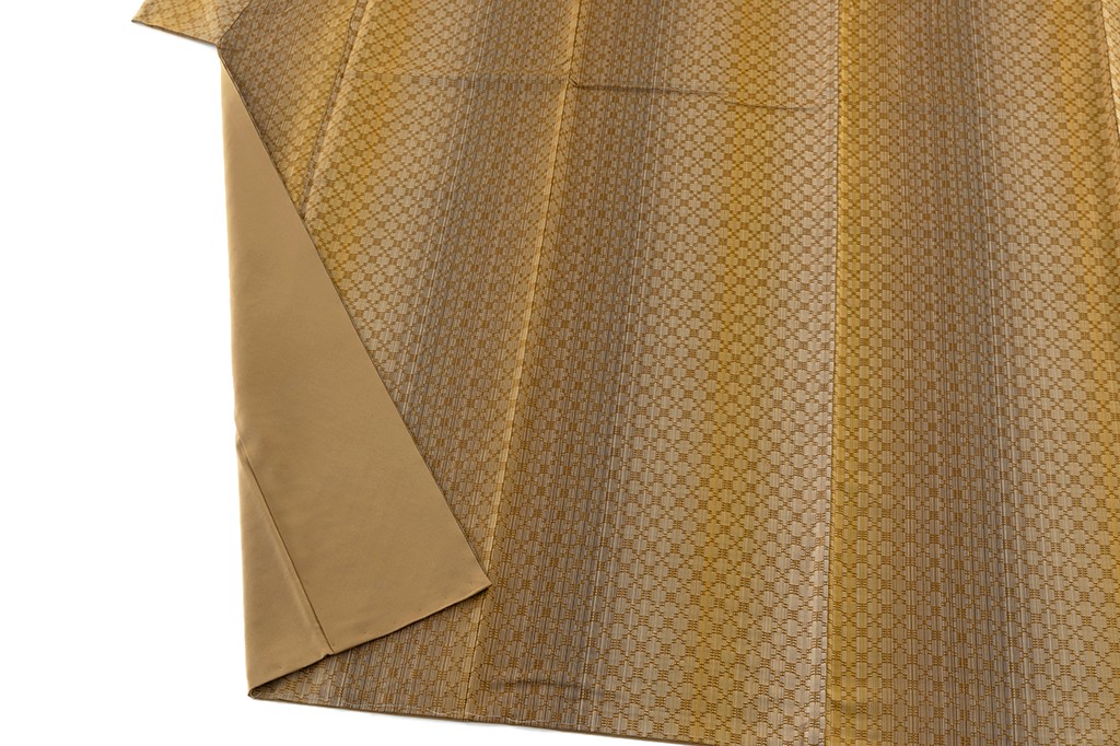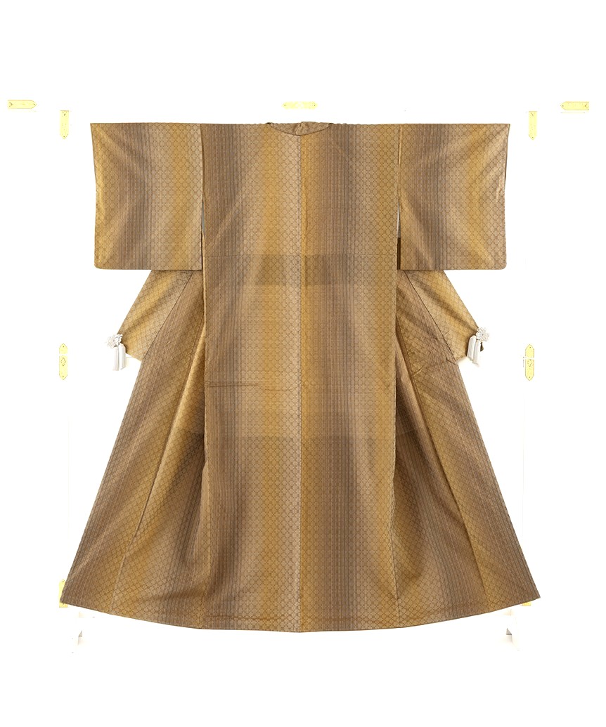 美しく艶やかな、山梅色、錆利休、枯野のグラデーションに、精緻な花織を端正に織り出した、花織の凹凸による光沢や陰影が、織り重なる色彩とともに洗練された景色を写し出す、気品豊かな秋山眞和さん作の花織 紬訪問着です。