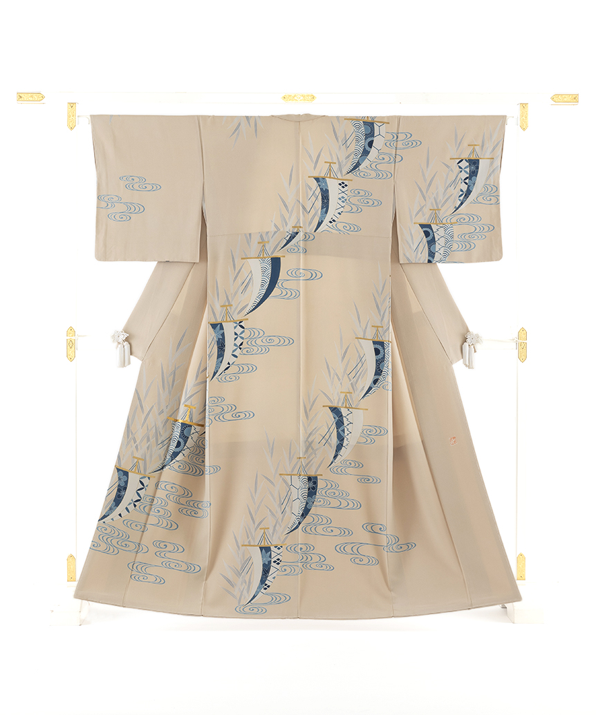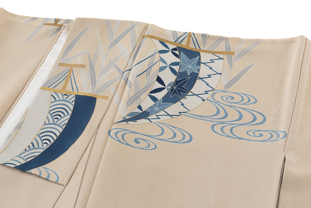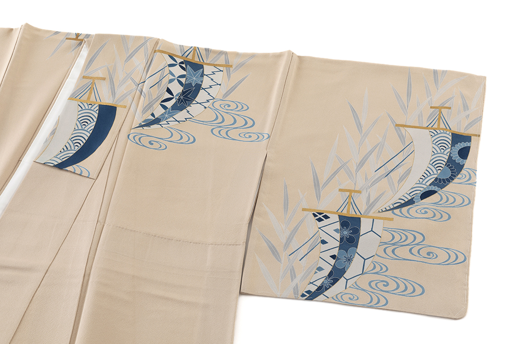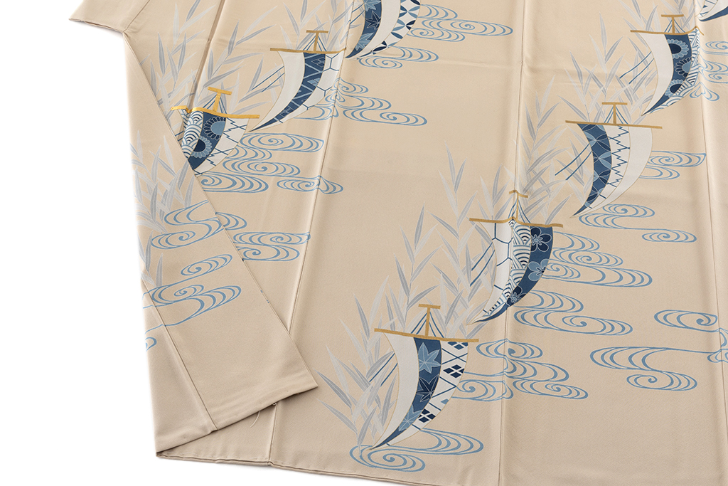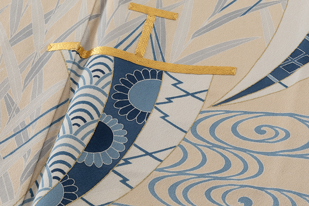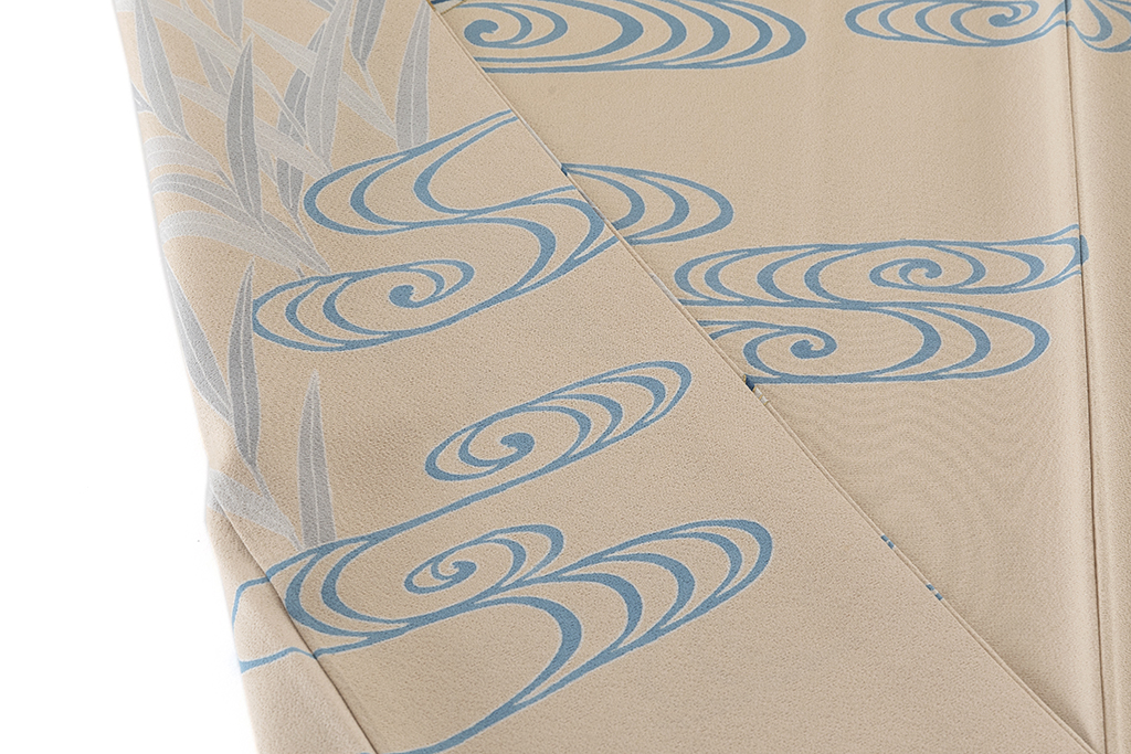 蕎麦切色の地に、揺らめき流れる流水の傍に生い茂る瑞々しい露草の葉を描き、青海波などの吉祥文様ともに菊や梅、紅葉などで彩られた布地が他靡く、和やかな情景を美しい藍の濃淡、煌めく金彩で描いた田畑喜八さん作 訪問着です。