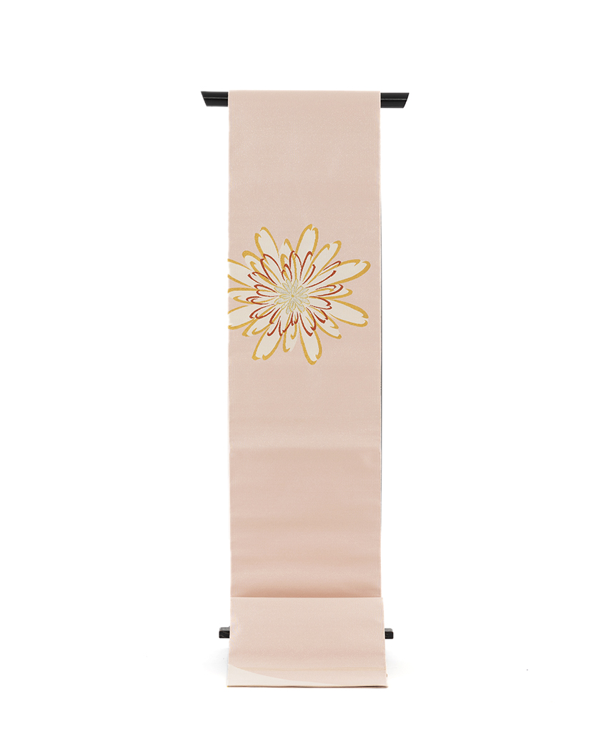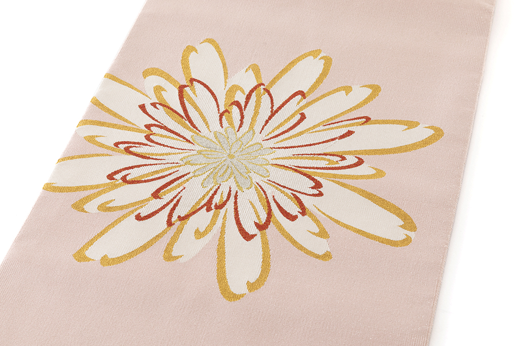 淡い曙色の綴地に、森口華弘さんの意匠である満開に咲く花を、金糸、銀糸を用いて、力強く大胆に織り出した、丹念に打ち込まれた細く強い綴れ糸を綿密な卓越した織技で織り込んだ、華やかな意匠の中に、漲る生命力、溢れ出す迫力を感じる、格調高い人間国宝 細見華岳さん作 森口華弘さん意匠の綴織 袋帯です。