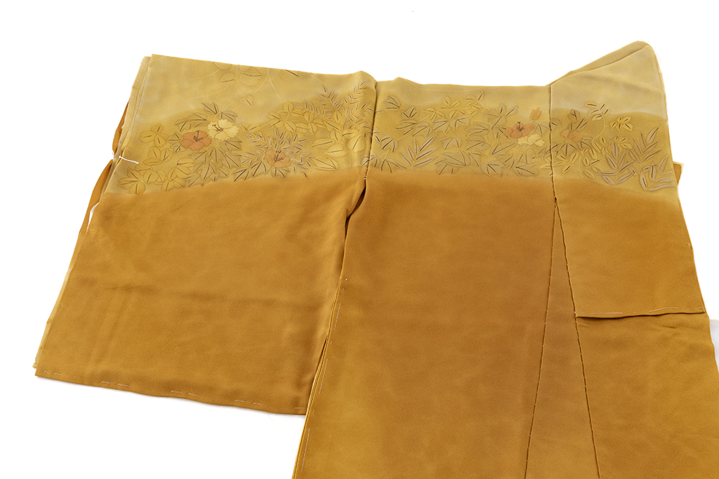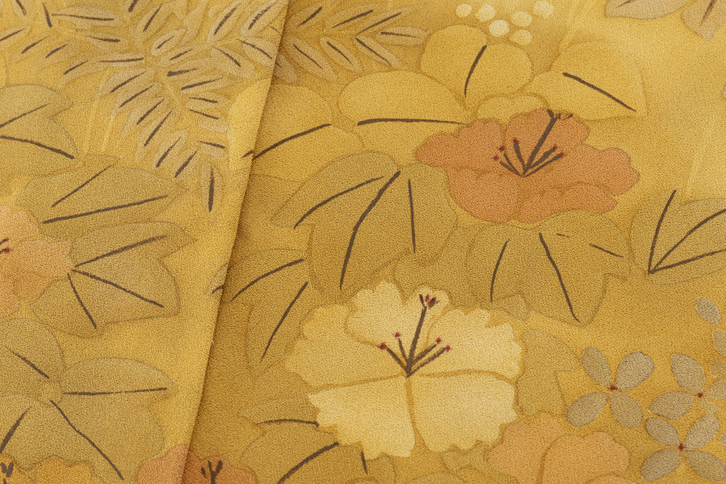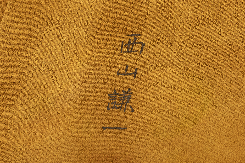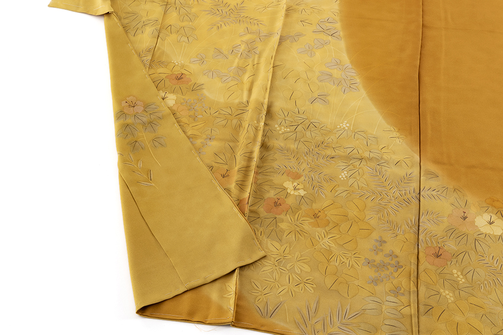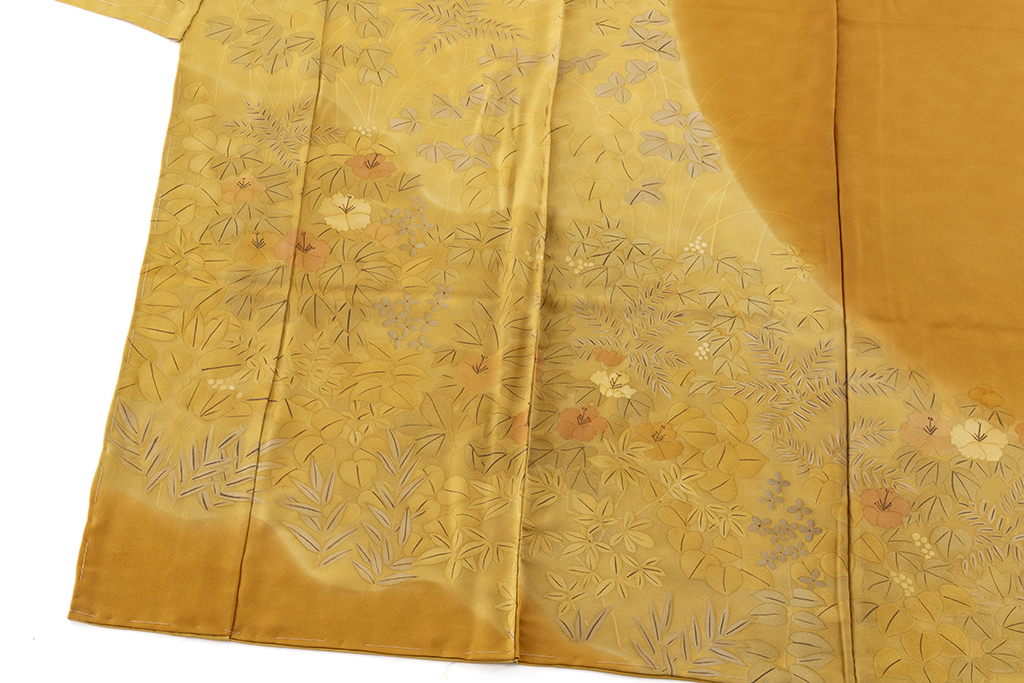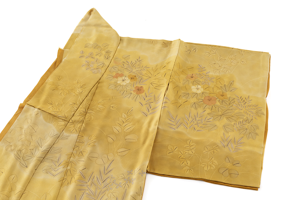 狐色と麦藁色の地に、糸目を用いずに生地に図案を描いて染める技法を用いた、輪郭線のない淡く澄んだ描線で、野に咲く可愛い草花を描いた、無線友禅作家 西山謙一さんの柔らかく温かな風合いの無線友禅訪問着地「草むら」です。