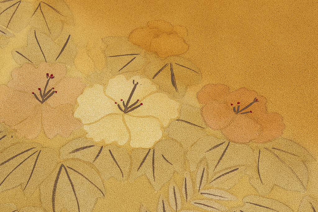 日本画のような気品ある味わいと重厚さを表現するために、同じような工程を施した独自の技法で糸目を用いず直接、生地に図案を描いて染める技法で大変高度な技術が必要となります。