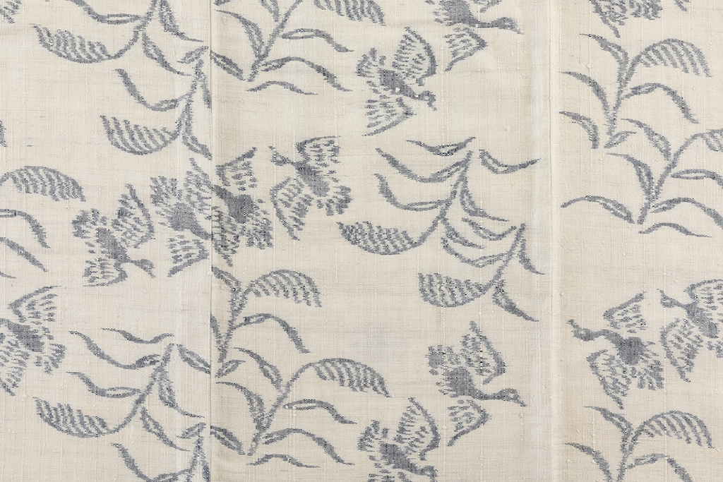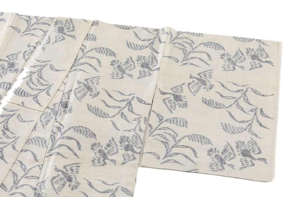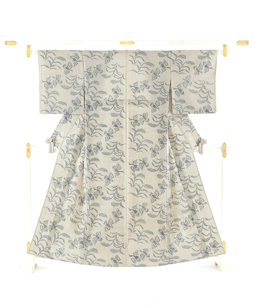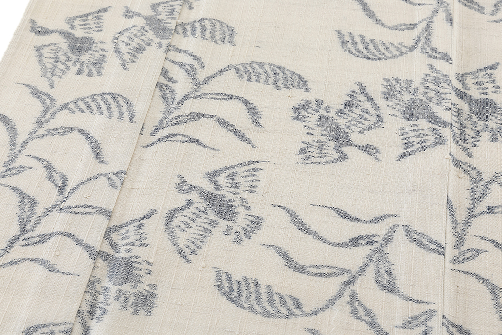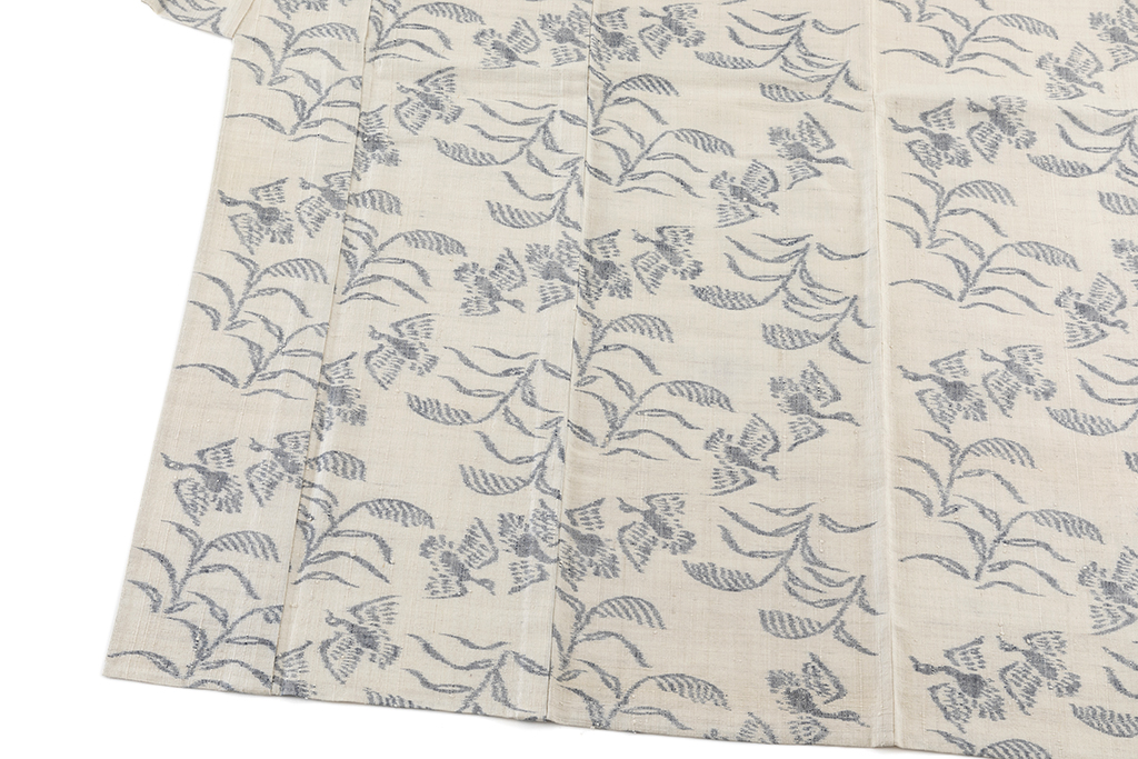 柔らかな胡粉色の縦節つむぎ地に、羽を広げ宙を舞う小鳥たち、緩やかな風に靡く草葉を表現した、野趣豊かな景色に際立つ節が味わいを深める、浦野理一さん作 縦節紬 着物です。