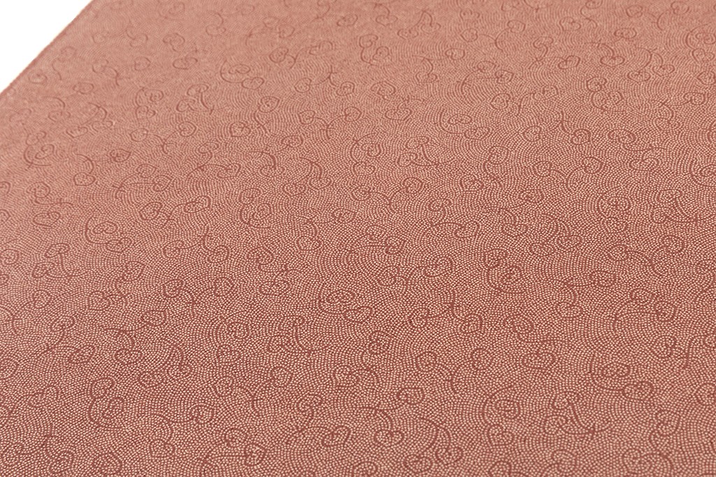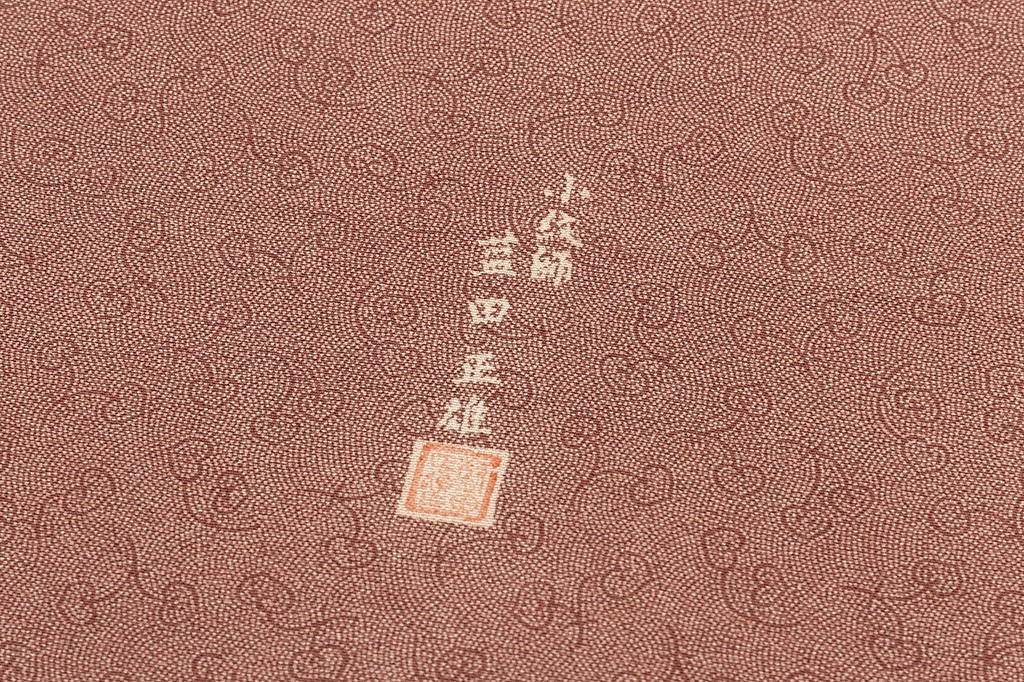 栗梅の地に、可愛い丸みを帯びた葉をつけた葵を細やかに配した、精緻でありながらも、一つ一つの模様に微笑ましい表情や個性を感じる、細かな型に熟練の技が光る、気品豊かな日本工芸会正会員 藍田正雄さん作 江戸小紋 着尺です。
