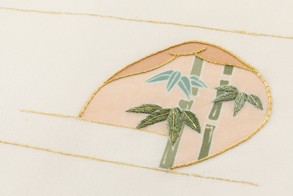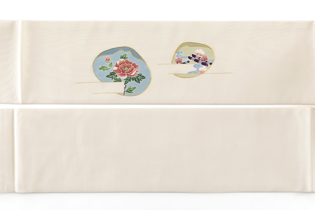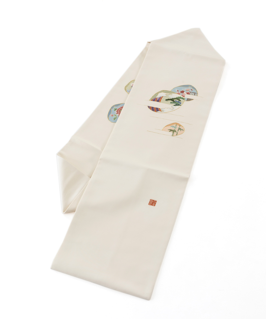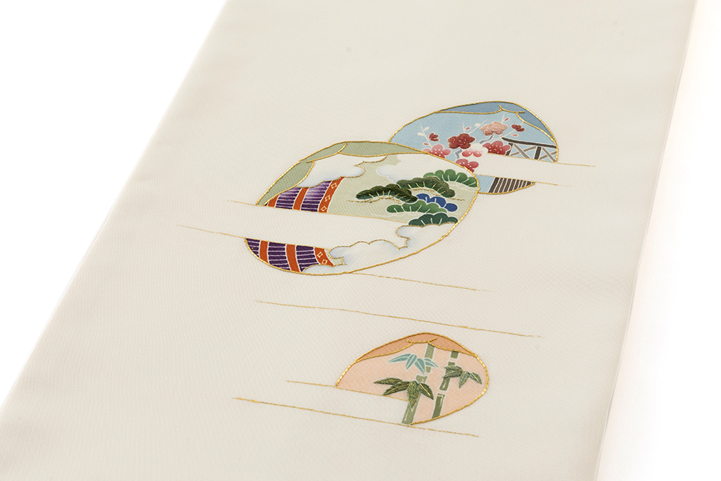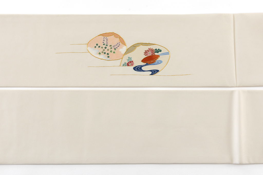柔らかな乳白色の塩瀬地に、竹や松、梅、牡丹、桐などを和やかな情景とともに映し出した貝合わせ文様を描いた細やかな刺繍、柔らかな色彩が表情に奥行きをもたせ、繊細な金駒刺繍が優美な風合いを引き立てる染繍工芸大羊居製 塩瀬九寸名古屋帯です。