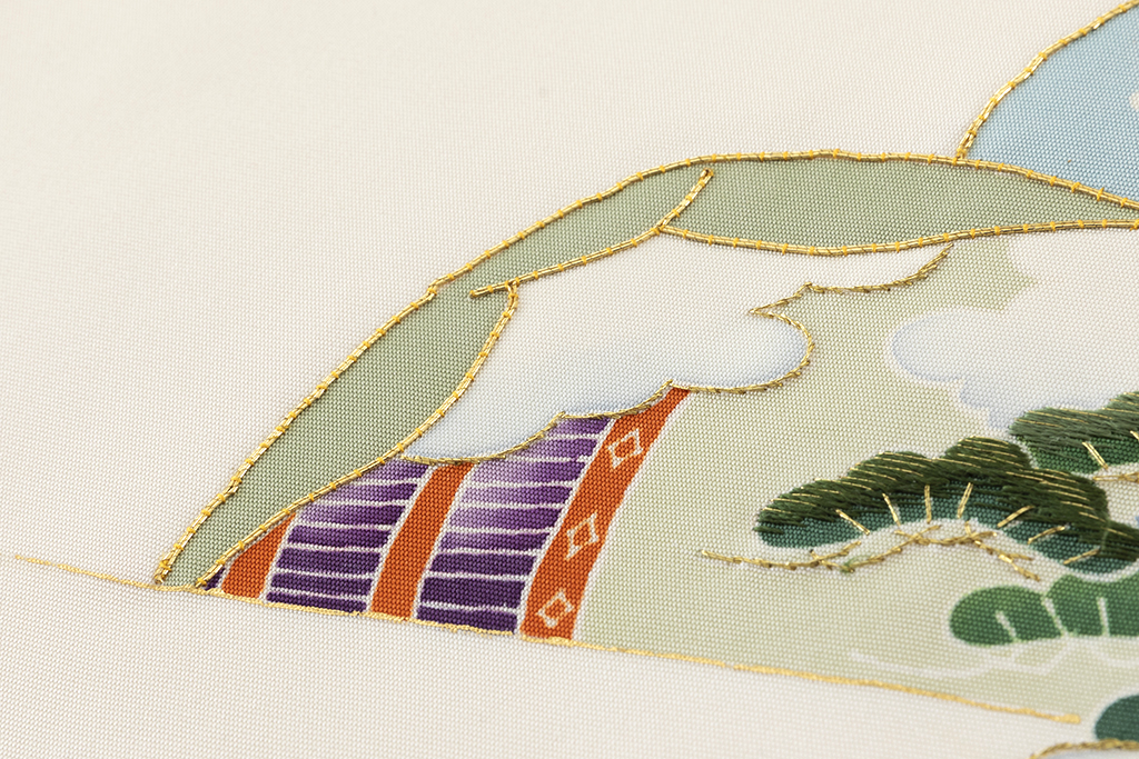 友禅染は、柄の輪郭を「糸目糊」で描くことで染料の滲みやはみ出しを防ぎ、繊細な色彩表現を可能にしています。