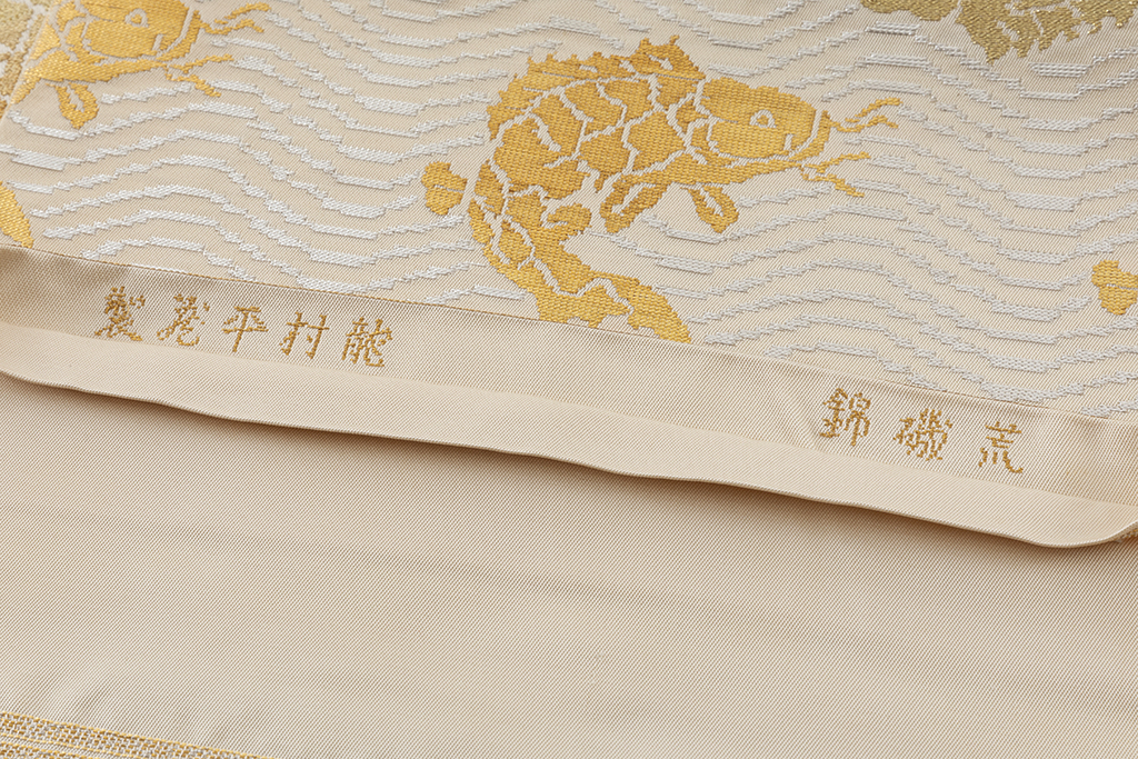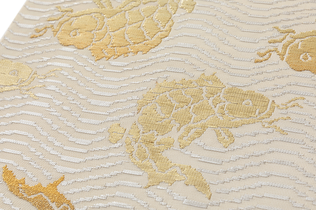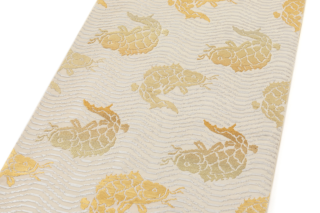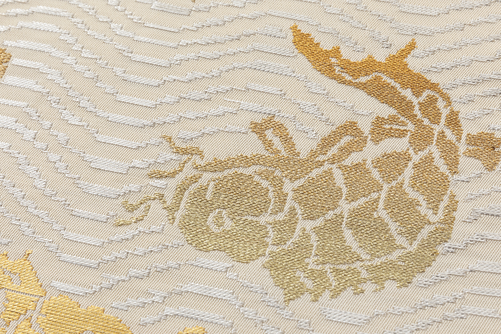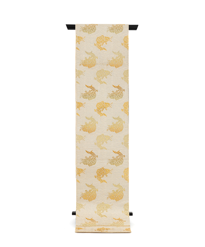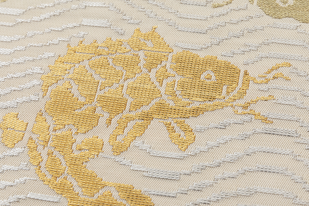 素色の地に、煌めく金糸、銀糸で、波間で激しく躍り泳ぐ鯉を力強く織り出し、繊細な表情を緻密な織で表現した、龍村平蔵製 袋帯 「荒磯錦」です。