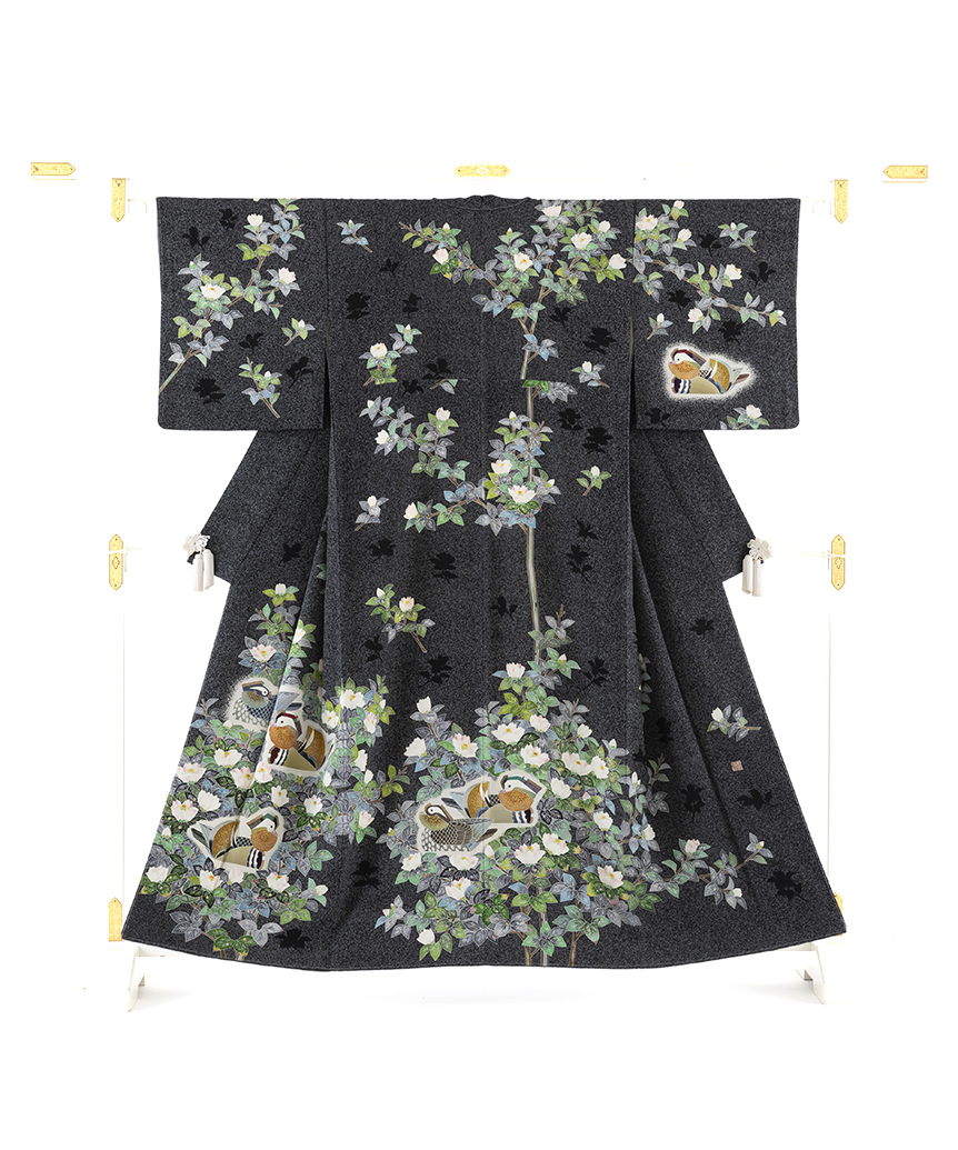 黒のたたき地に、仲睦まじく水面を泳ぐ6羽の可愛らしい鴛鴦たち、それらを囲むように美しく咲き、艶やかな花をつける蓮を描いた、繊細な糊置き、瑞々しい色彩感が上品な華やかさを彩る人間国宝 羽田登喜男さん作 訪問着「瑞鳥」です。