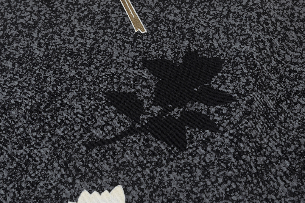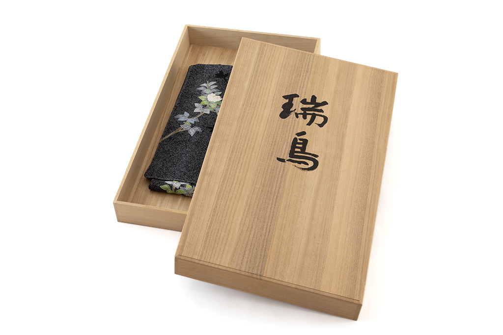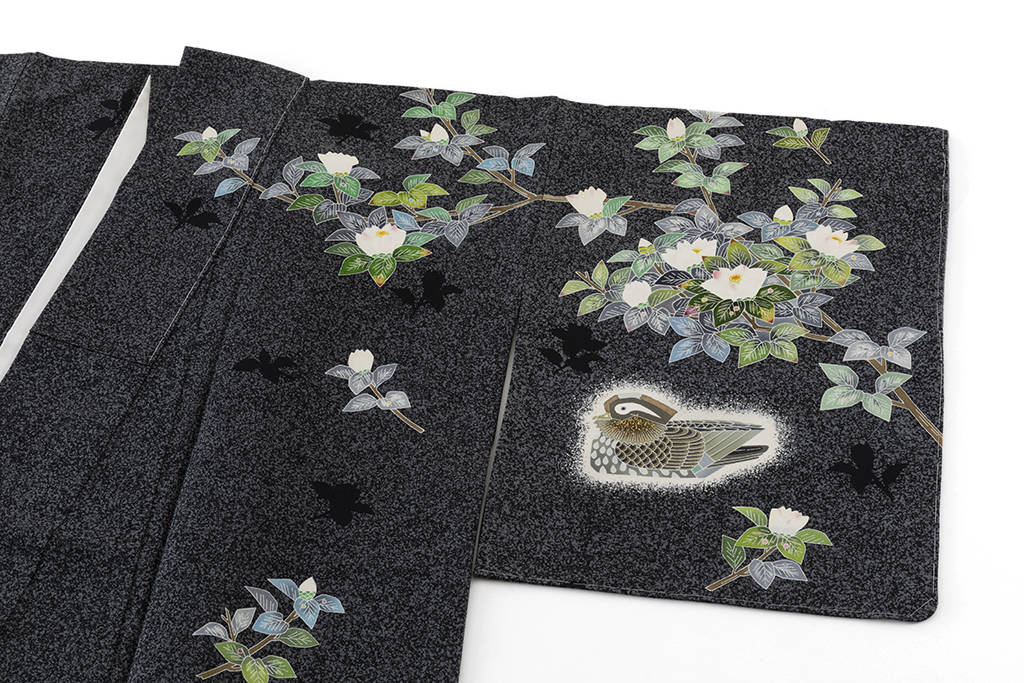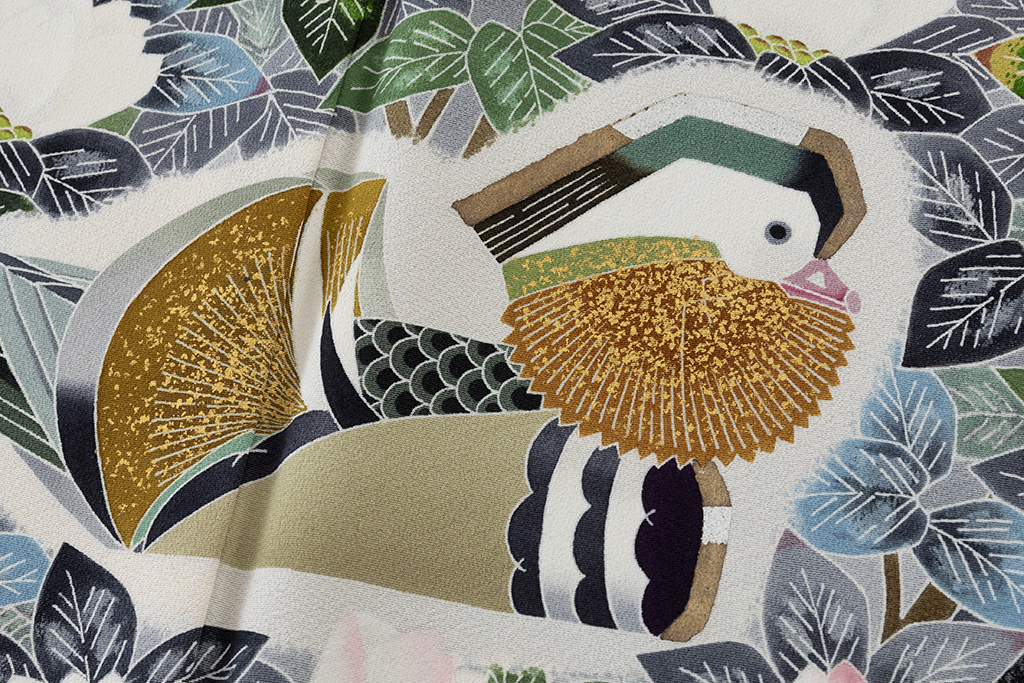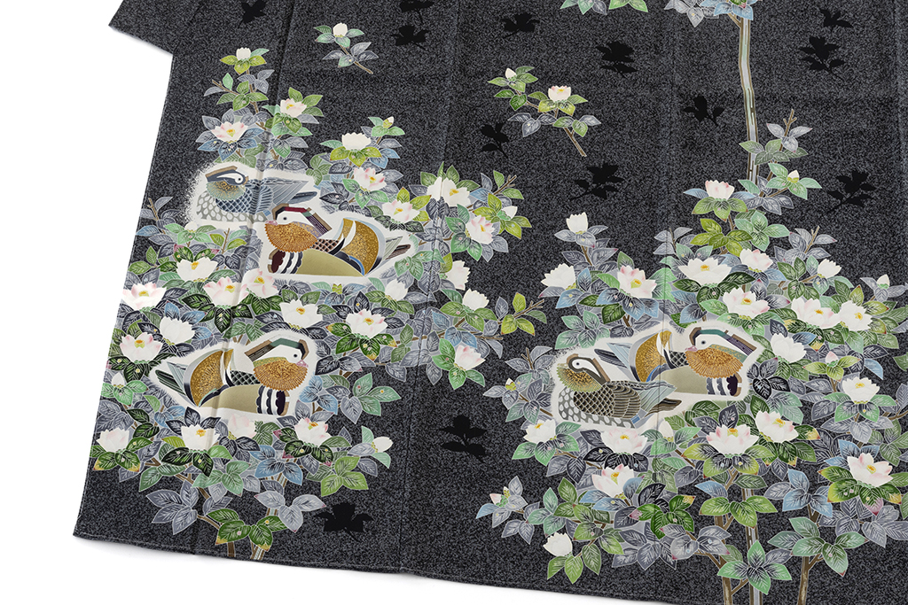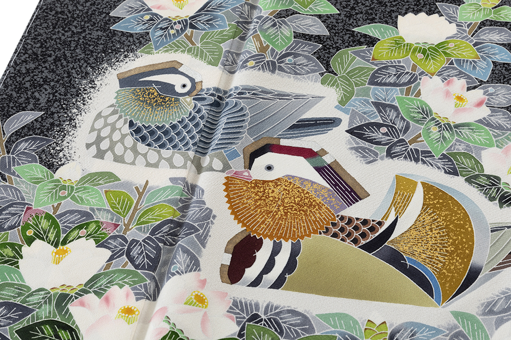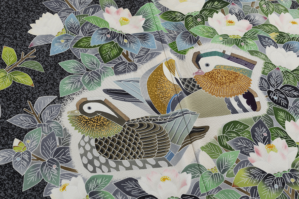 特に「鴛鴦(おしどり)」の文様は、羽田登喜男氏を代表する人気の作品で、「鴛鴦」を生み出すために、文様の部分を白く残して染め上げる白揚げや、細かい粉状にした金砂を接着剤で布地にまきつける金砂子のような加賀友禅の技法を用いました。