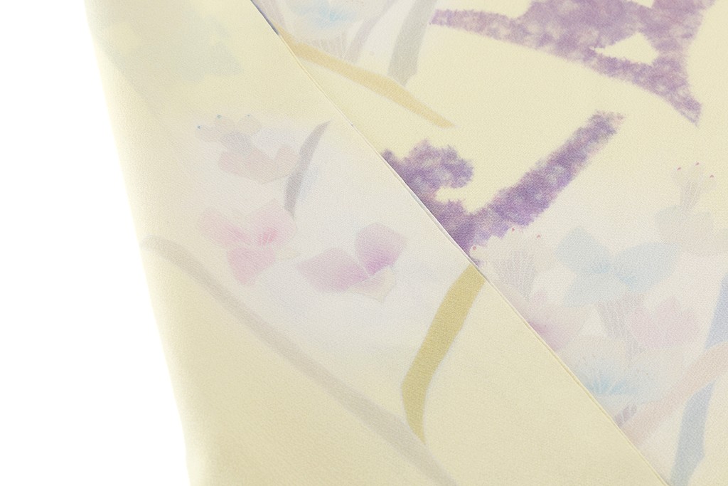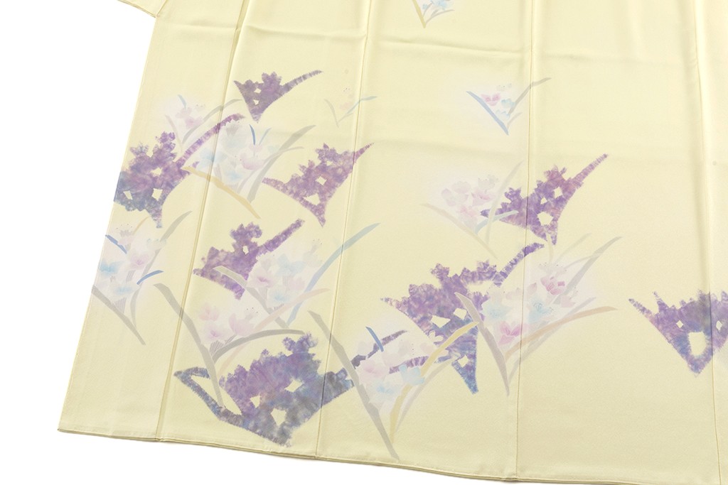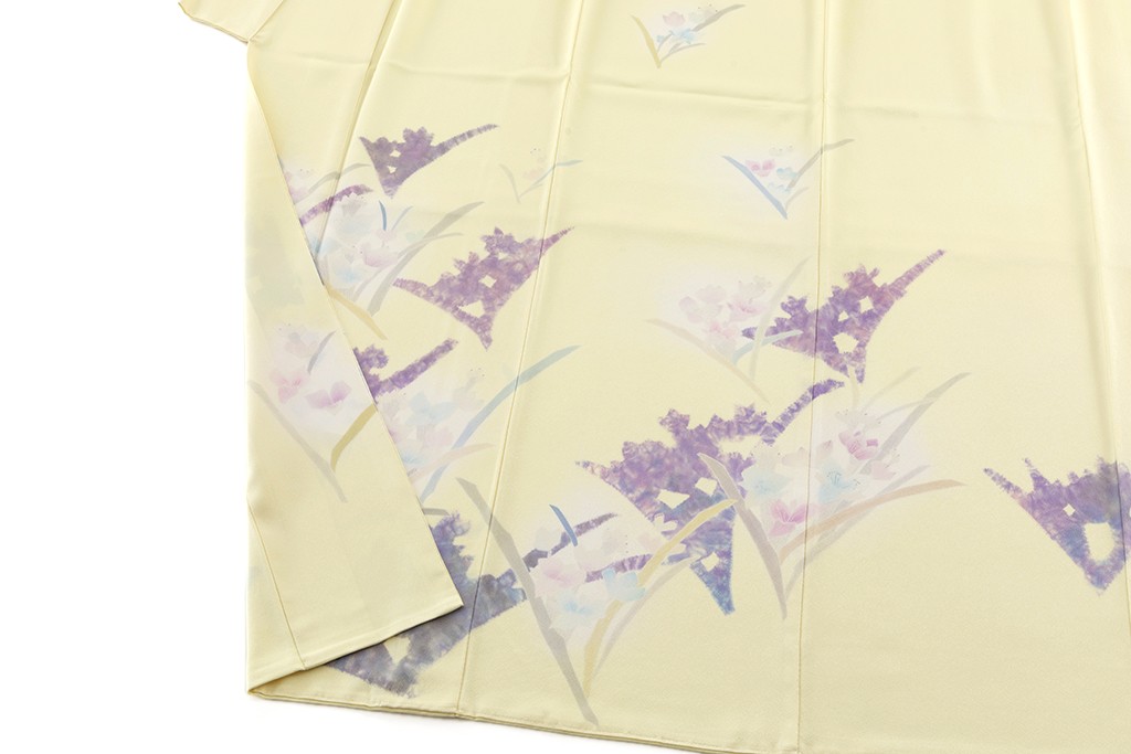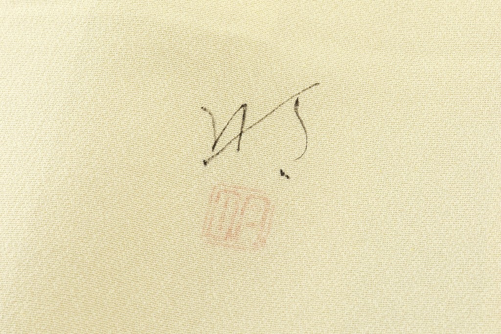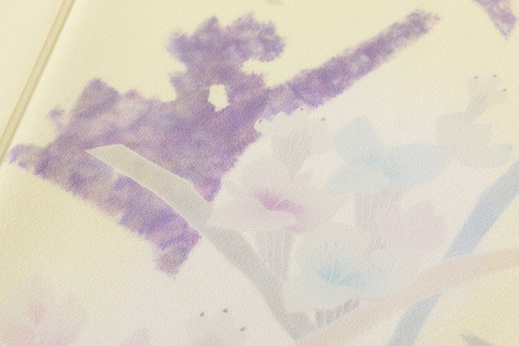 淡い淡黄色の地に、繊細な色差しで、凛とした草花を艶やかに描いた、優しく溶け合う様々な彩りが瑞々しい草花の美しさを引き立てる、透明感のある日本工芸会正会員 木原明さん作の訪問着です。