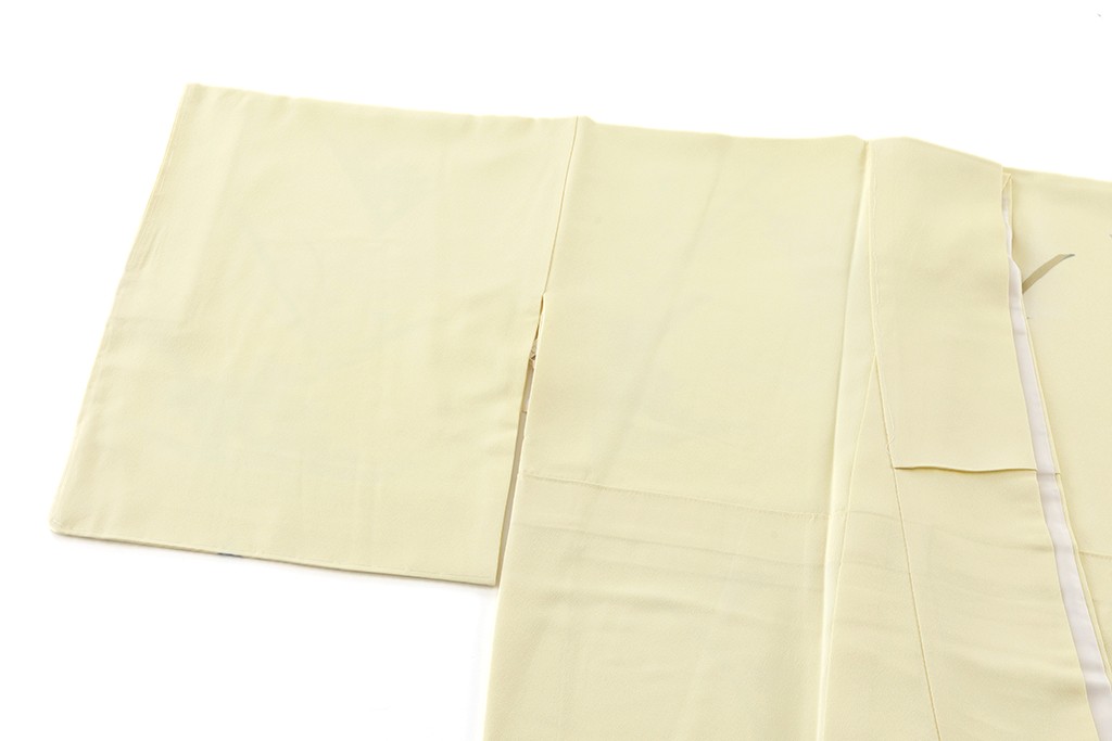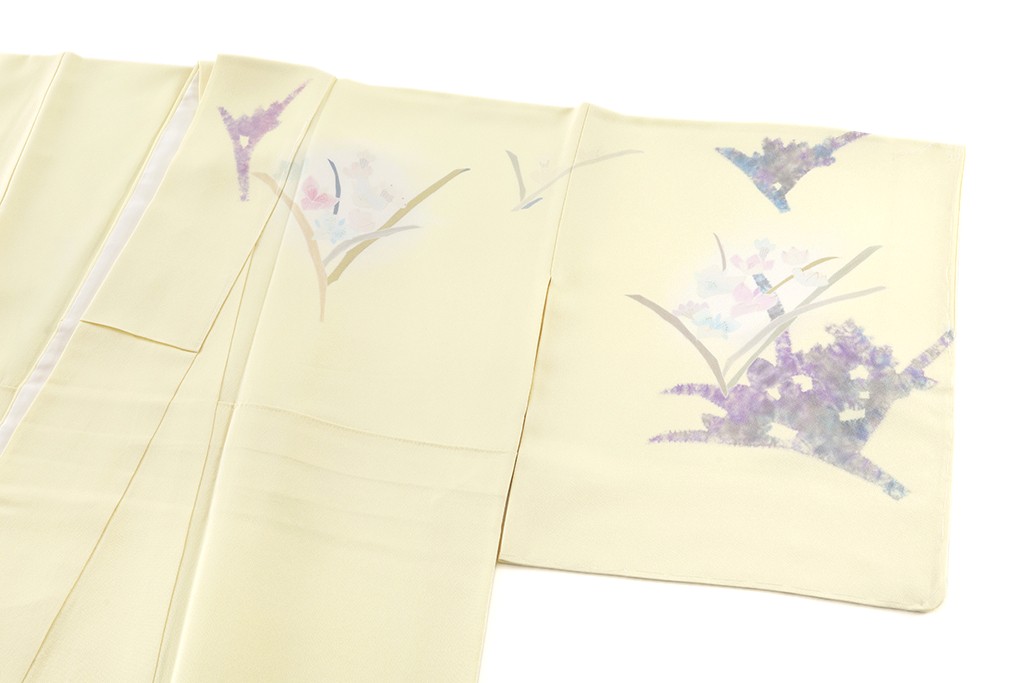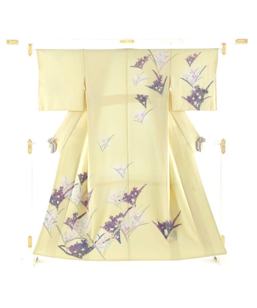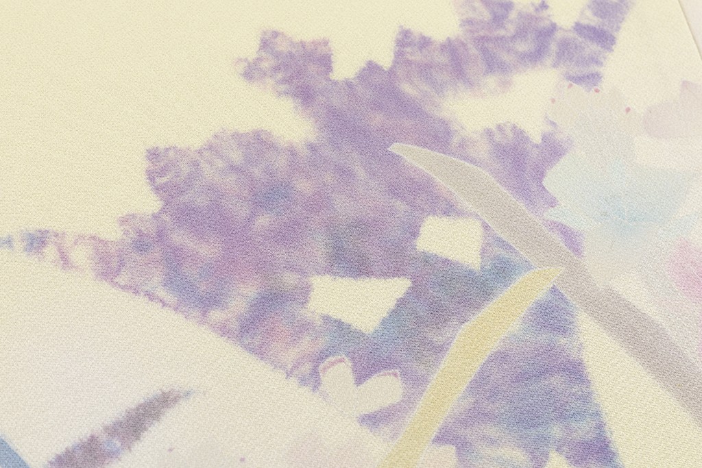 淡い淡黄色の地に、繊細な色差しで、凛とした草花を艶やかに描いた、優しく溶け合う様々な彩りが瑞々しい草花の美しさを引き立てる、透明感のある日本工芸会正会員 木原明さん作の訪問着です。