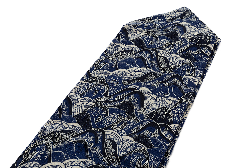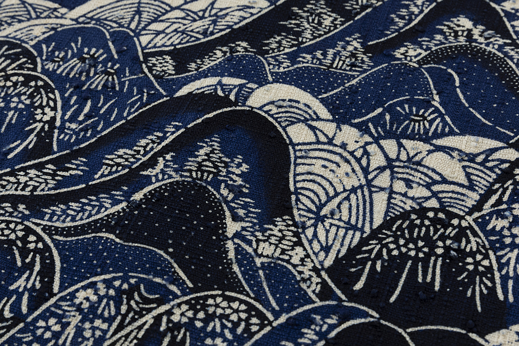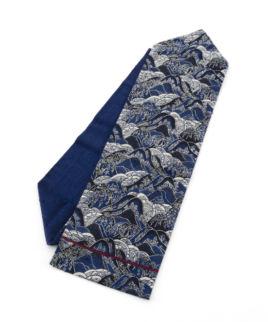 濃桔梗色の縦節紬地に、連なる山々をどっしりと力強い配色で描いた、壮大な景色に味わい豊かな節が際立つ、浦野理一作 縦節紬 九寸名古屋帯です。