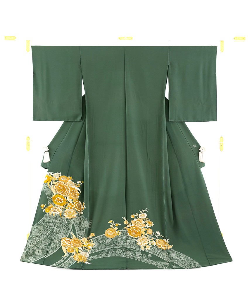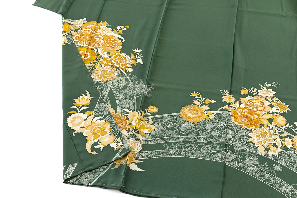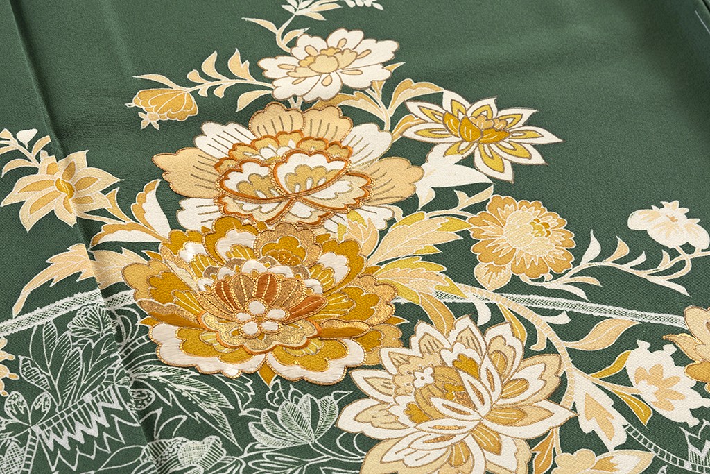笹色の地に、繊細な友禅に丁寧で綿密な刺繍を用いて、咲き広がる牡丹などともともに、花模様の輪を描いた、柔らかな色彩、力強い刺繍が上品な華やぎを感じさせる千總製 色留袖地です。