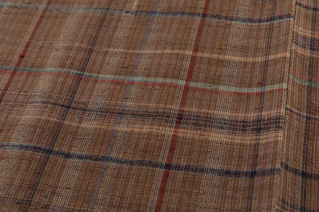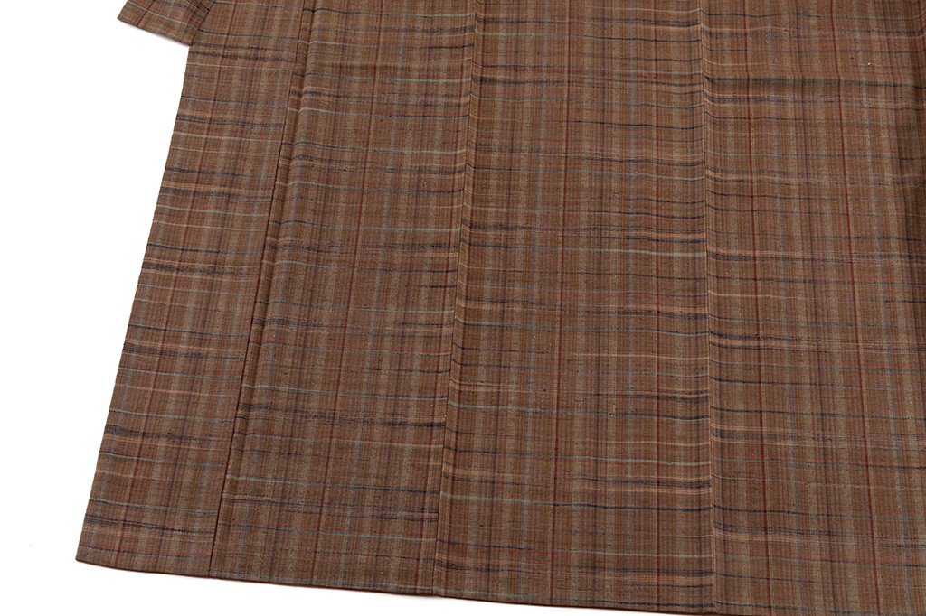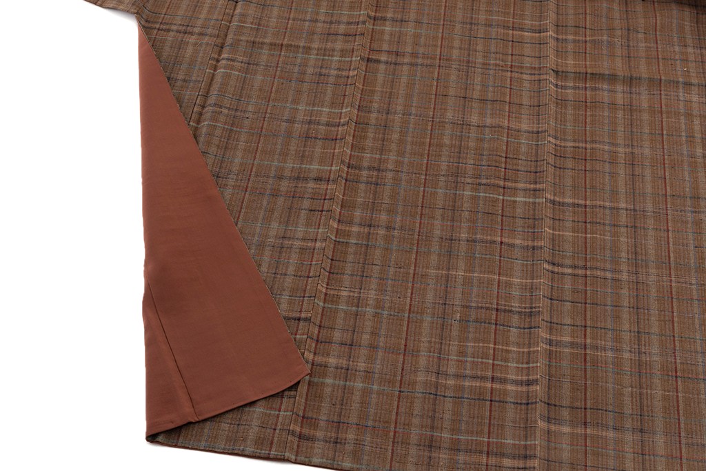 味わい豊かな脂色の地に、渋みのある海老赤や印度藍、勿忘草色、薄緑を経緯に配し、格子を織り出した、力強い質感に織り重なる多彩な彩りが、野趣豊かな風合いを生む郡上紬 着物です。