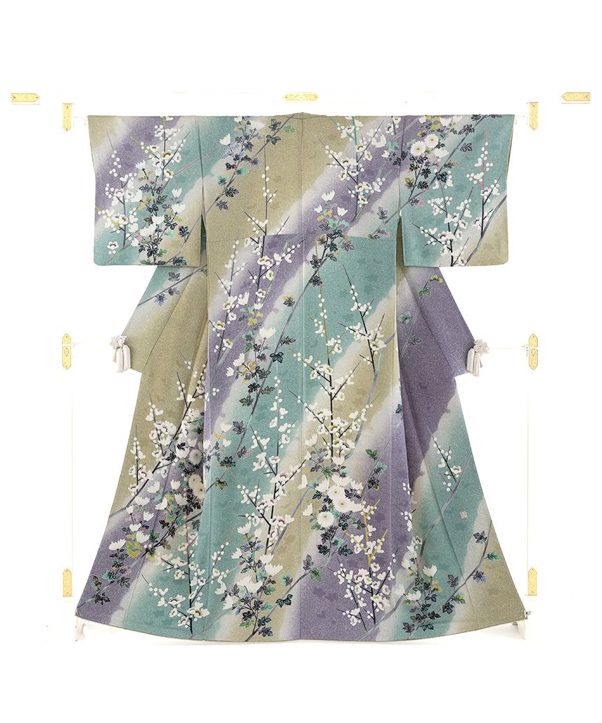 山藍摺、藤鳩羽色、裏柳を流れるように斜めに美しく染め出し、すらりと背を伸ばし可憐な花をつける菊や梅を艶やかに描いた、陰影豊かなたたき地に、美しく繊細な色彩感が際立つ人間国宝 羽田登喜男さん作 訪問着です。