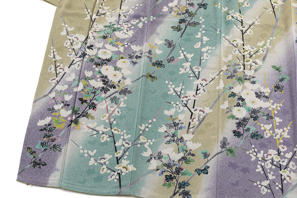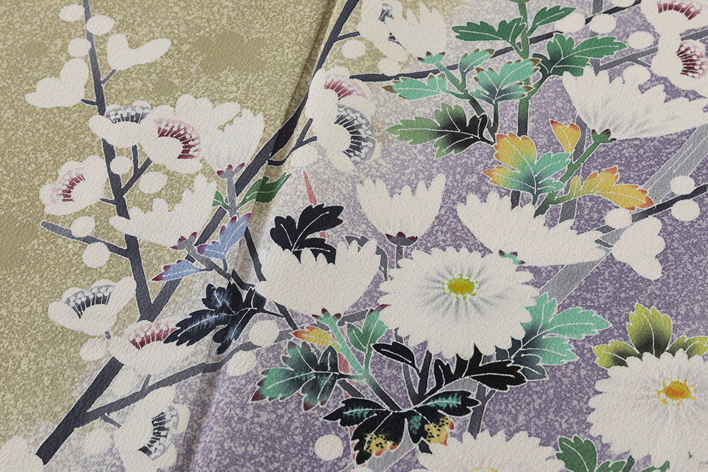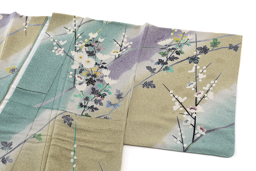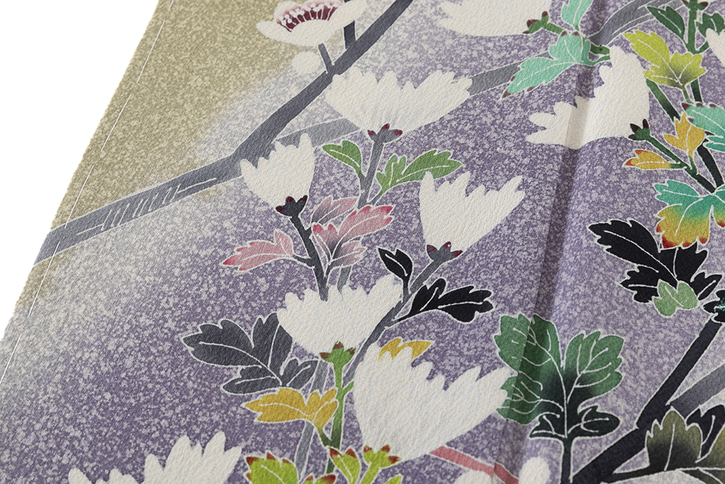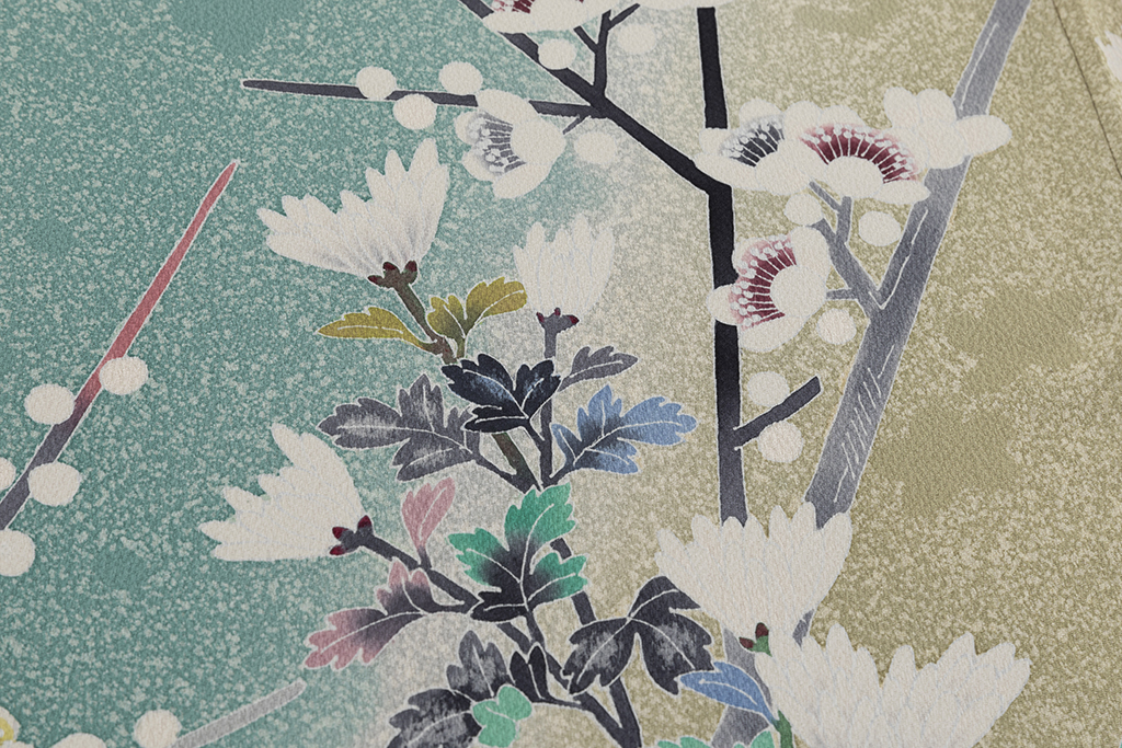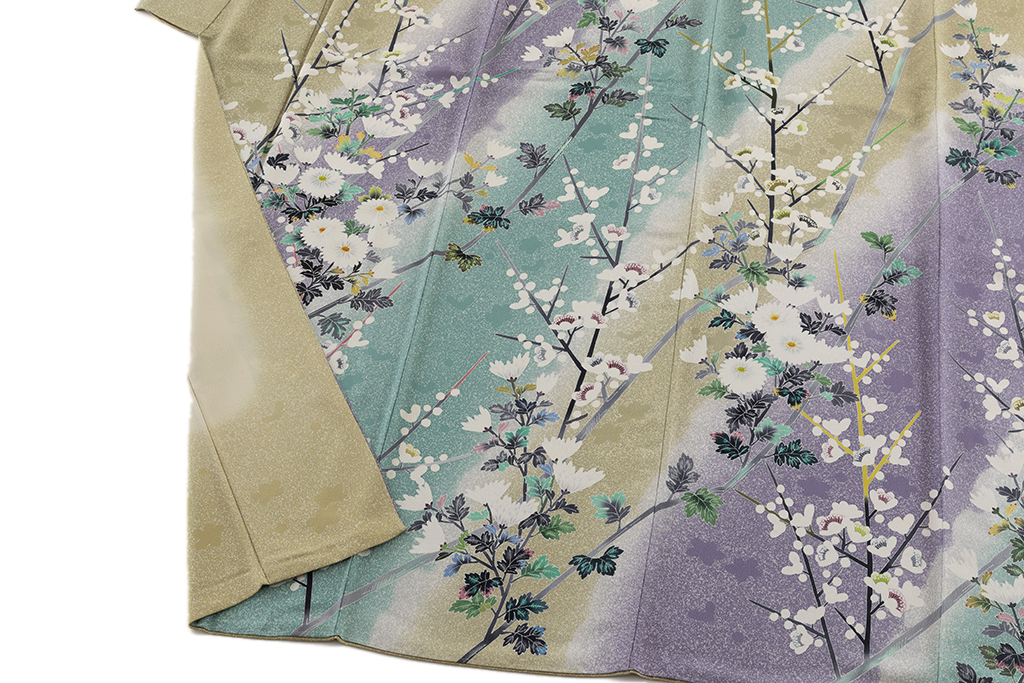 京友禅の特徴はやわらかい色合いと華やかさで、装飾には刺繍や金銀箔が多く使用されており、一方加賀友禅は自然の風景を写実的に描くのが特徴で、華やかさを演出する京友禅とは対極的なデザインです。