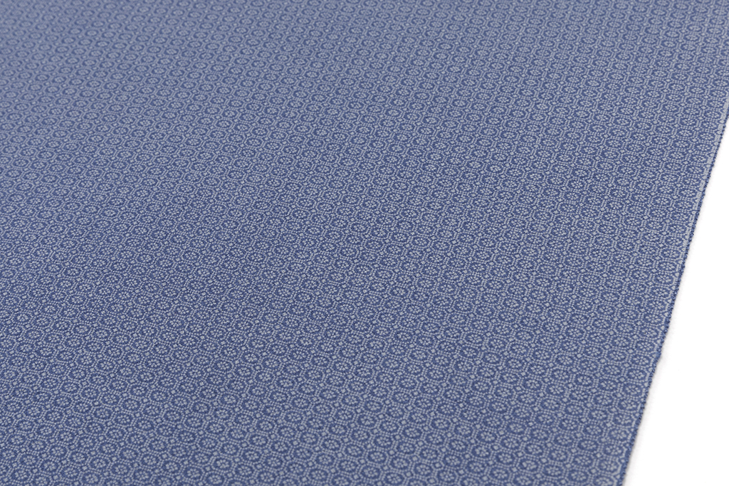 紺藤の地に、細かく区切られた縁取りの中に、極小の菊菱を描き入れた、極め細かく精緻な型に、熟練の技が光る、上質な品格の宿る人間国宝 小宮康孝さん作 江戸小紋 着尺 「菊菱入り隅切平角」です。