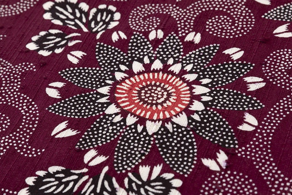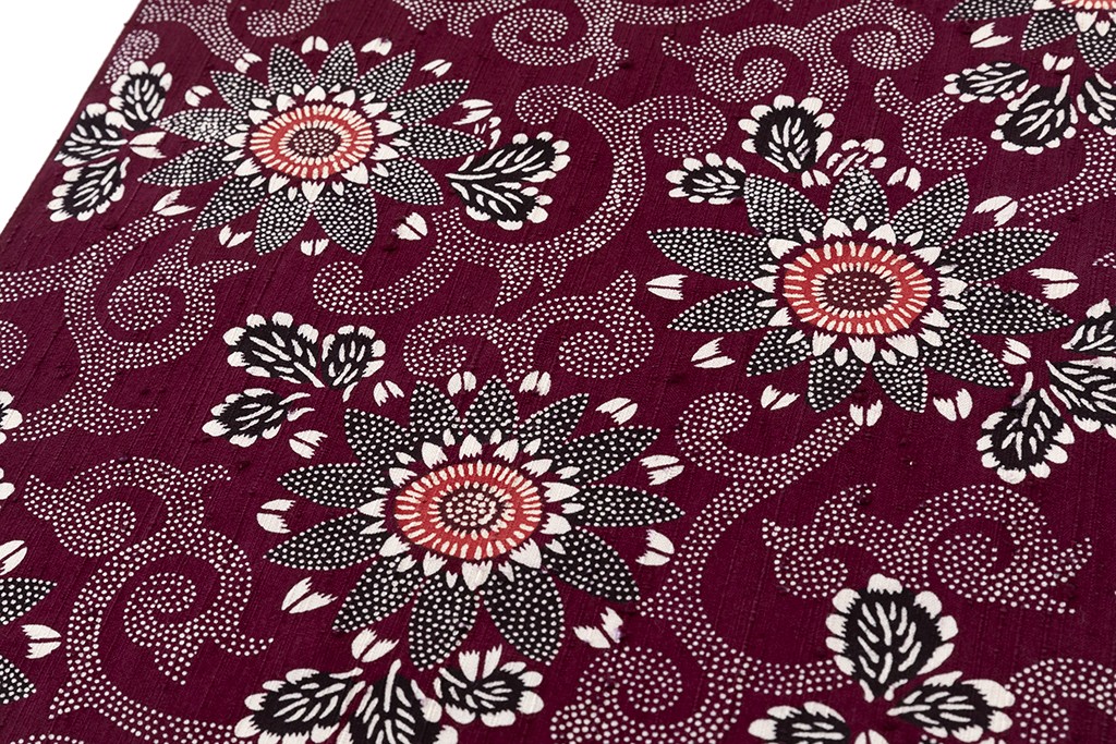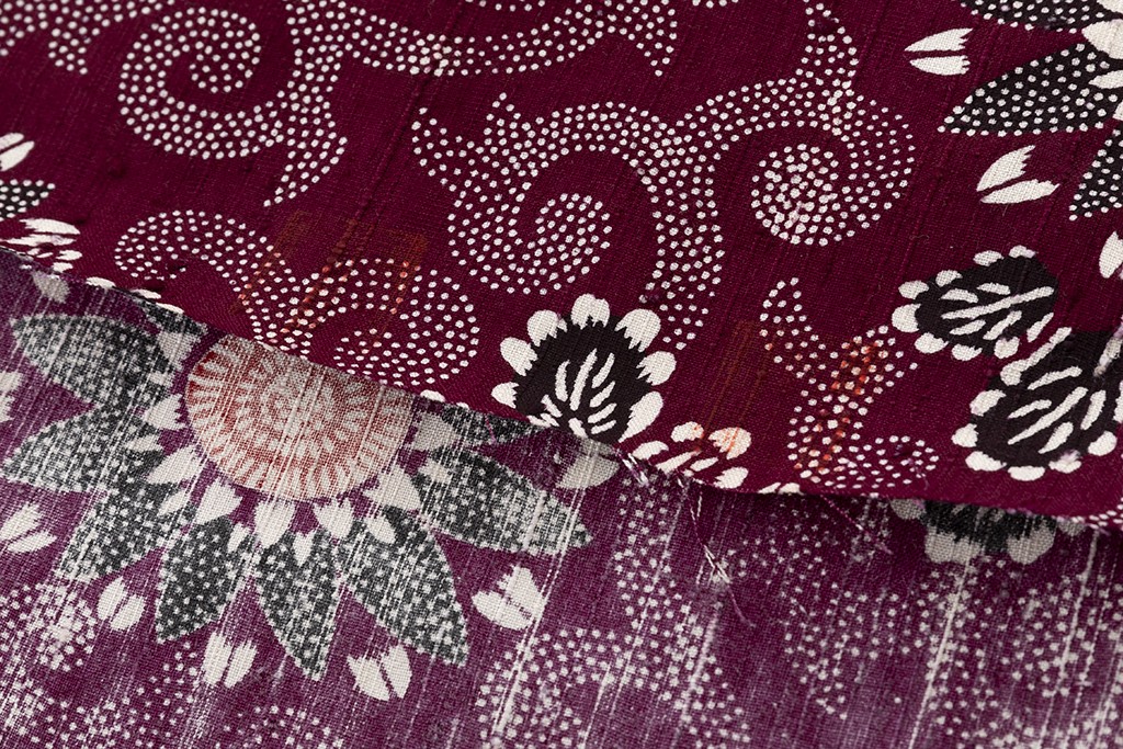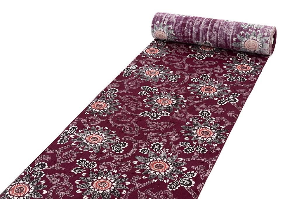 小紫の味わい豊かな縦節紬地に、花唐草模様を描いた、繊細な色彩感に斬新な意匠が引き立つ、浦野理一作 型絵染 縦節紬 着尺です。