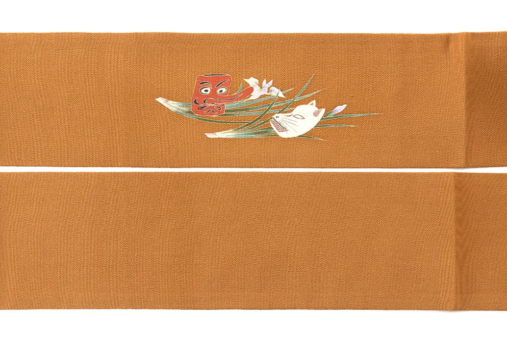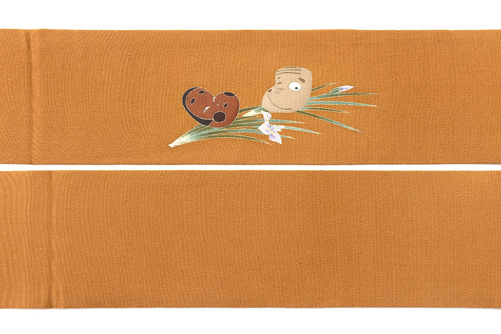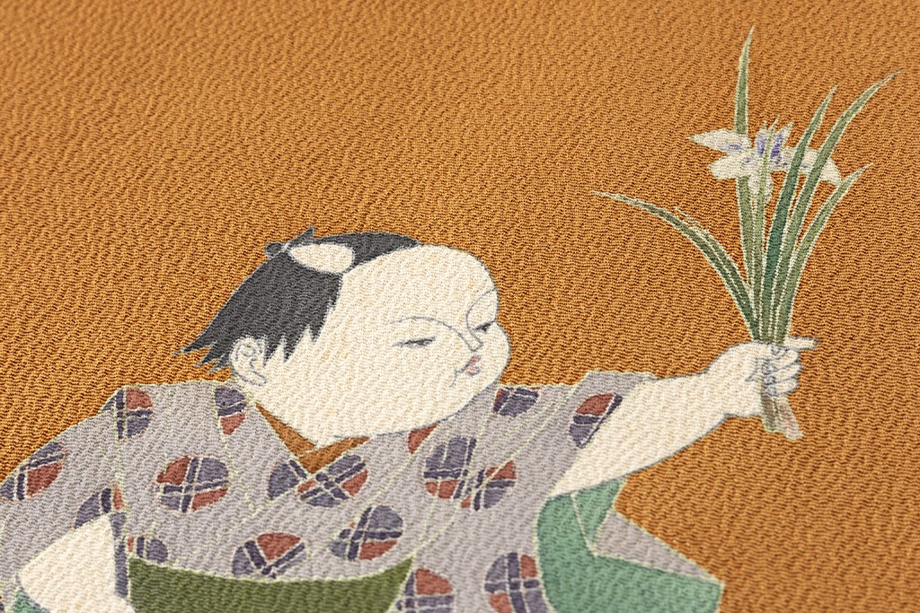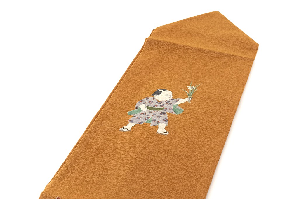 黄櫨染の縮緬地に、可憐な花を付けた菖蒲を片手に持ち歩く童を描いた、由水十久氏独特のうないの表情、しぐさ、動きが穏やかな彩りに洒落味を感じさせる初代 由水十久さん作 本加賀友禅 塩瀬九寸名古屋帯です。