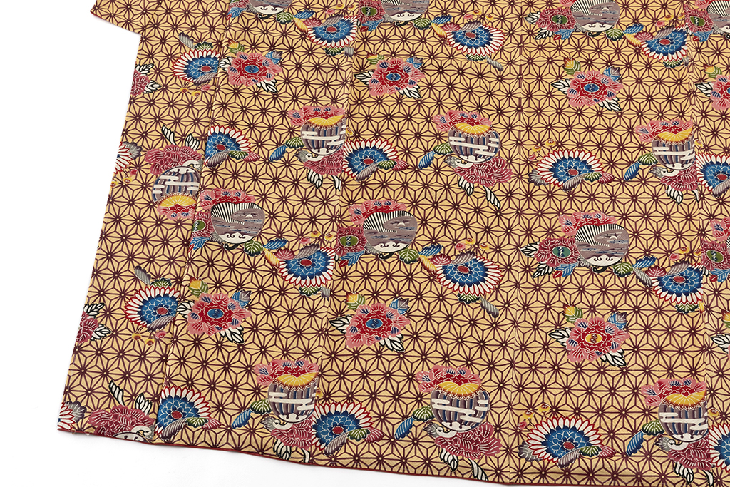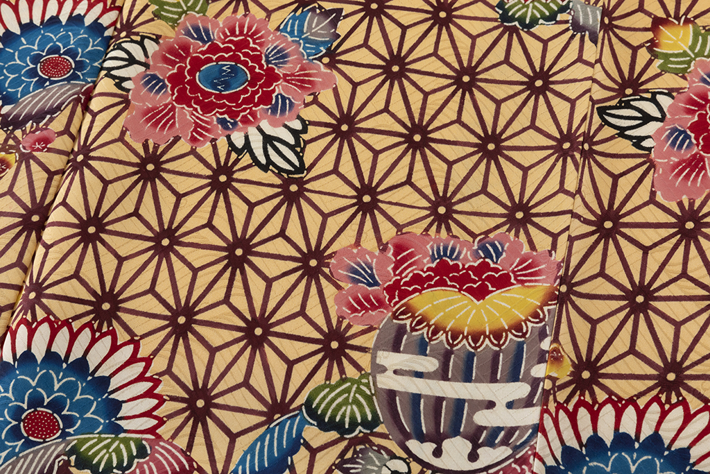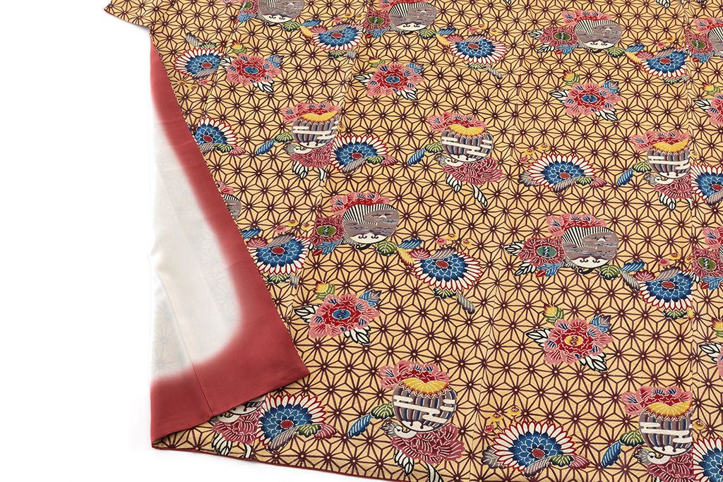 密陀僧の地に、暗紅色の麻の葉模様を描いた地に、鮮やかな色彩で牡丹や菊、柔らかな文様を紅型染めした、晴れやかな彩りが美しく華やぐ本紅型染 振袖です。