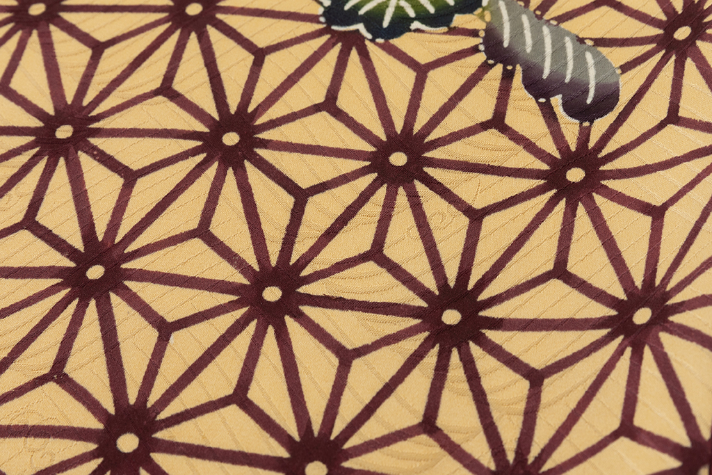 風物では桜や梅、柳、菖蒲、雪持笹、雀、蝶など、友禅や江戸小紋と同じような文様も多く、他には鶴や亀、松竹梅、鳳凰などの吉祥文もよく使われています。