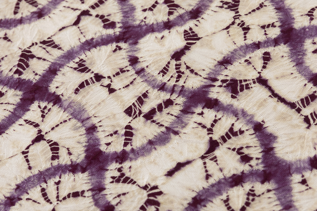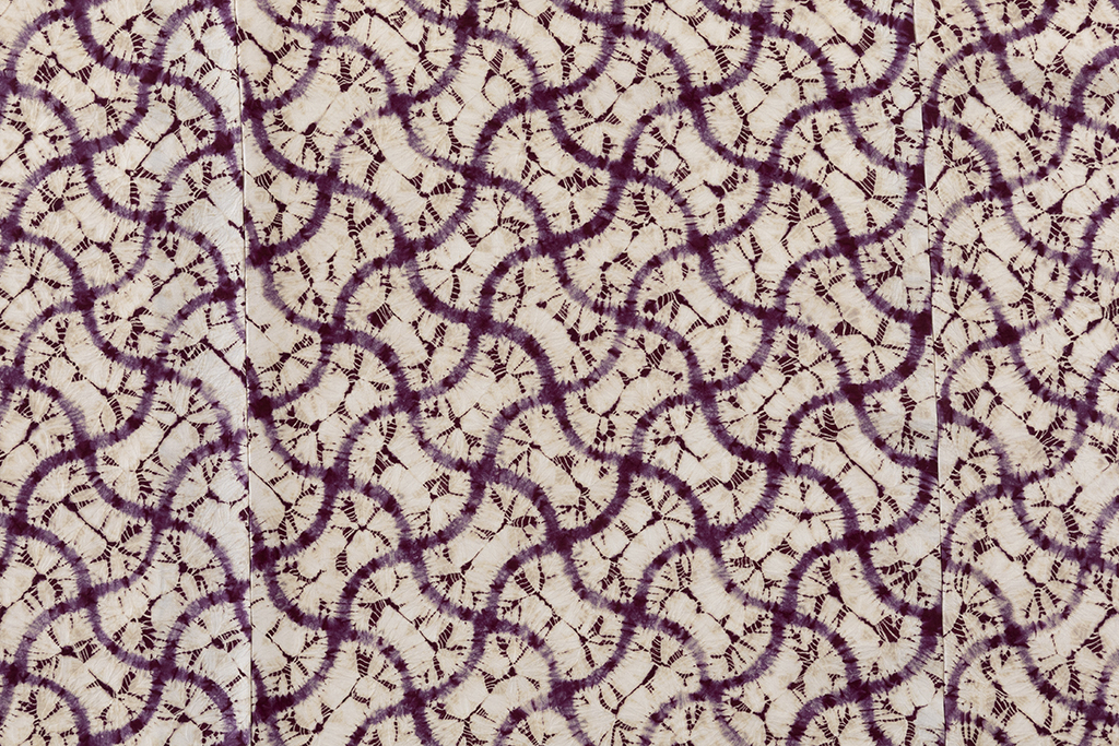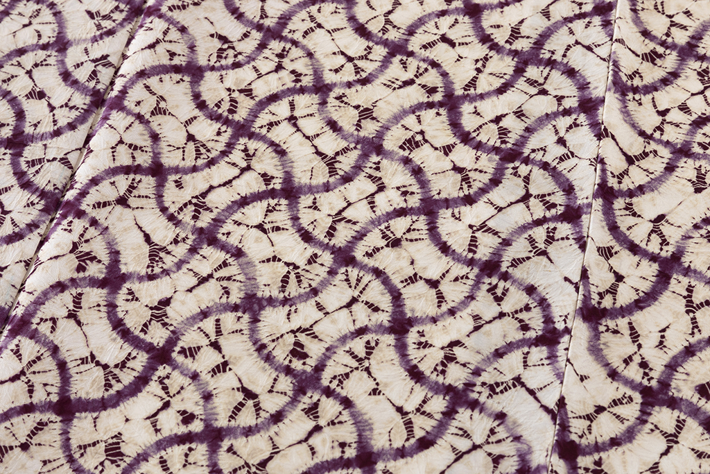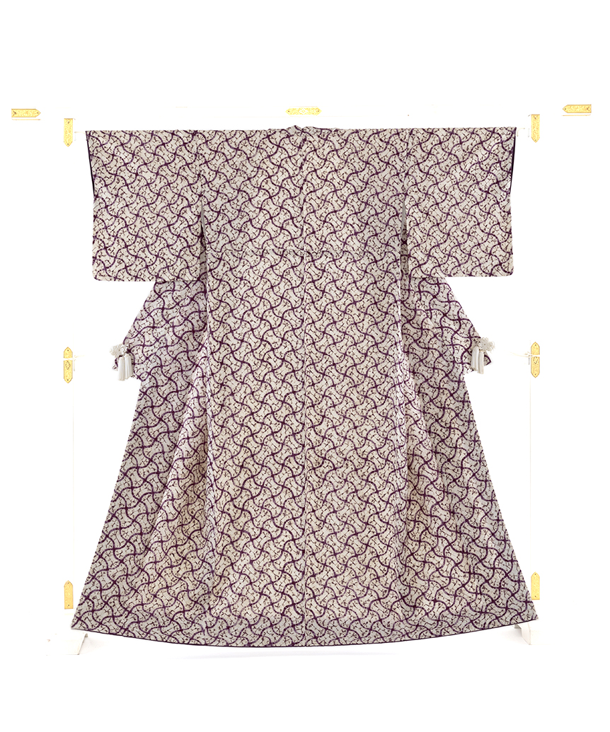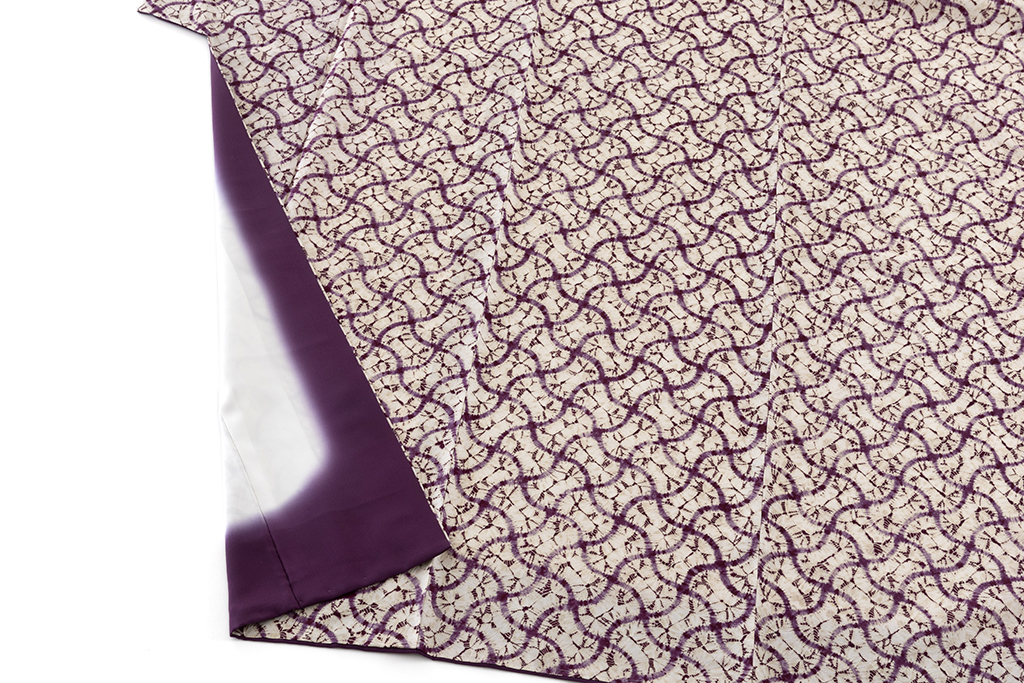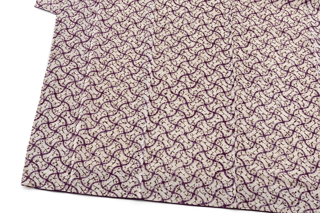味わい深い葡萄紫で、緩やかな曲線が交わる網目模様を絞り、柔らかな形を連ねた、規則的な文様を連ねたモダンな景色に、絞りの柔らかな滲みや、色彩の掠れが魅せる繊細な表情に趣を感じる、南部紫根染 紬着物です。