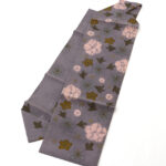 藍鼠の縮緬地に、多様な種類の可愛らしい花々をふわりと咲き開かせた、落ち着いた色彩、柔らかく朗らかな表情が愛らしさとともに、お淑やかな洒落味を感じさせる山本由季さん作 縮緬九寸名古屋帯です。