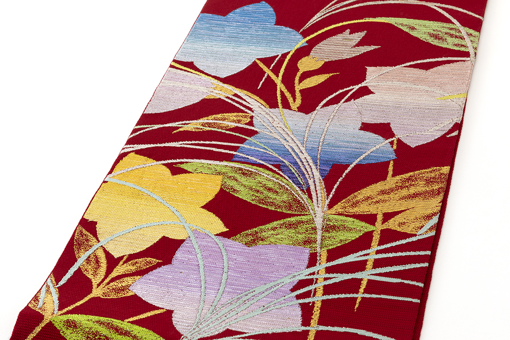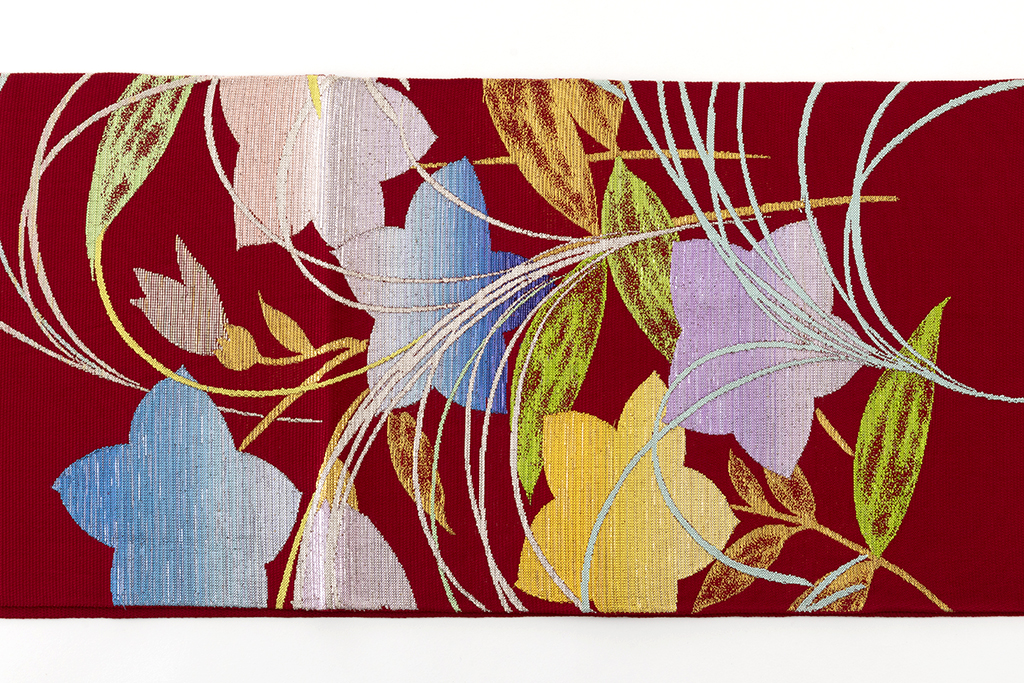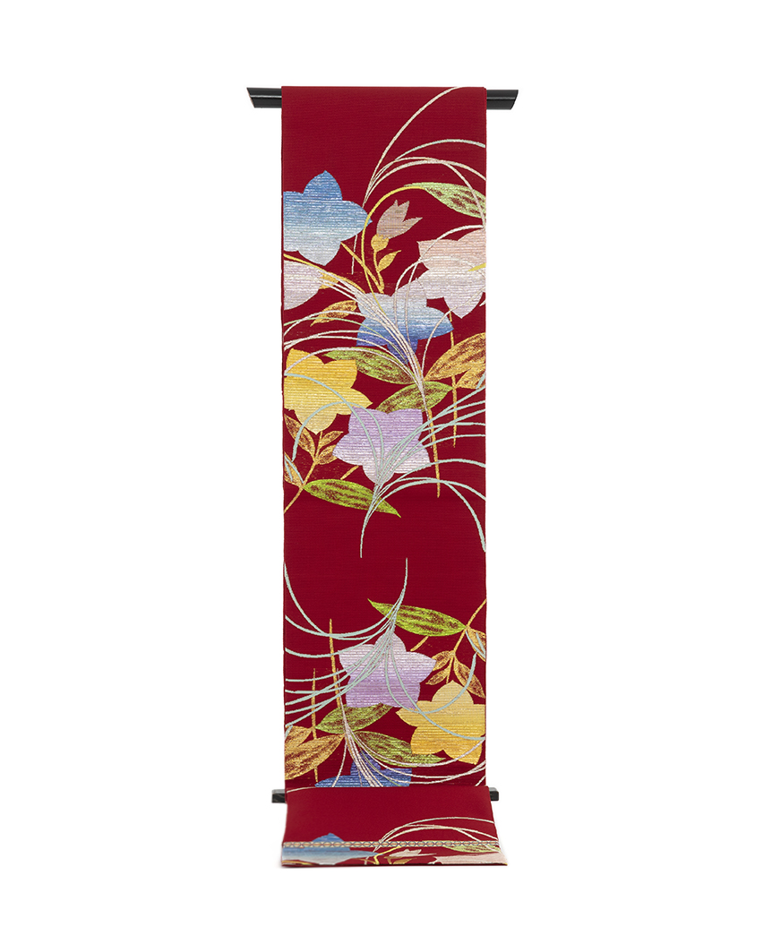 鮮やかな蘇芳色の籠目絽の地に、煌めく色糸で瑞々しく咲き開く桔梗を大胆に織り出した、麗しい色彩に大胆な意匠が、華やかな女性美を際立たせる龍村平蔵製 夏袋帯 「桔梗尾花」です。