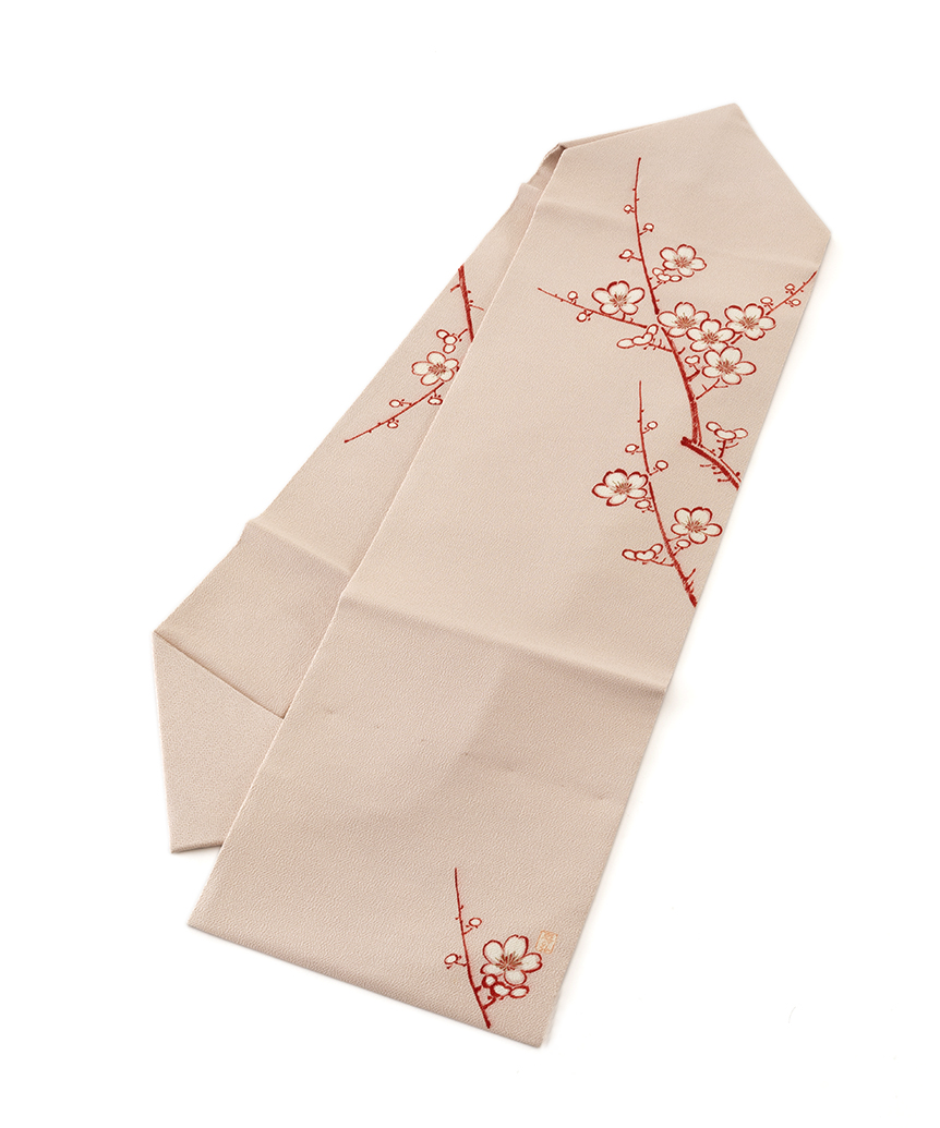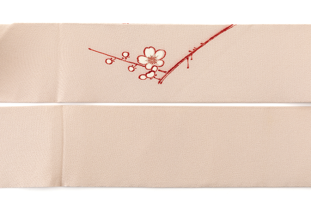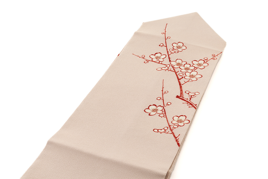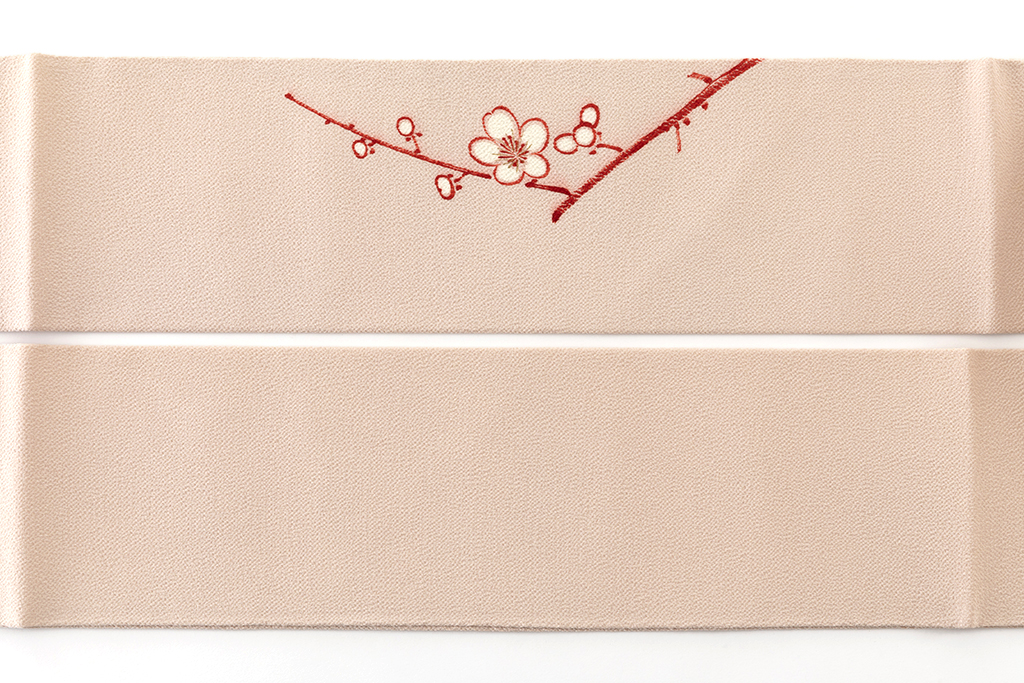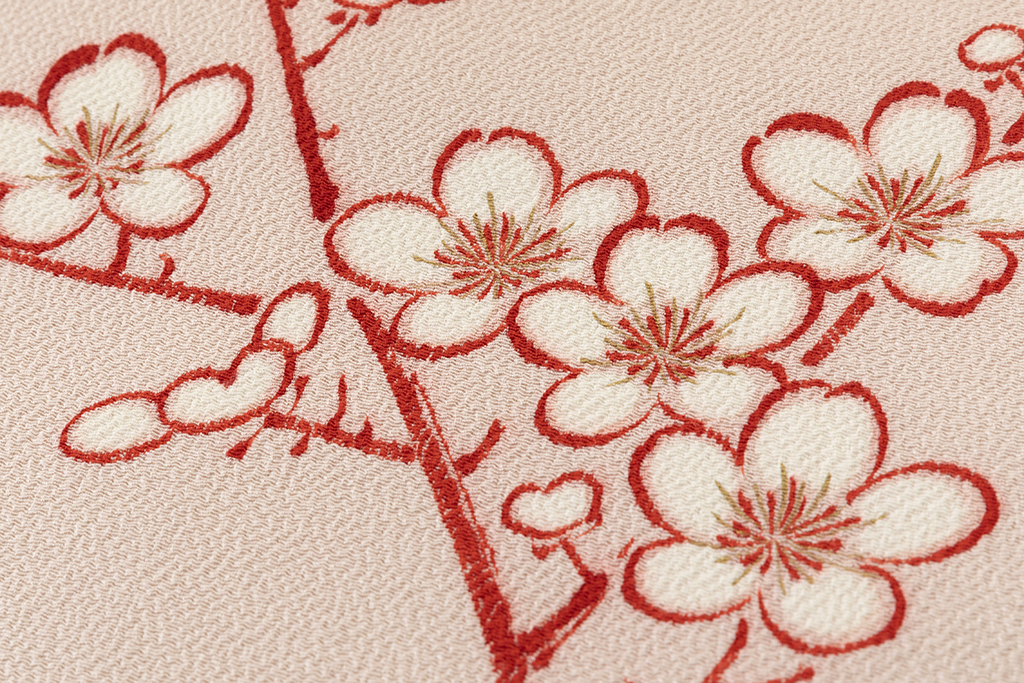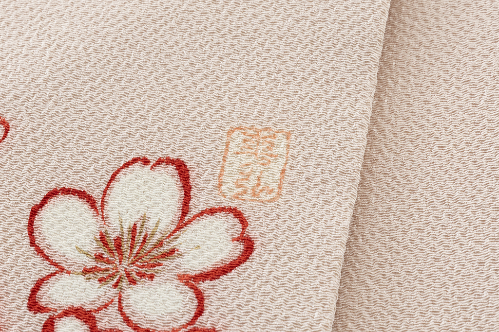 乙女色の縮緬地に、鮮やかな辰砂で可憐な花を咲かせた梅の木を描いた、美しい華やぎとともに感じる愛らしさが、品のある装いを引き立てる人間国宝 森口華弘さん作 縮緬九寸名古屋帯です。