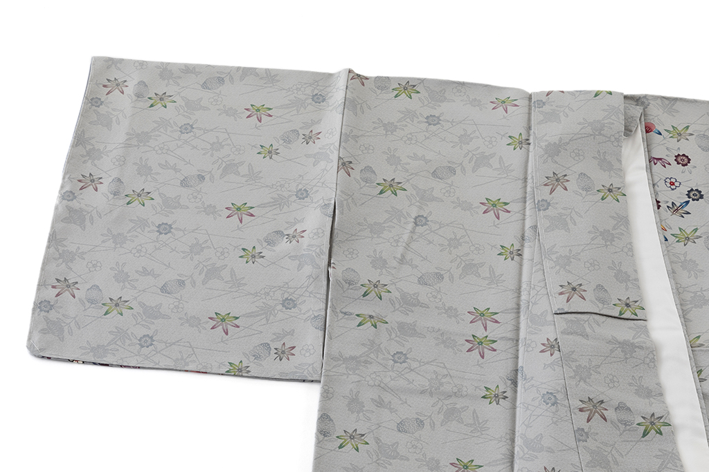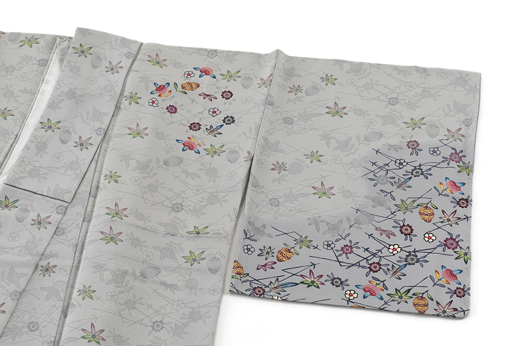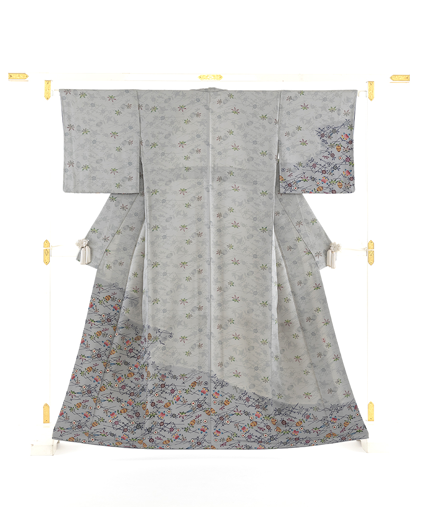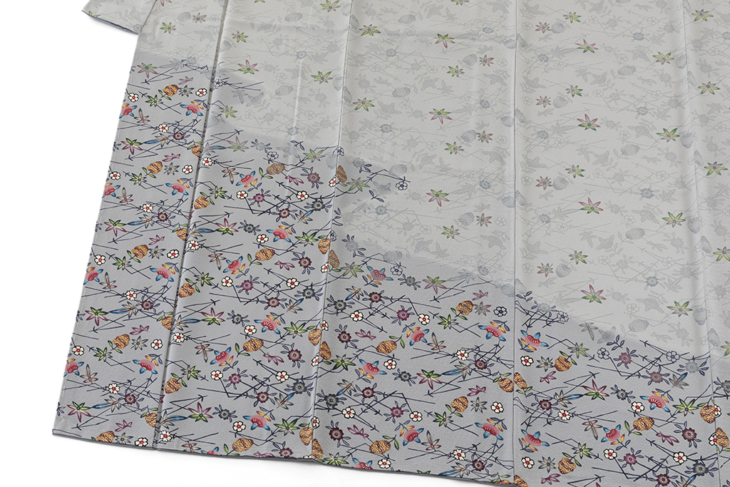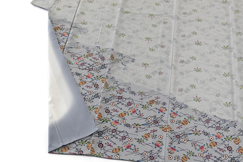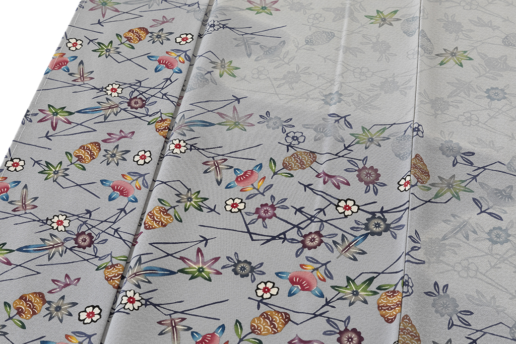 地紋の入った空色鼠と水銀色の裾濃暈しの地に、散りゆく松葉とともに、鮮やかな色調で橘や梅、松毬や楓などを描いた、穏やかな地風に色彩豊かな彩りが、品の良い美しさを引き立てる日本工芸会正会員 城間栄順さん作 本紅型染 訪問着です。